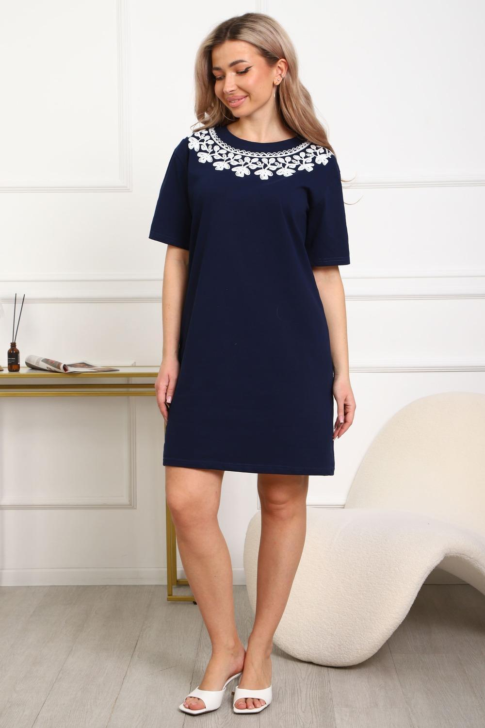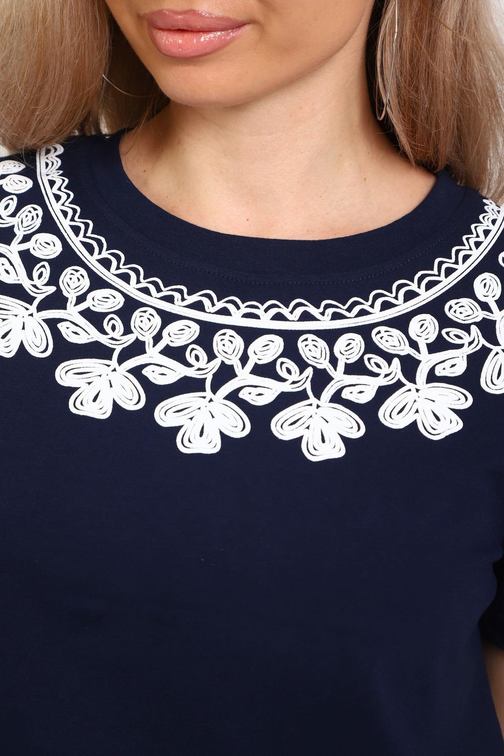 Туника женская прямого силуэта. Низ изделия прямой. Длинна выше колена, плечо спущенное, рукав короткий. Горловина круглой формы, обработана планкой с отделочной строчкой. Принт (шелкография пуф) в виде кружевного воротника.
