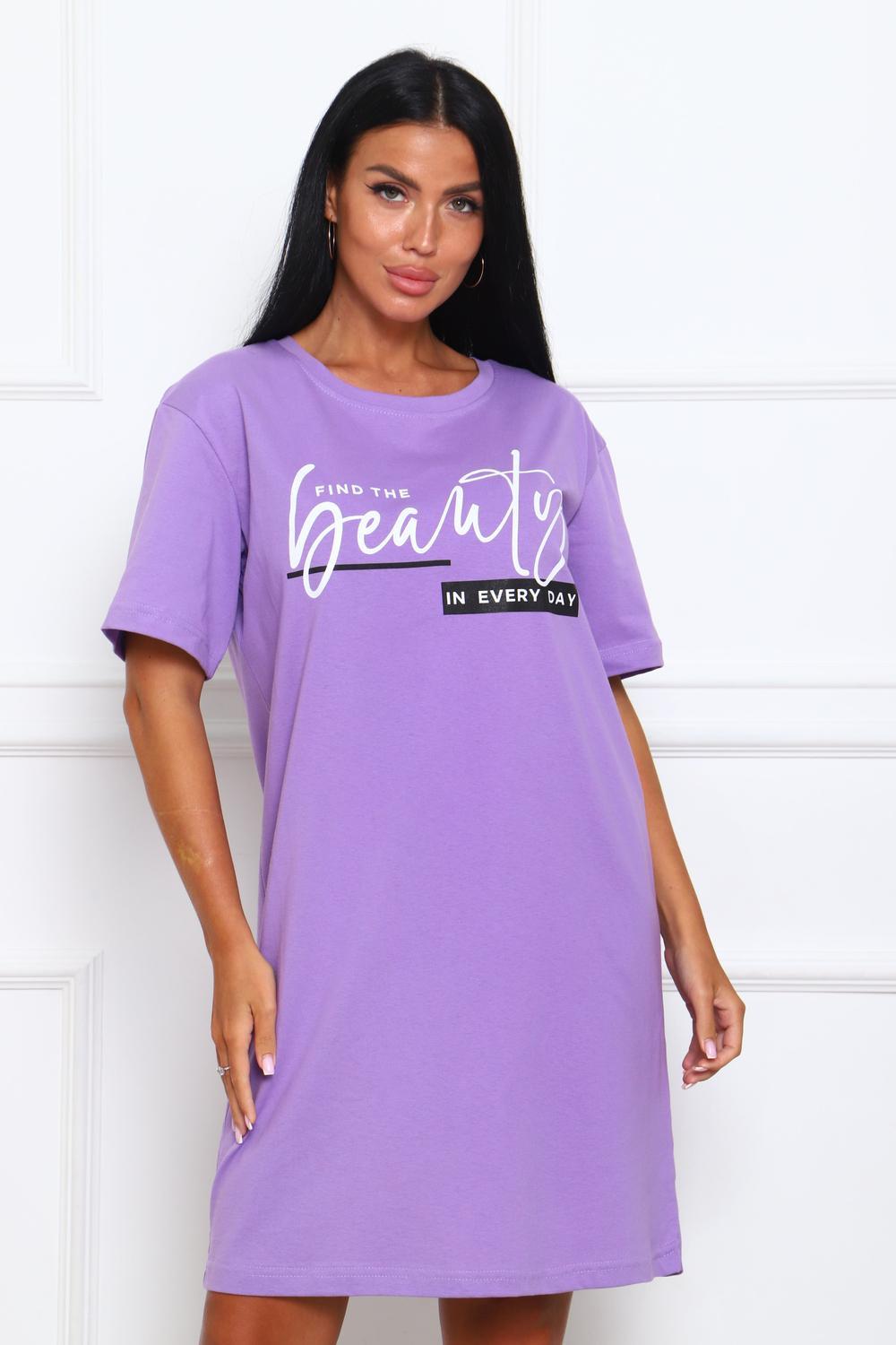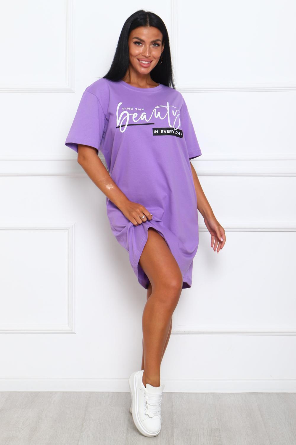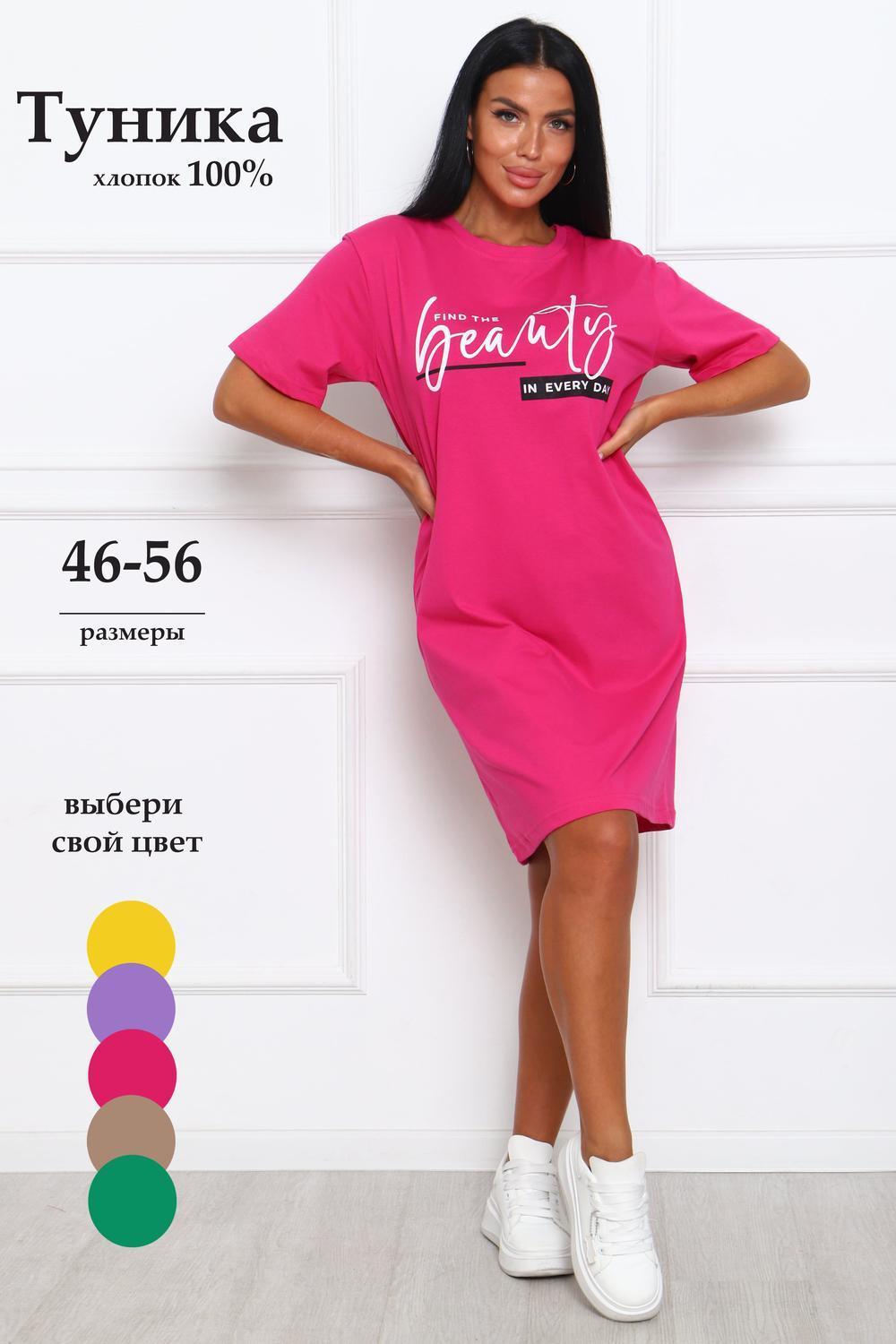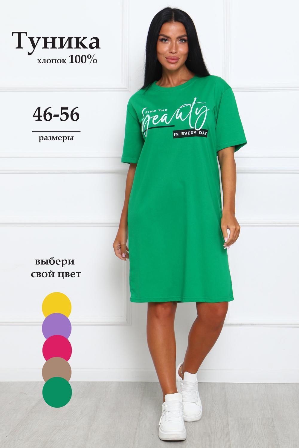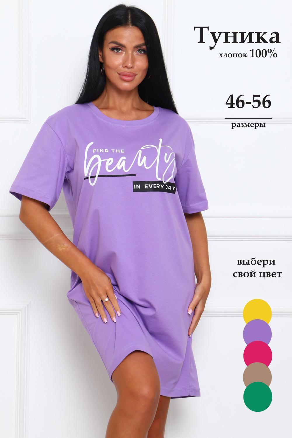 Туника женская прямого силуэта. Низ изделия прямой. Длинна выше колена, плечо спущенное, рукав короткий. Горловина круглой формы, обработана планкой с отделочной строчкой по шву притачивания. Принт (шелкография) располагается по центру переда.