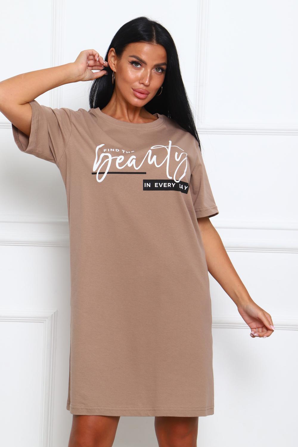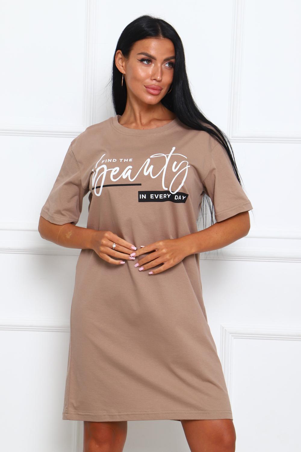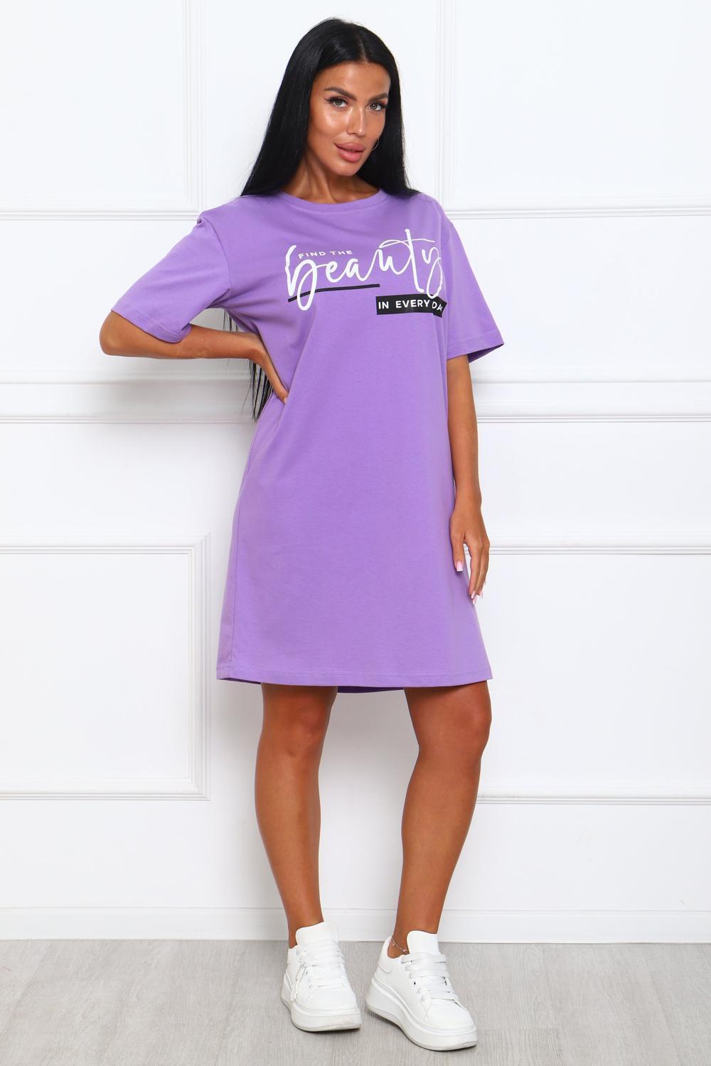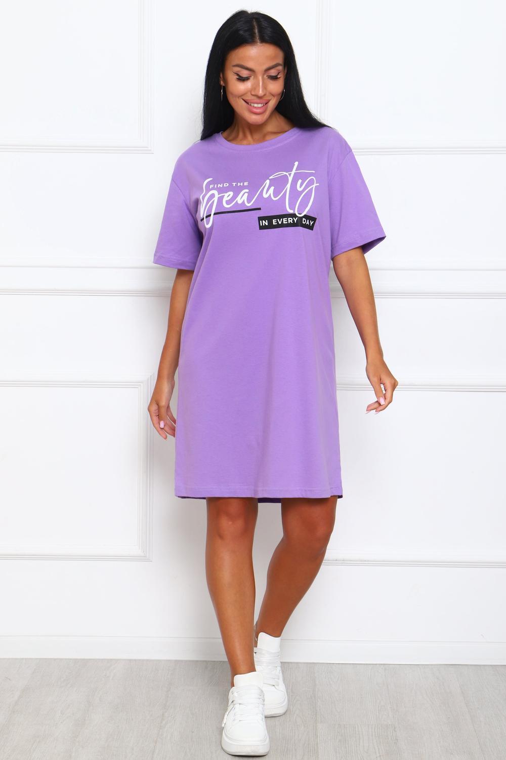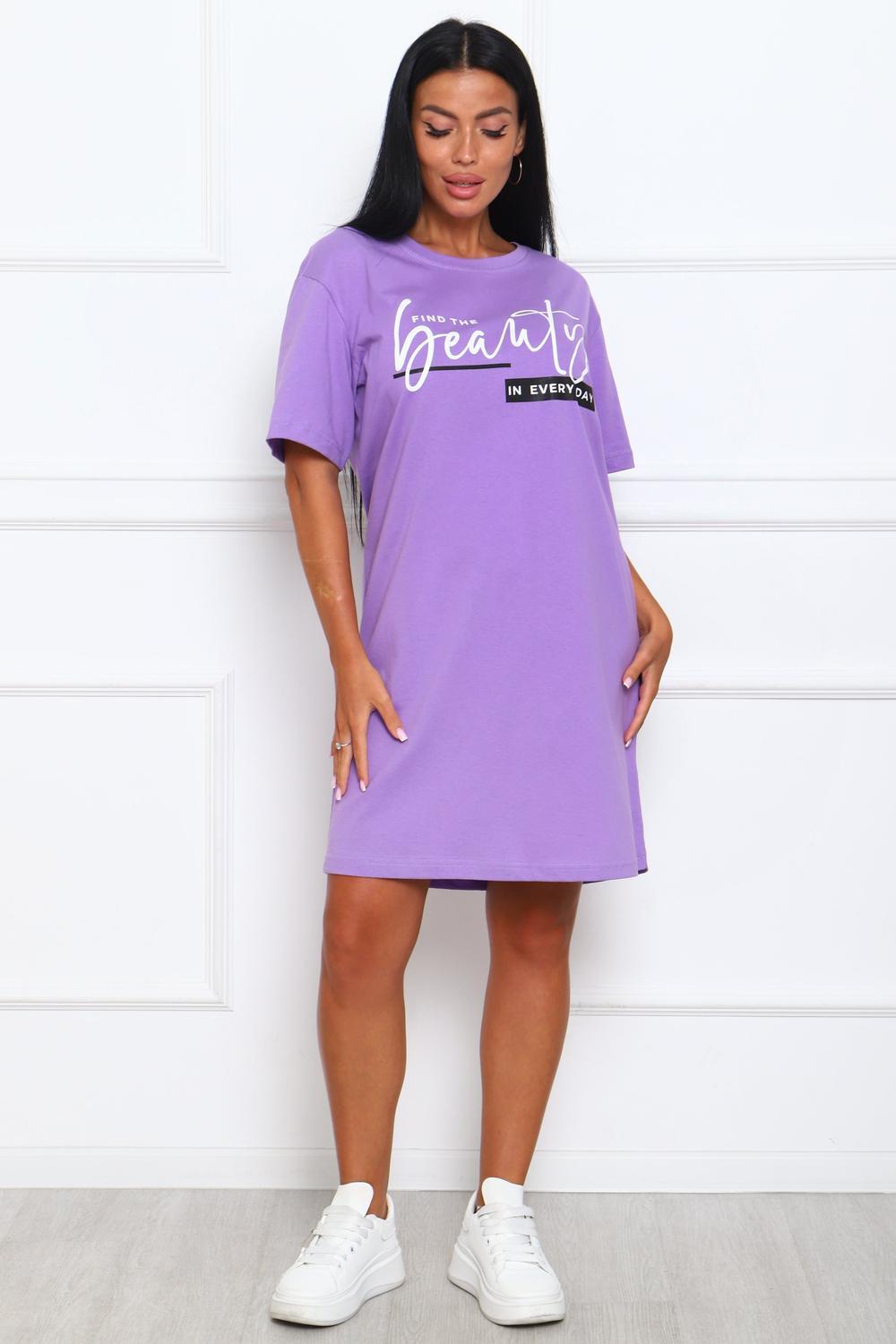 Туника женская прямого силуэта. Низ изделия прямой. Длинна выше колена, плечо спущенное, рукав короткий. Горловина круглой формы, обработана планкой с отделочной строчкой по шву притачивания. Принт (шелкография) располагается по центру переда.