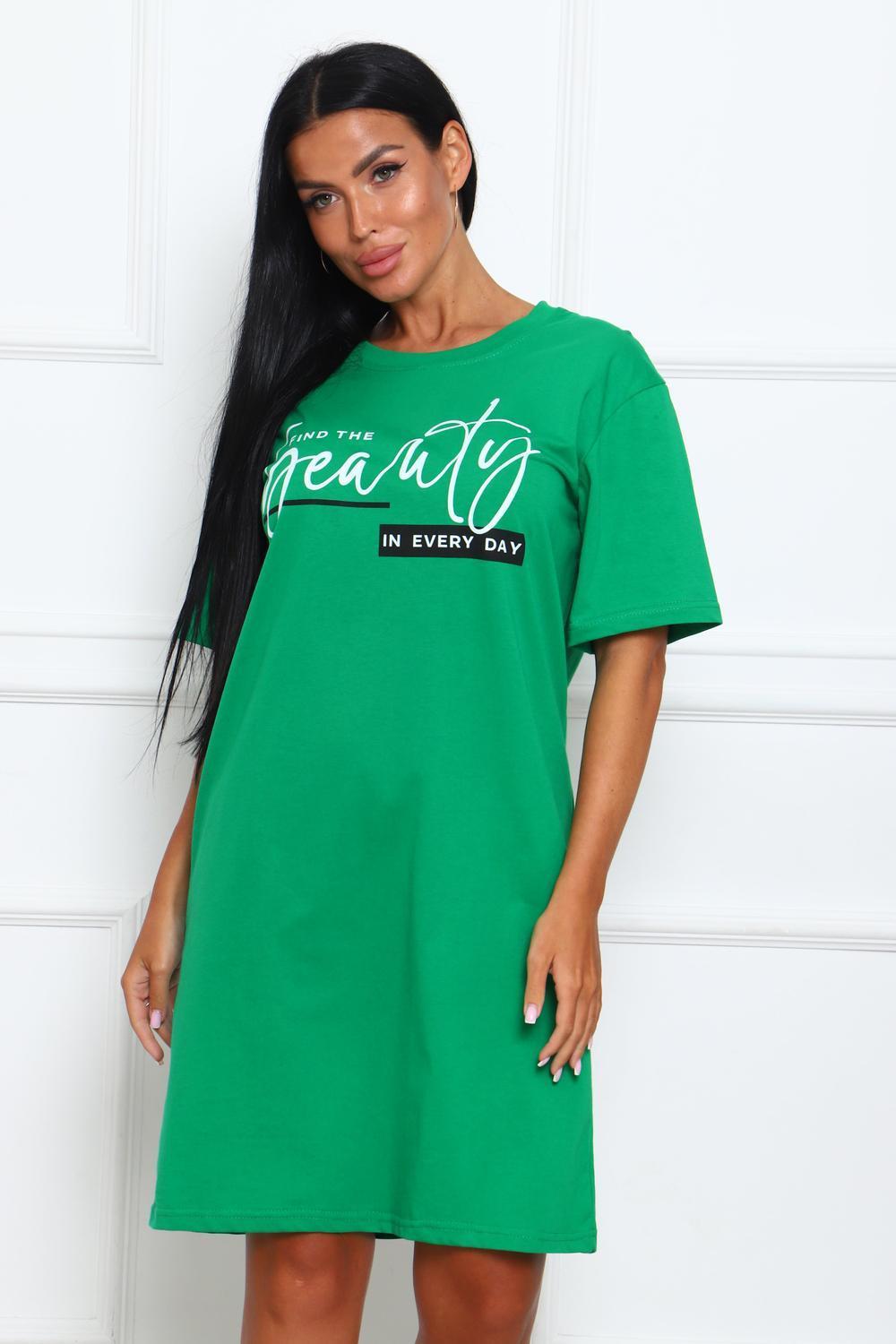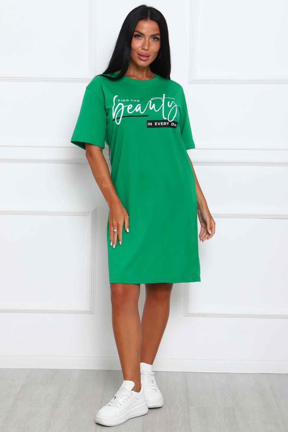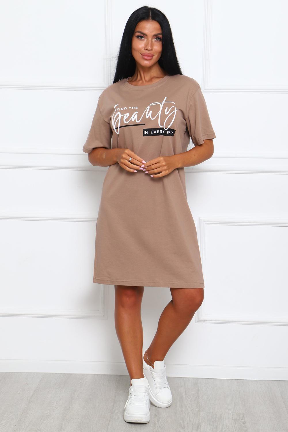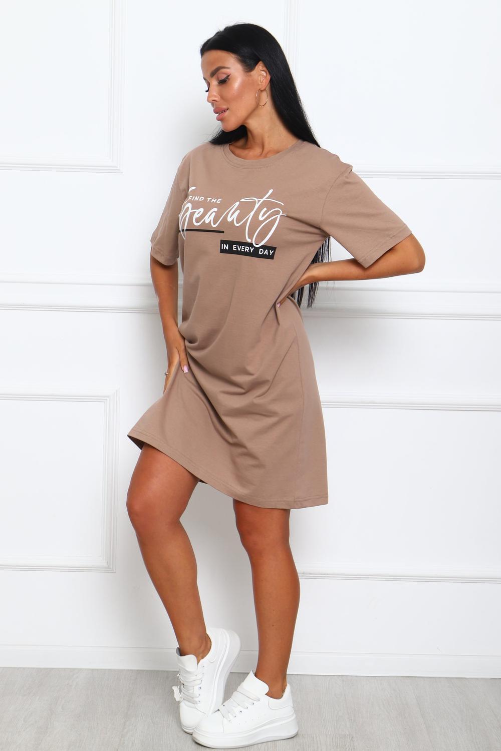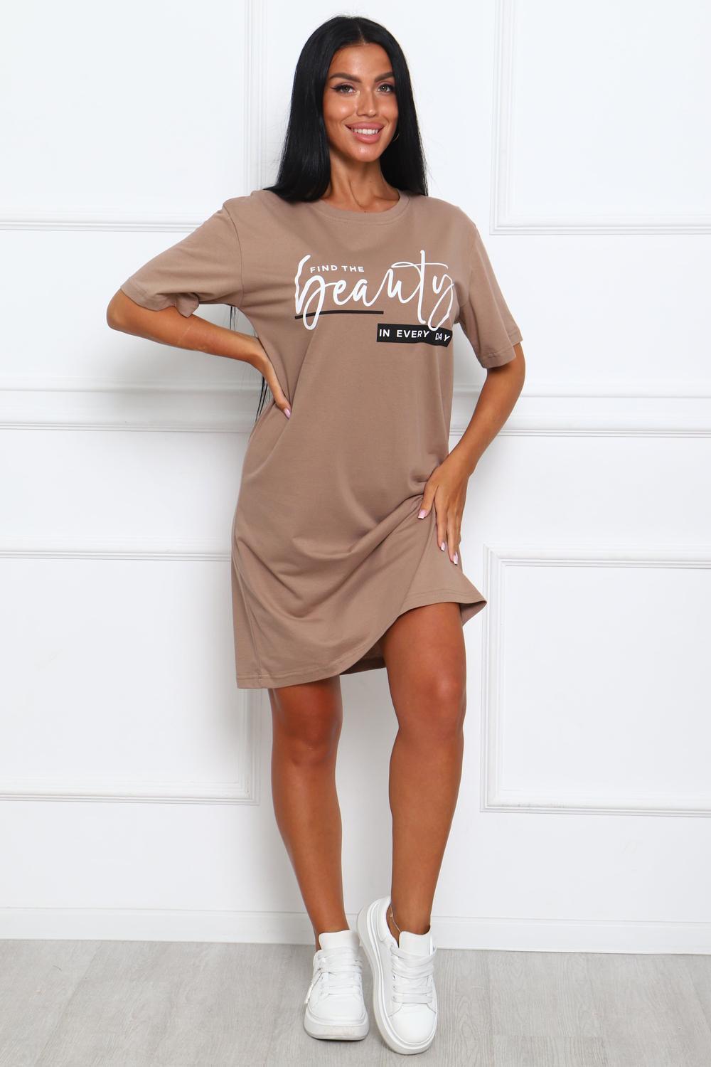 Туника женская прямого силуэта. Низ изделия прямой. Длинна выше колена, плечо спущенное, рукав короткий. Горловина круглой формы, обработана планкой с отделочной строчкой по шву притачивания. Принт (шелкография) располагается по центру переда.