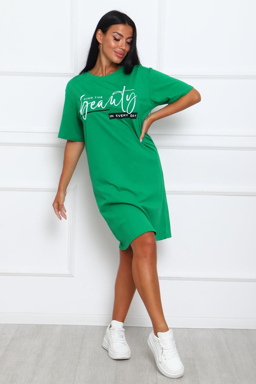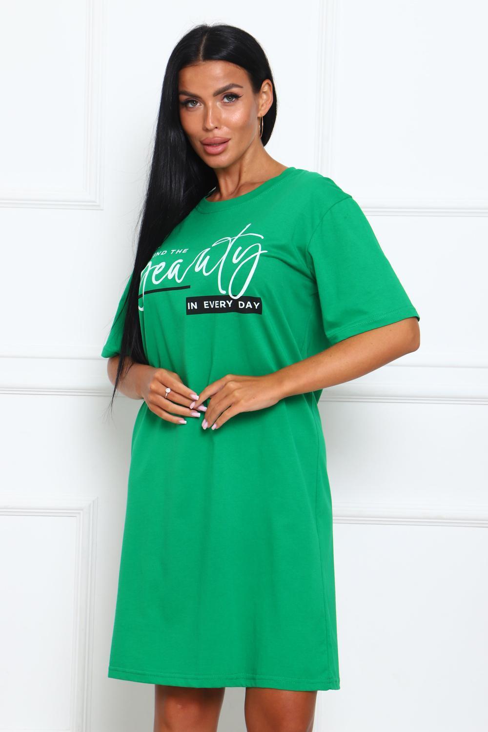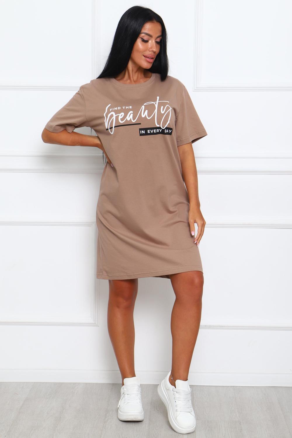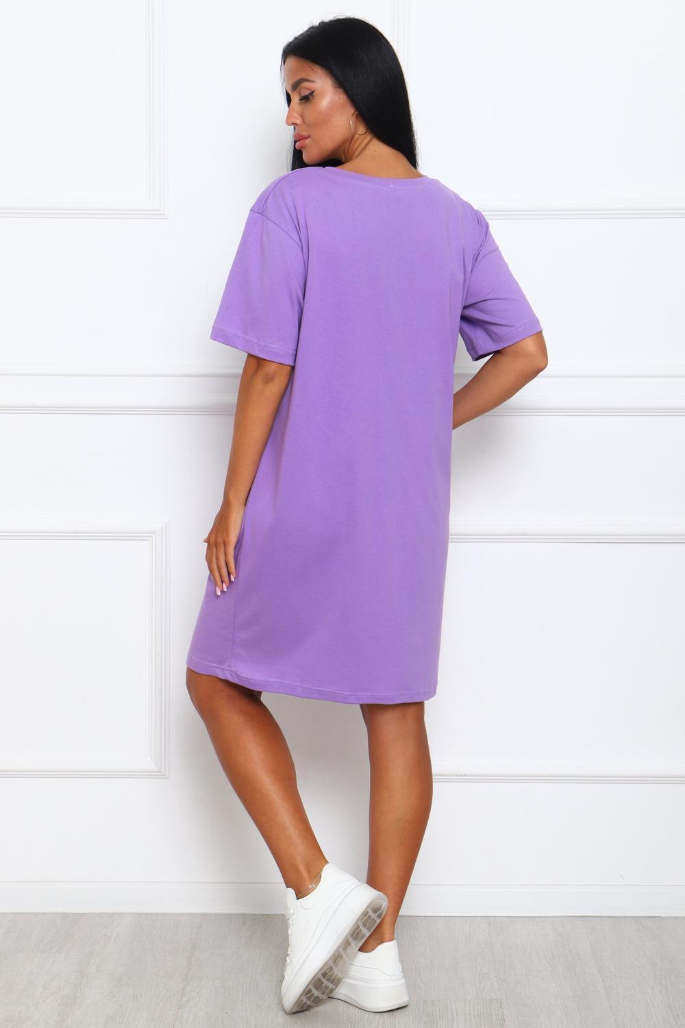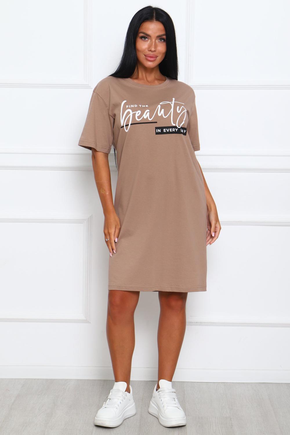 Туника женская прямого силуэта. Низ изделия прямой. Длинна выше колена, плечо спущенное, рукав короткий. Горловина круглой формы, обработана планкой с отделочной строчкой по шву притачивания. Принт (шелкография) располагается по центру переда.