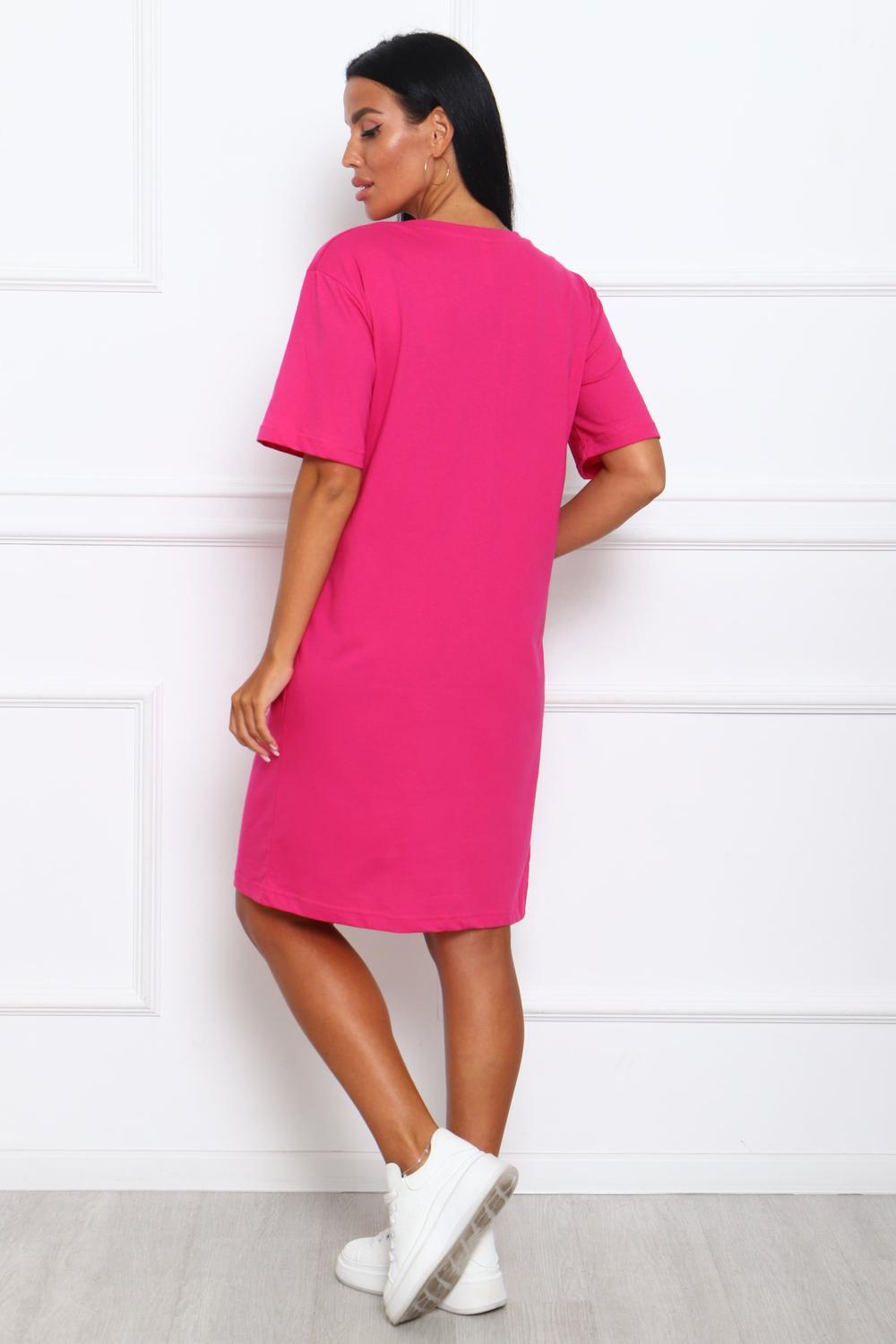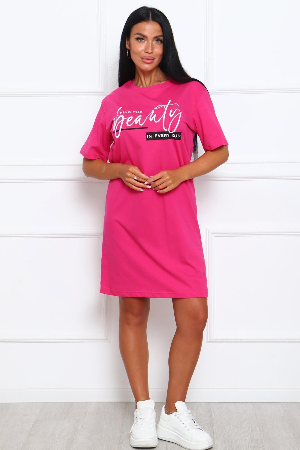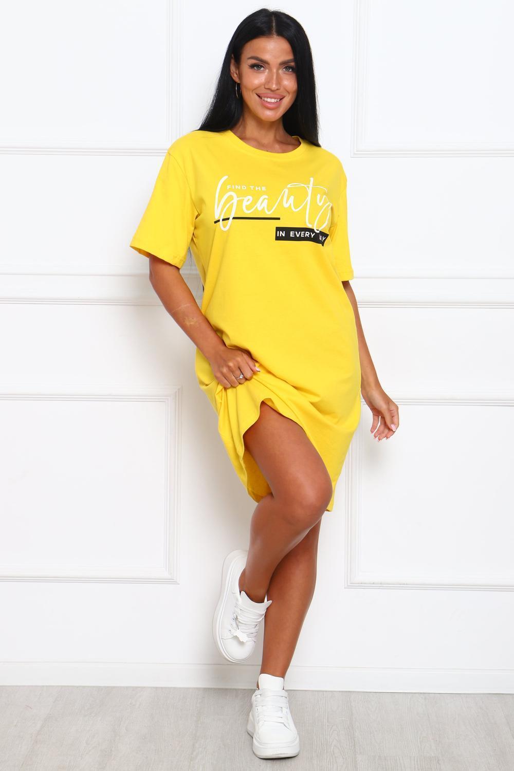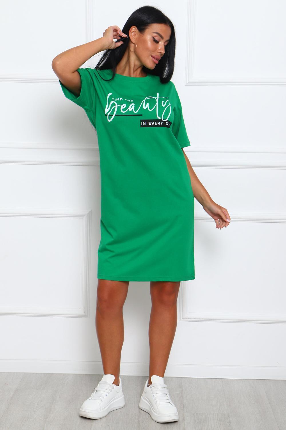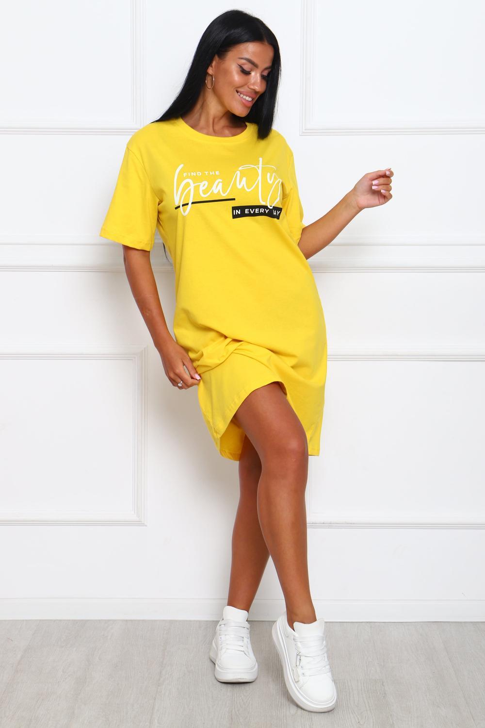 Туника женская прямого силуэта. Низ изделия прямой. Длинна выше колена, плечо спущенное, рукав короткий. Горловина круглой формы, обработана планкой с отделочной строчкой по шву притачивания. Принт (шелкография) располагается по центру переда.
