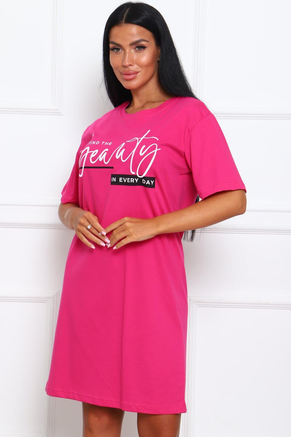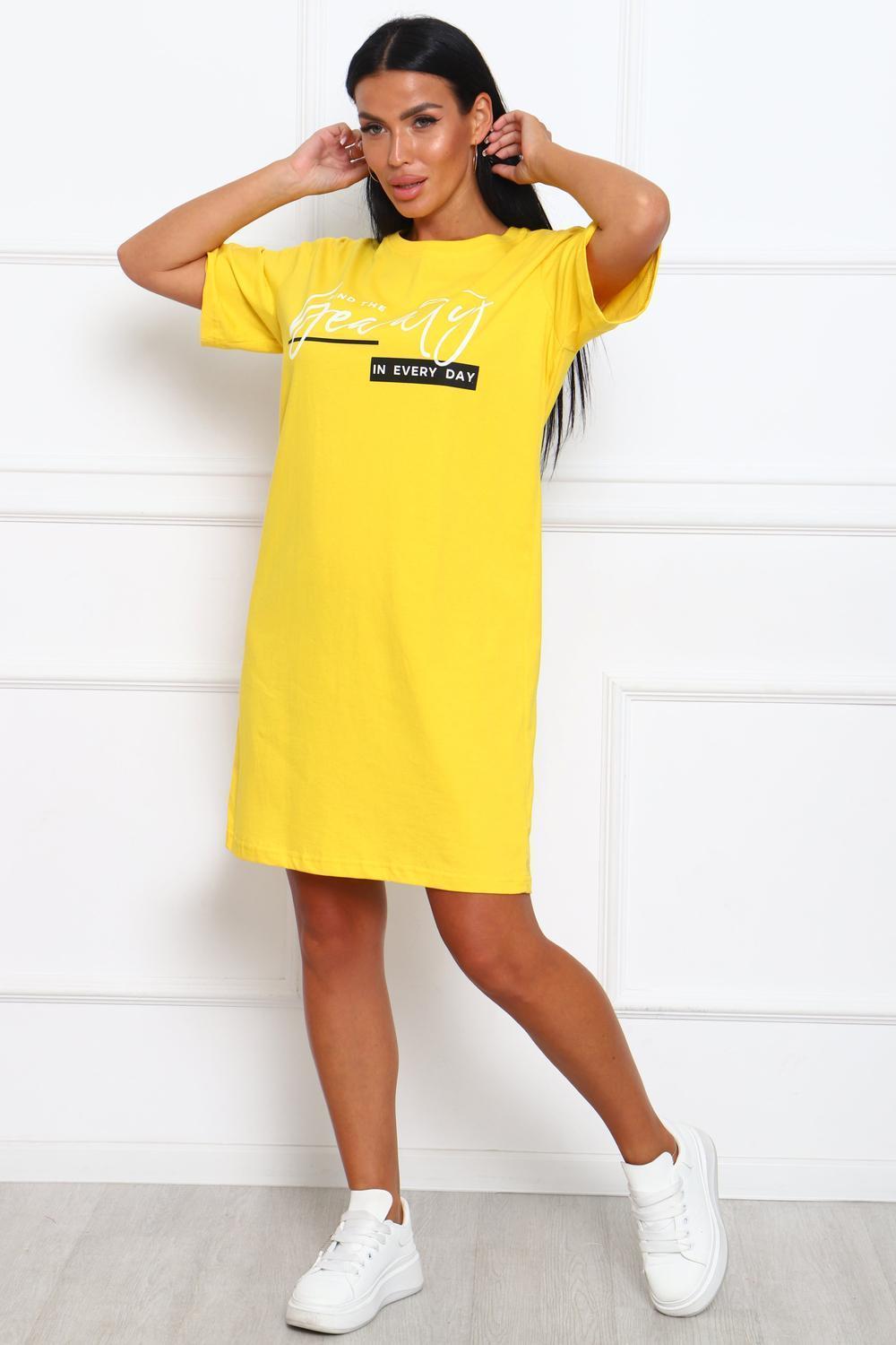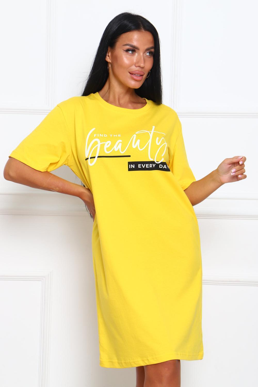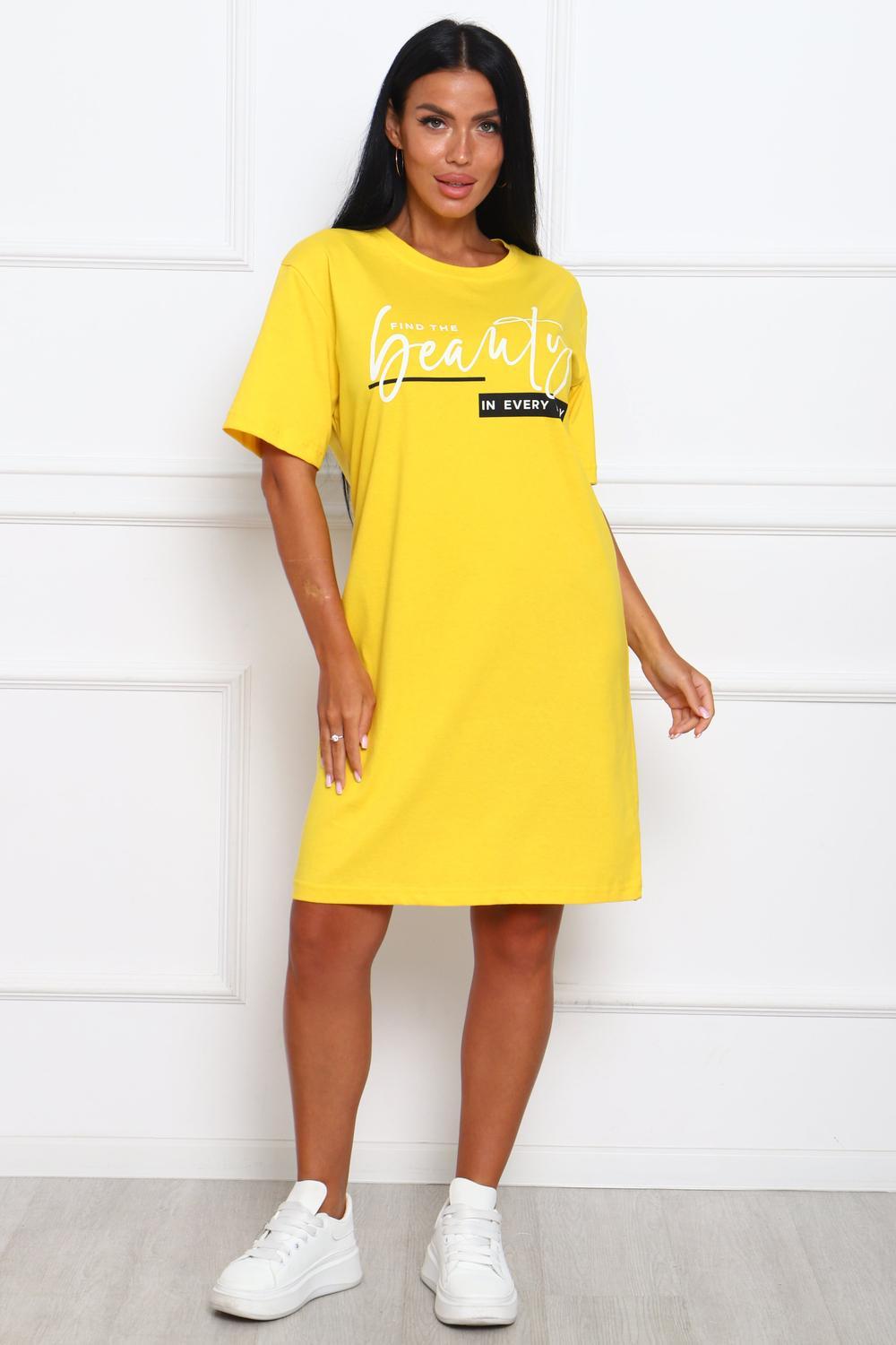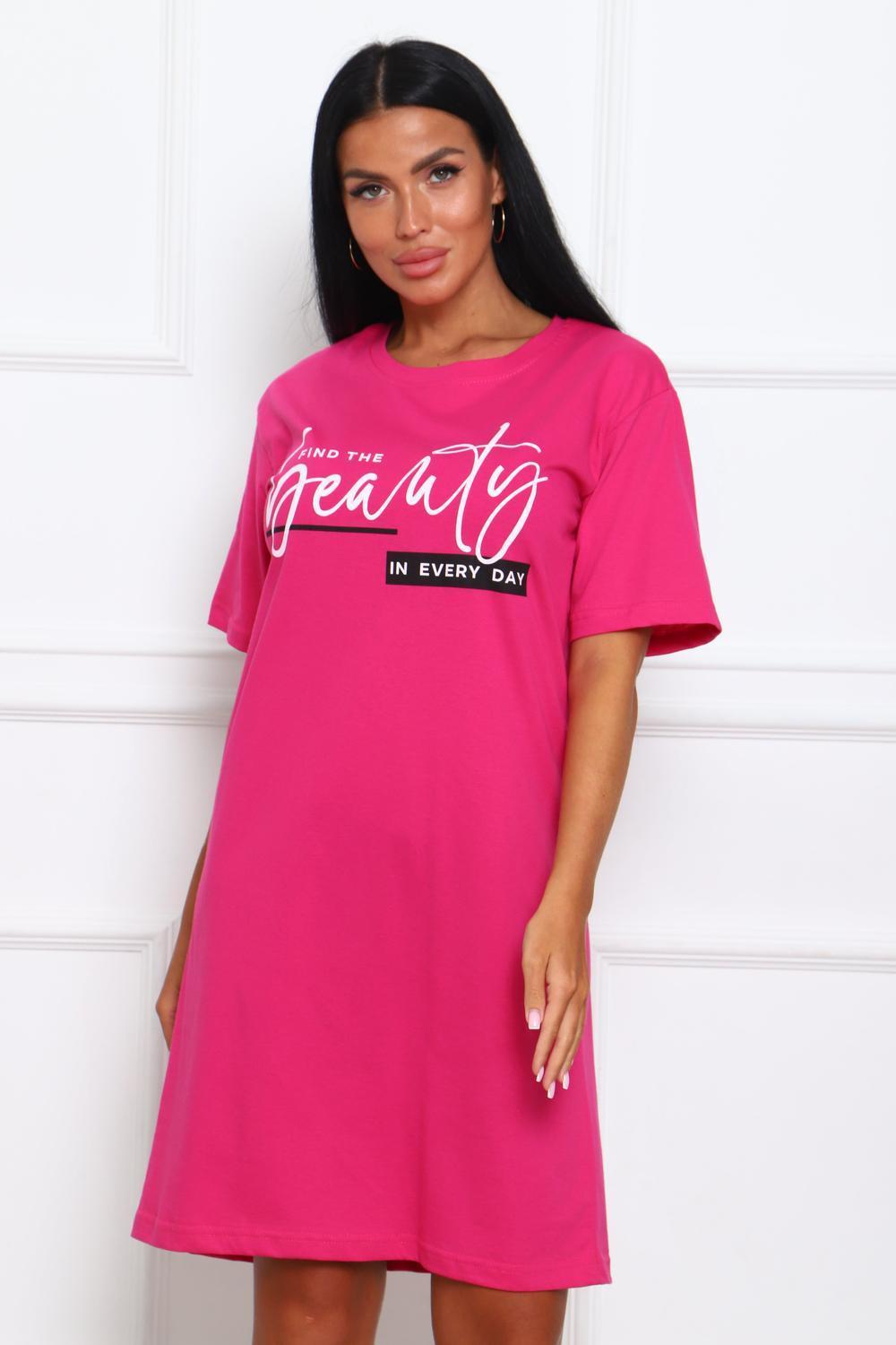 Туника женская прямого силуэта. Низ изделия прямой. Длинна выше колена, плечо спущенное, рукав короткий. Горловина круглой формы, обработана планкой с отделочной строчкой по шву притачивания. Принт (шелкография) располагается по центру переда.