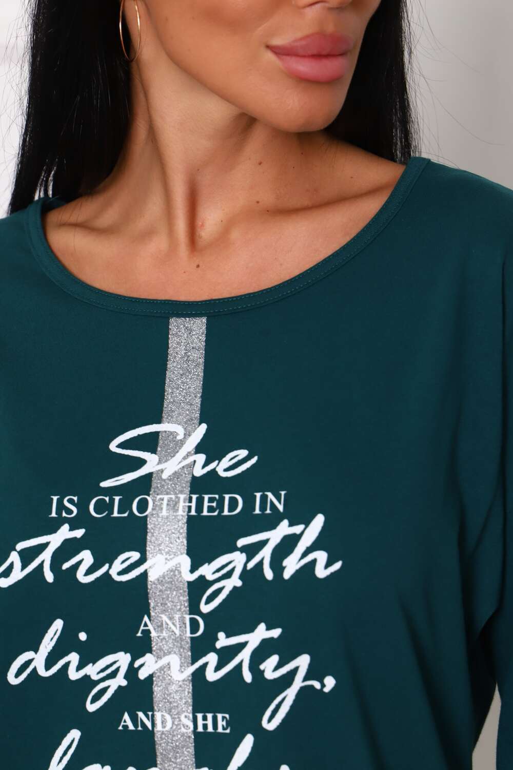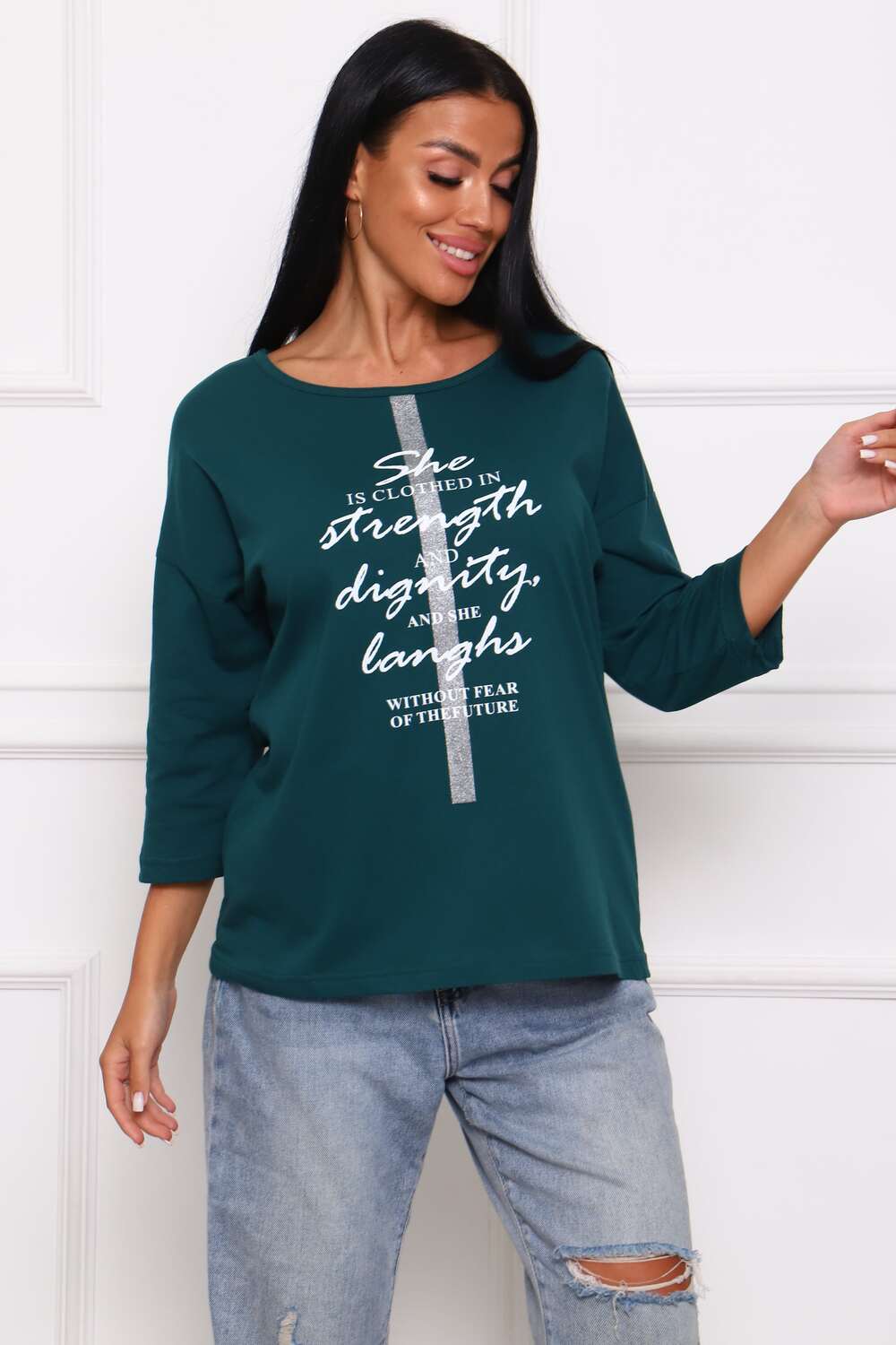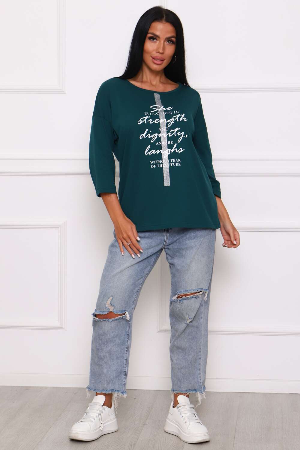 Туника женская. Ткань кулирка, хлопок 100%. Крой свободный, горловина круглой формы, обработана окантовкой. Линия плеч спущена. Длинна рукава 3/4, со швом по локтю. Низ изделия прямой. На полочке принт, шелкография.