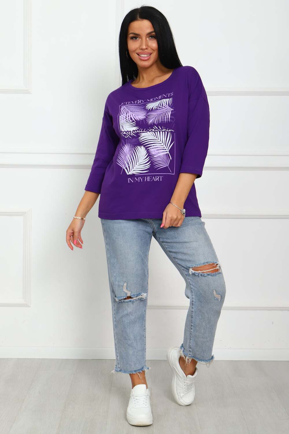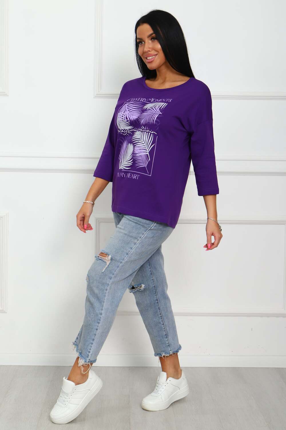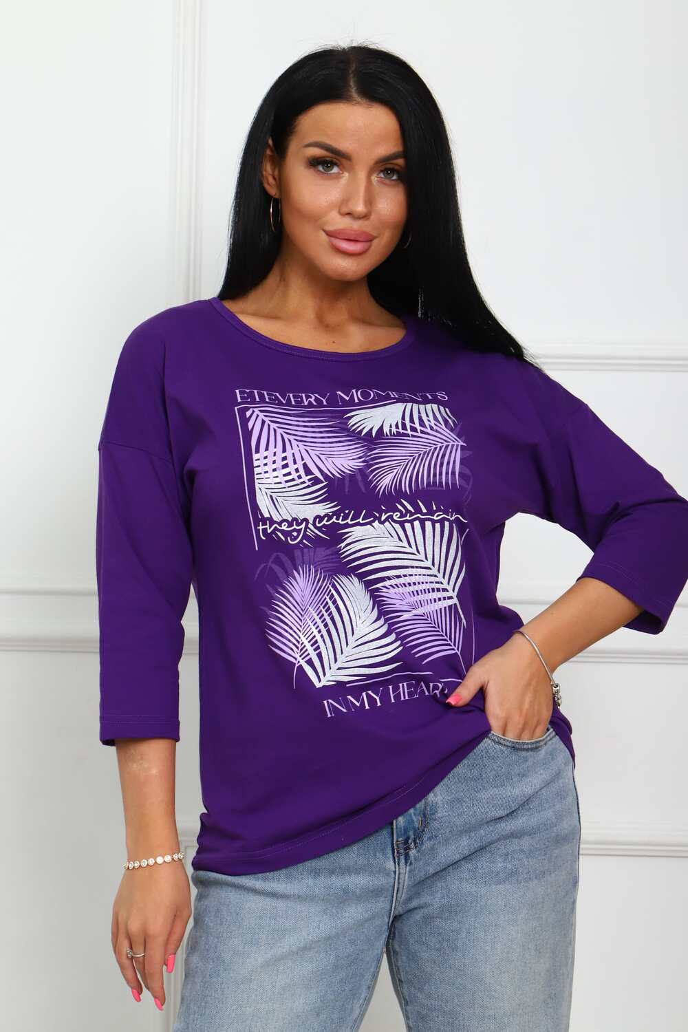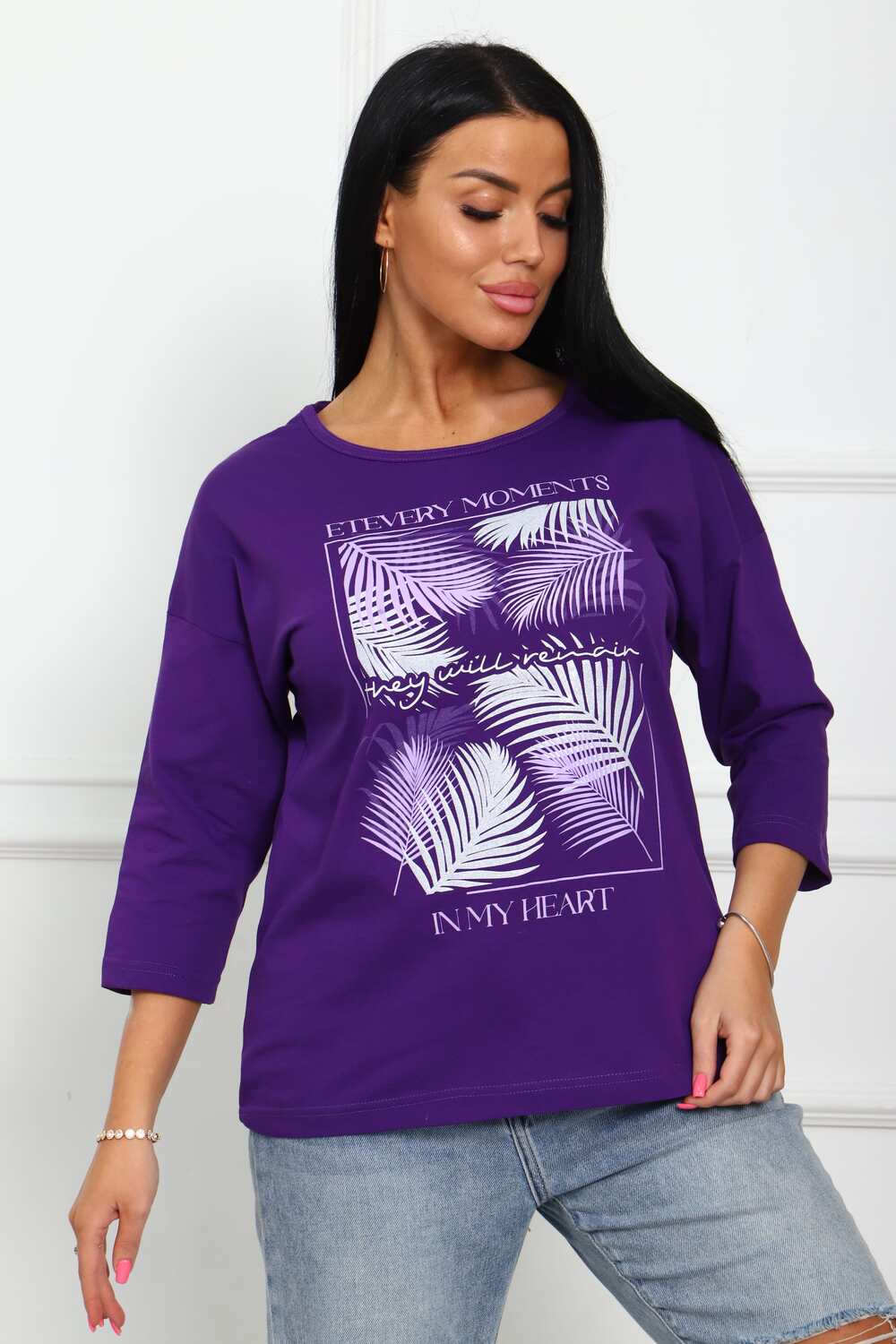 Туника женская. Ткань кулирка, хлопок 100%. Крой свободный, горловина круглой формы, обработана окантовкой. Линия плеч спущена. Длинна рукава 3/4, со швом по локтю. Низ изделия прямой. На полочке принт, шелкография.