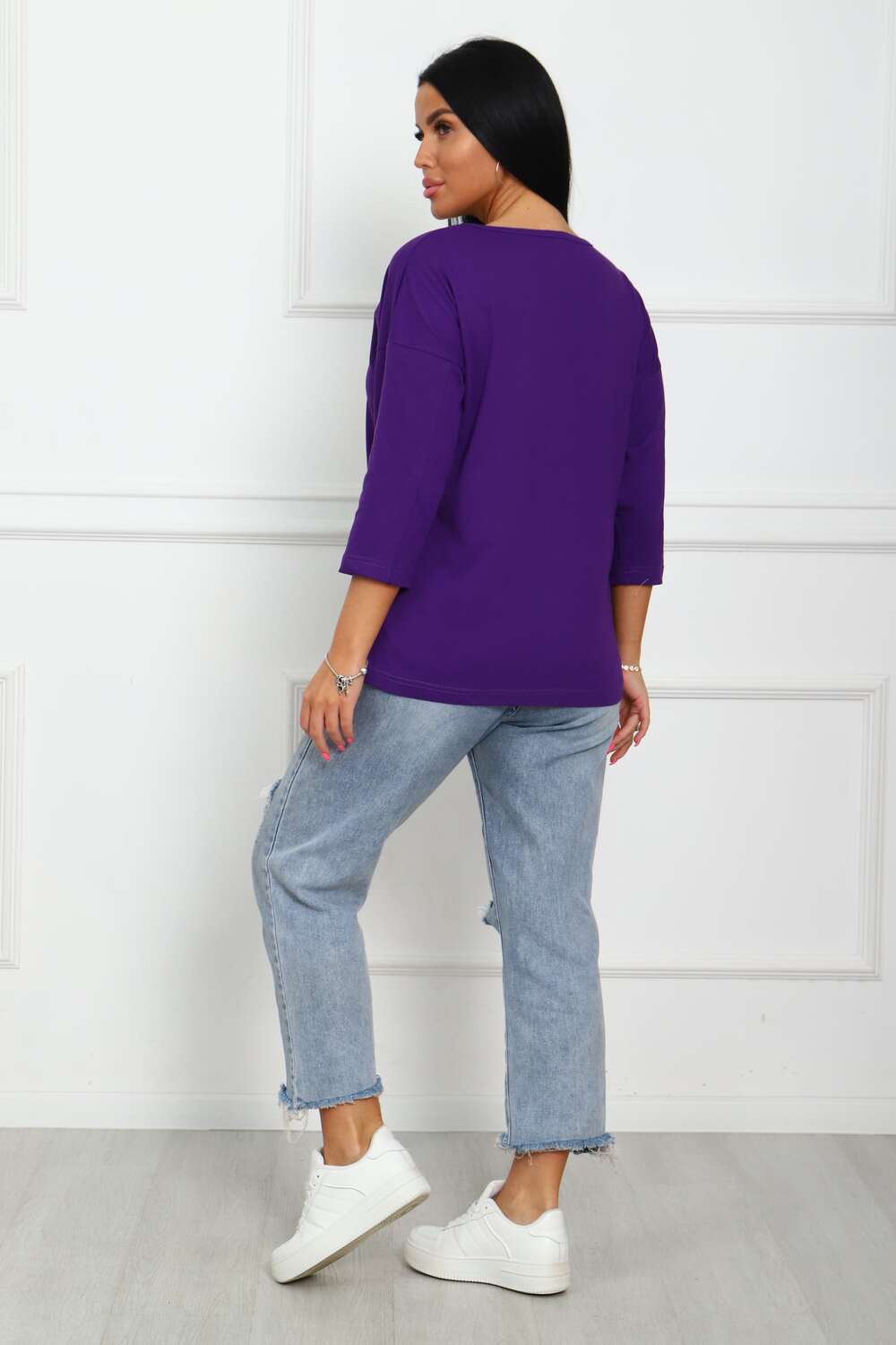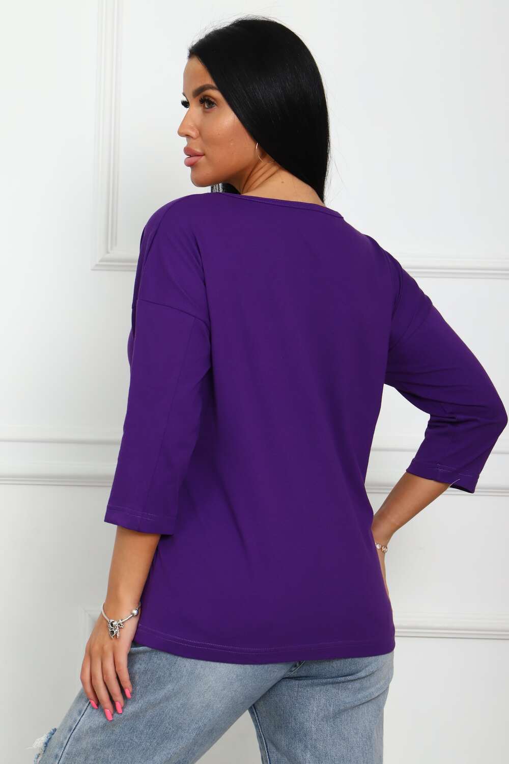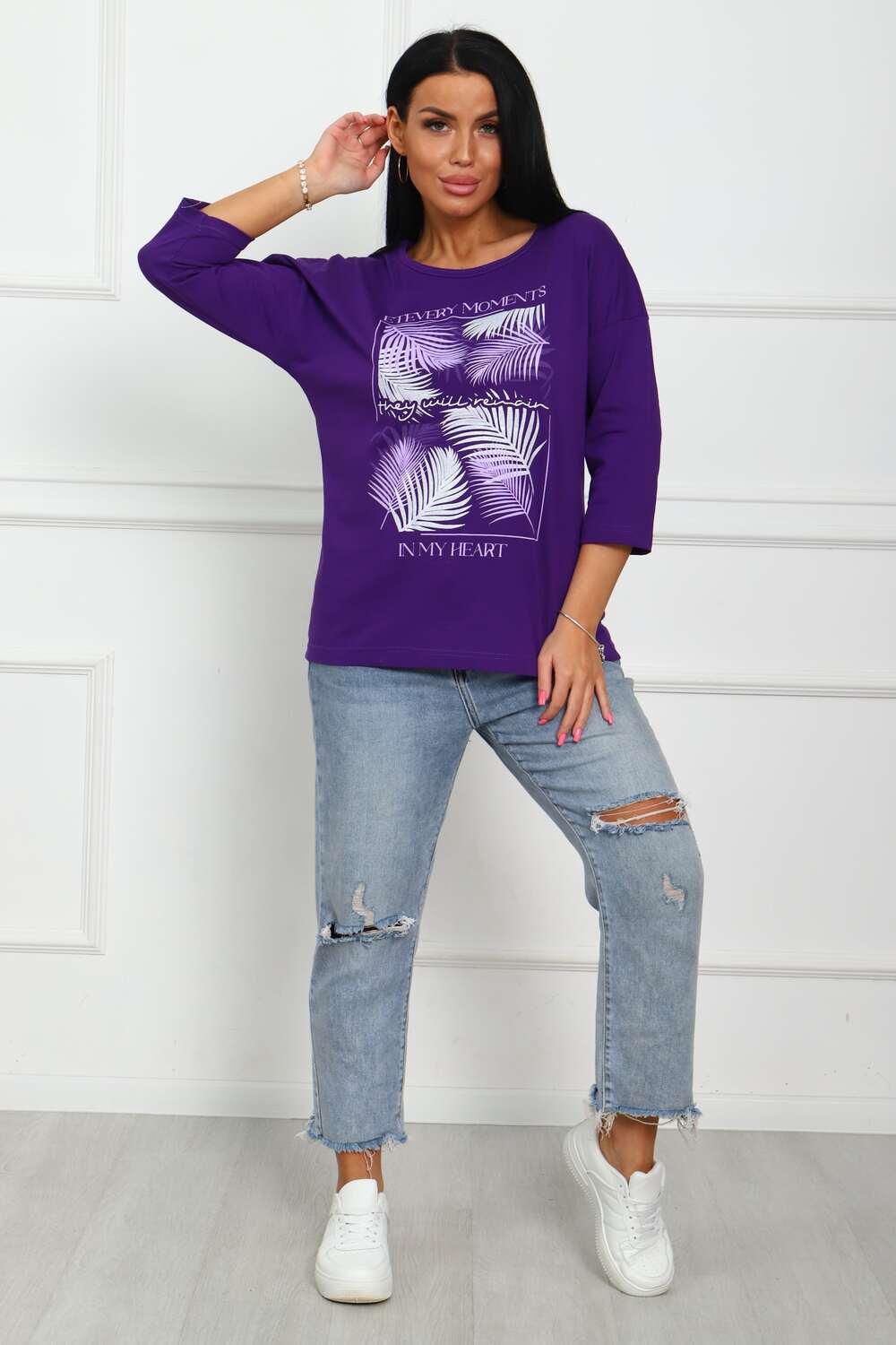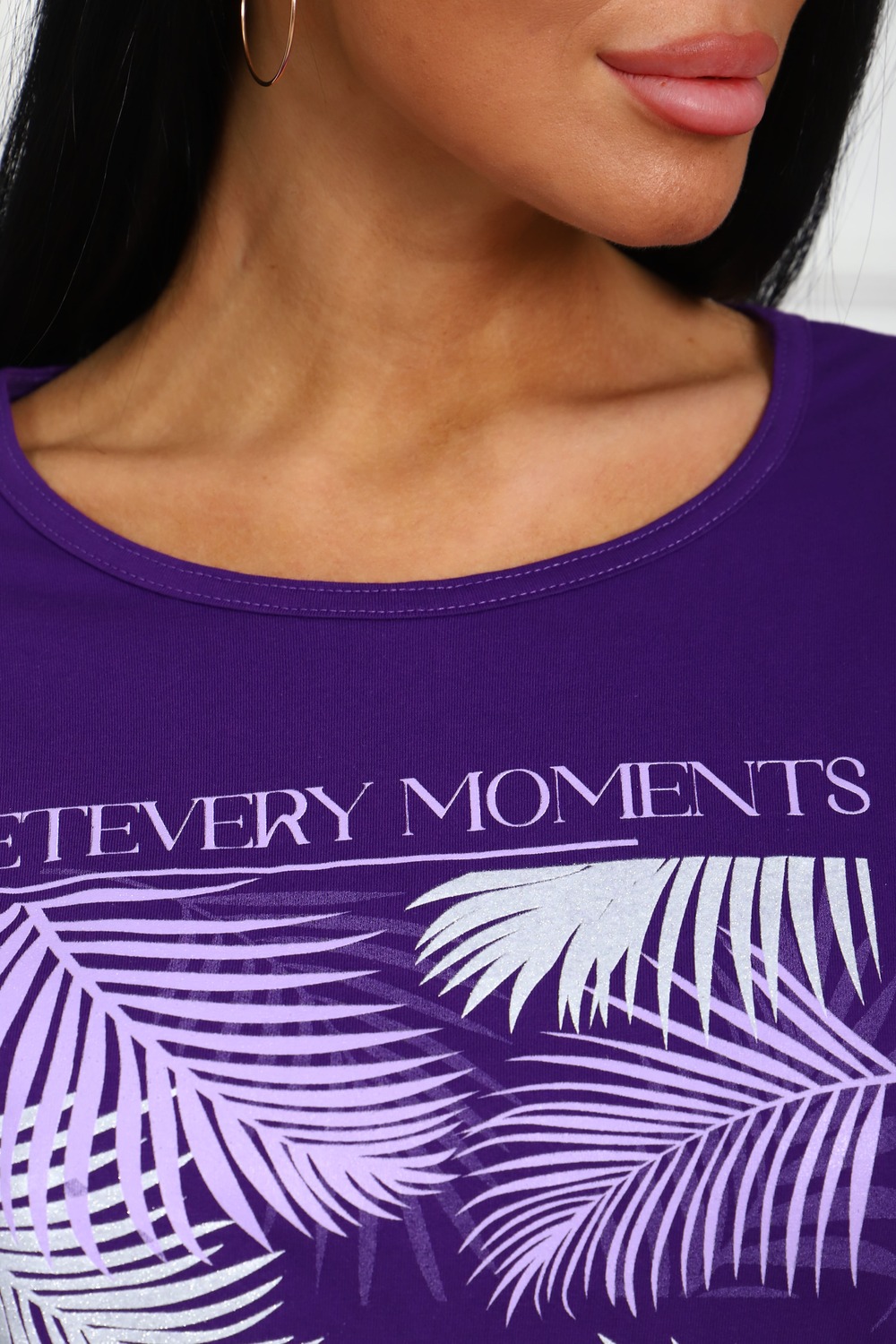 Туника женская. Ткань кулирка, хлопок 100%. Крой свободный, горловина круглой формы, обработана окантовкой. Линия плеч спущена. Длинна рукава 3/4, со швом по локтю. Низ изделия прямой. На полочке принт, шелкография.