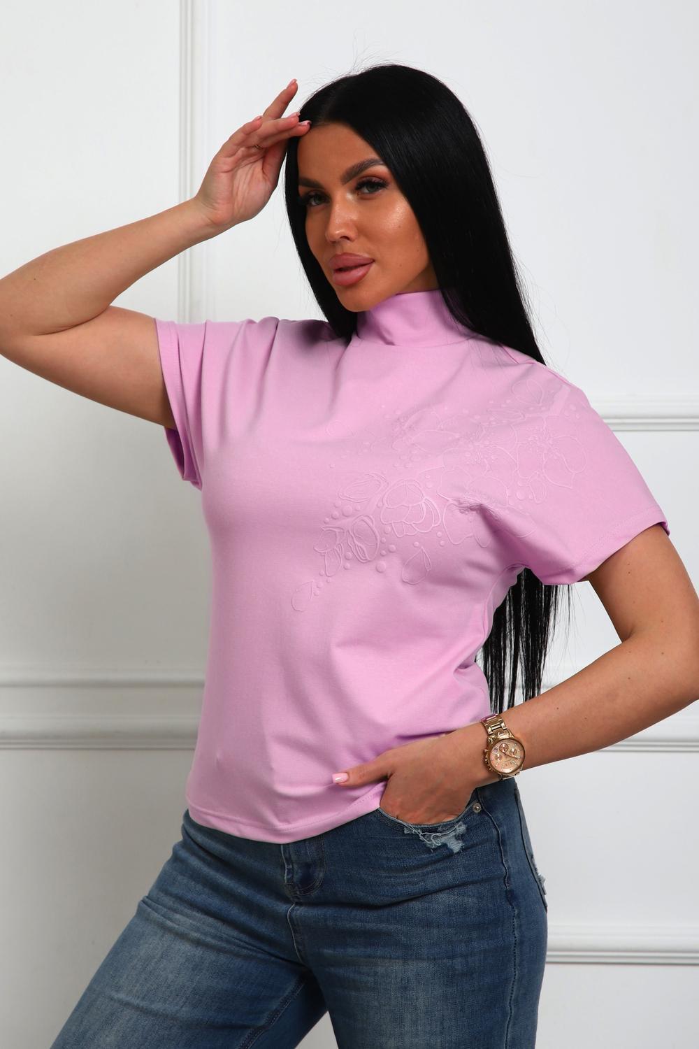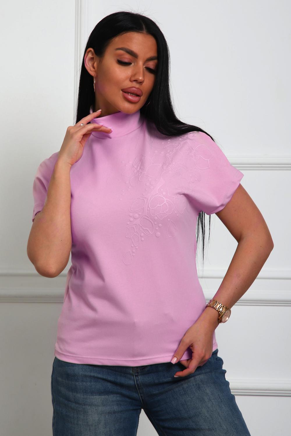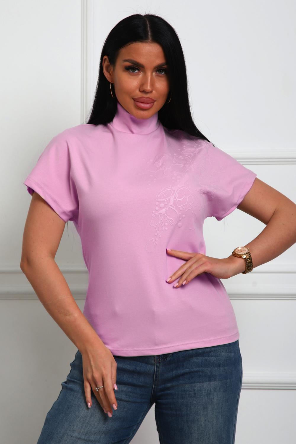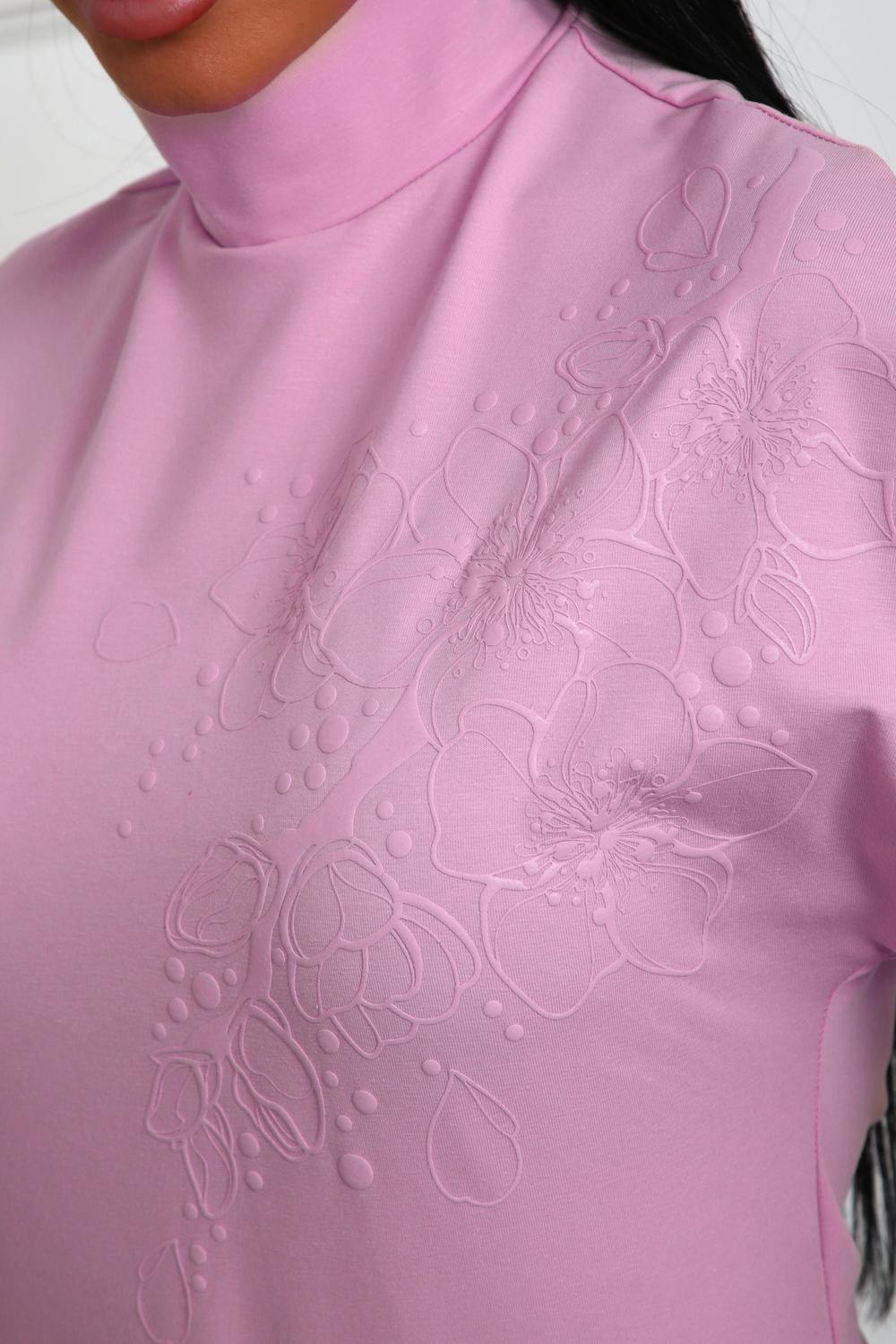 Блуза женская из трикотажного полотна. Силуэт полуприлегающий. Без рукава. Линия плечь спущенна. Воротник стойка. Низ изделия прямой. На полочке цветочный принт, пуф.