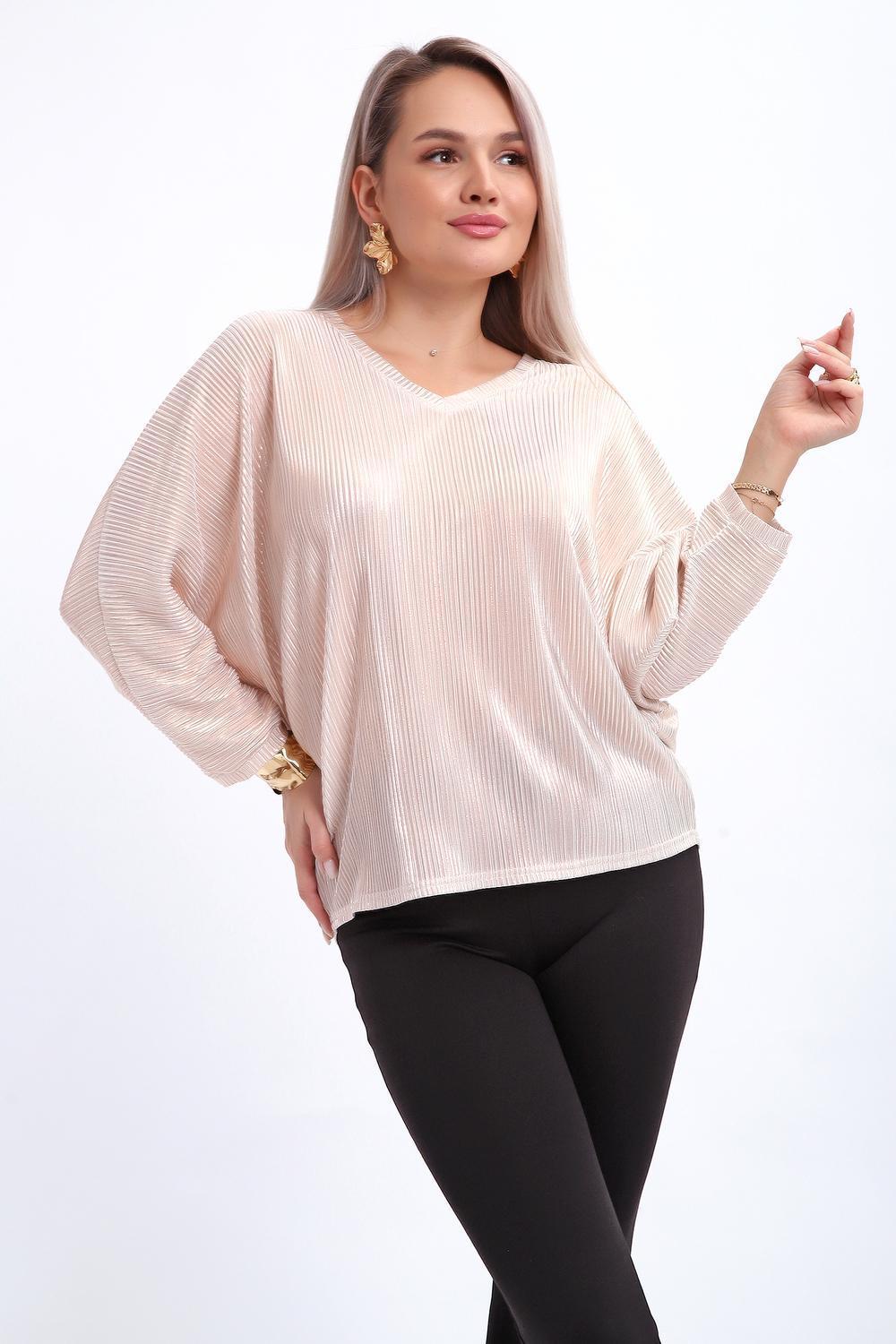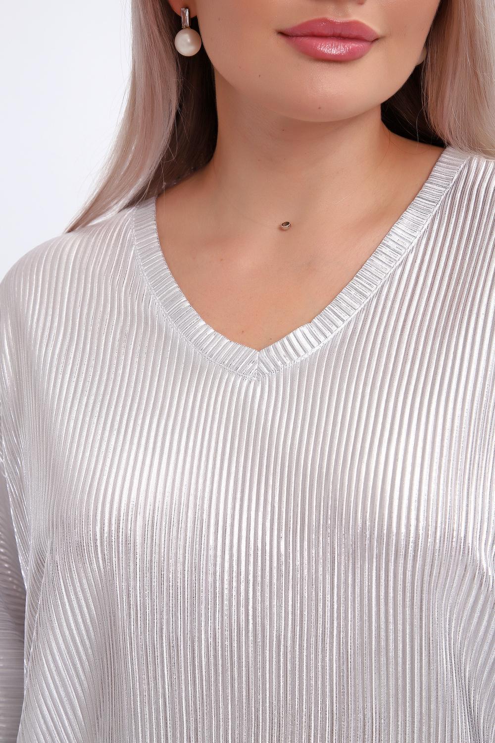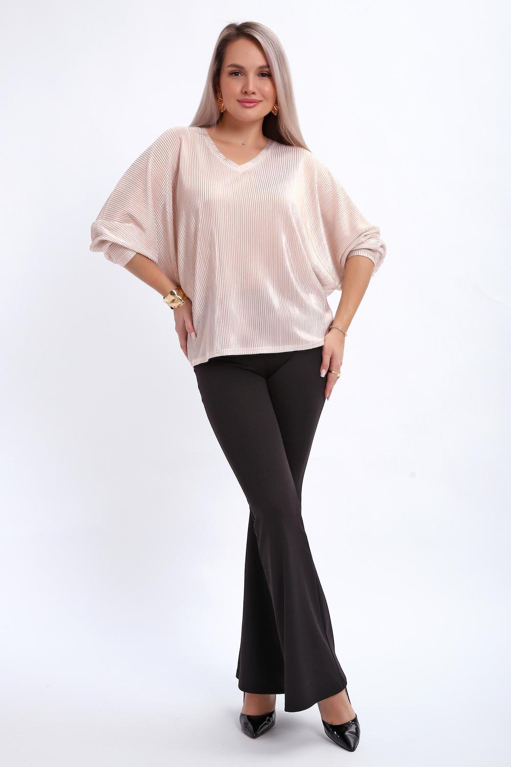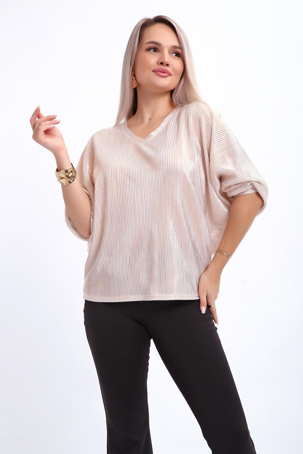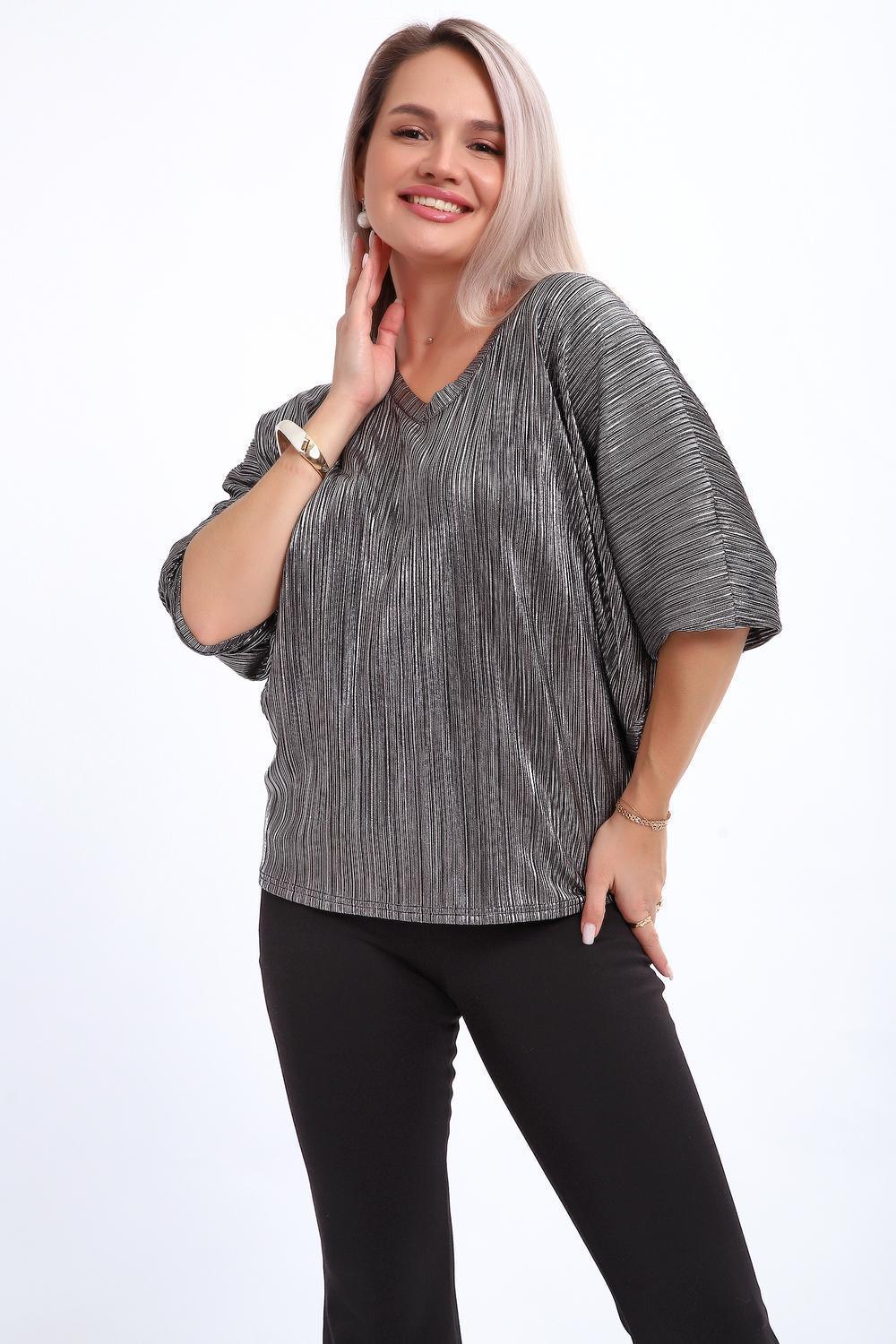 Сделайте акцент на вашем стиле с помощью комфортной и изысканной блузки. Нарядная кофта - это необходимый предмет в любом гардеробе. Благодаря свободному крою, она идеально садится на любую фигуру, скрывая то, что хотелось бы спрятать и подчеркивая достоинства. Блузка выигрышно смотрится за счет ткани атлас гофре со стойким напылением фойл, которое не осыпается в процессе носки и после стирки. Ткань атлас гофре хорошо тянется и драпируется, имеет мягкий благородный блеск и совершенно не мнется. Крой блузки лаконичен, без лишних деталей, рукав "летучая мышь" не сковывает движений, имеет длину 3/4 и оканчивается небольшим манжетом. V-образный воротник зрительно удлиняет шею, обработан обтачкой, длина блузки до линии бедра. Легкая изящная блузка отлично впишется в вечерний наряд, а также будет блестящим дополнением к деловому и повседневному образу.