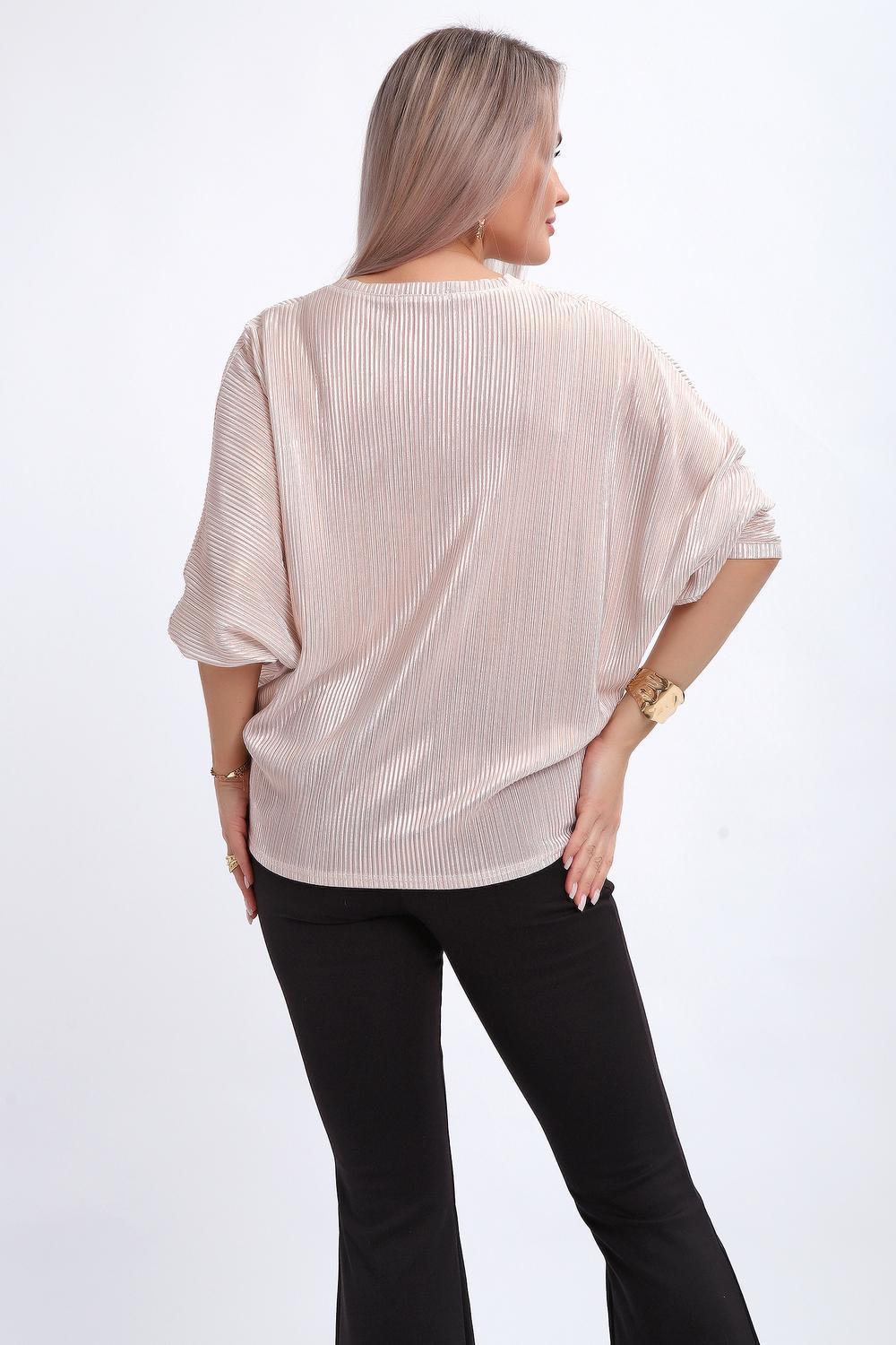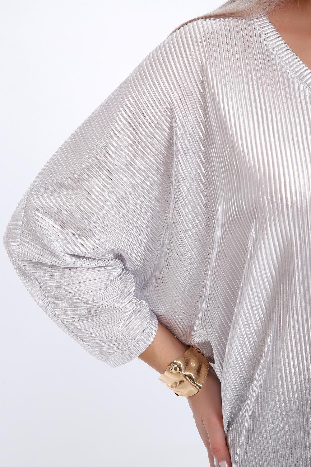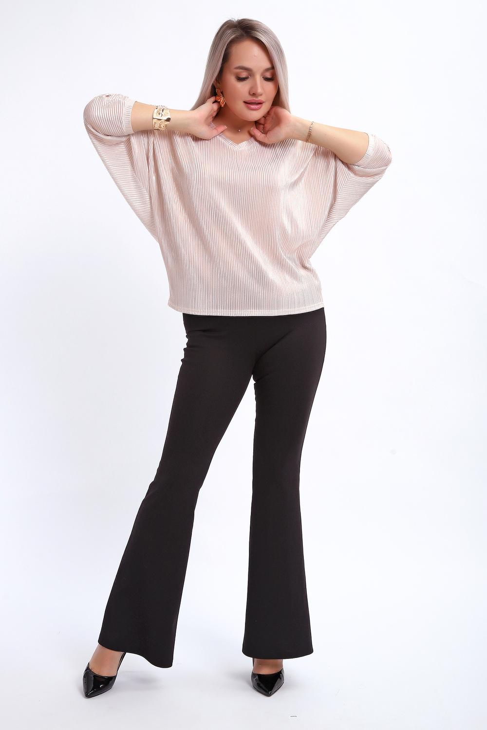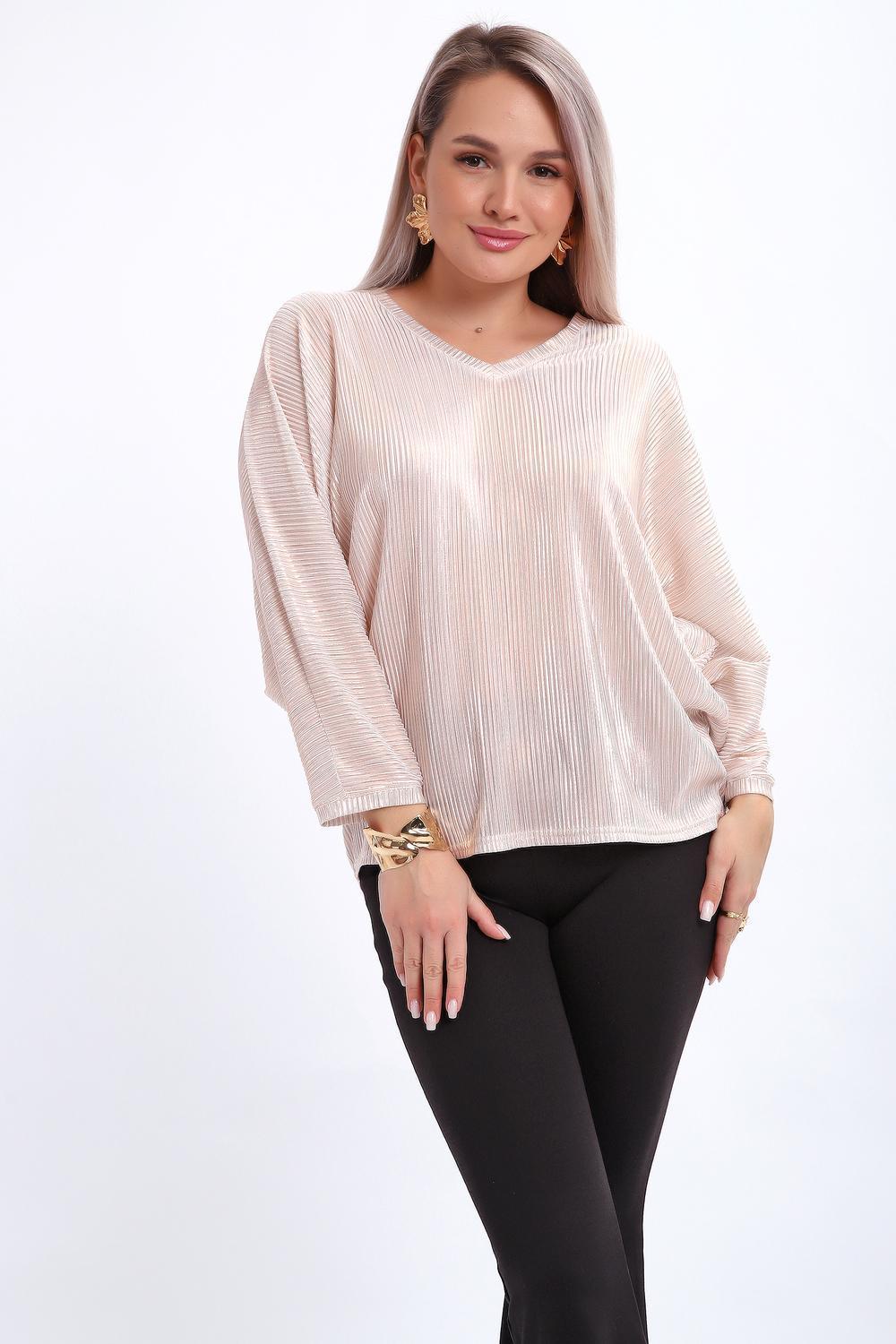 Сделайте акцент на вашем стиле с помощью комфортной и изысканной блузки. Нарядная кофта - это необходимый предмет в любом гардеробе. Благодаря свободному крою, она идеально садится на любую фигуру, скрывая то, что хотелось бы спрятать и подчеркивая достоинства. Блузка выигрышно смотрится за счет ткани атлас гофре со стойким напылением фойл, которое не осыпается в процессе носки и после стирки. Ткань атлас гофре хорошо тянется и драпируется, имеет мягкий благородный блеск и совершенно не мнется. Крой блузки лаконичен, без лишних деталей, рукав "летучая мышь" не сковывает движений, имеет длину 3/4 и оканчивается небольшим манжетом. V-образный воротник зрительно удлиняет шею, обработан обтачкой, длина блузки до линии бедра. Легкая изящная блузка отлично впишется в вечерний наряд, а также будет блестящим дополнением к деловому и повседневному образу.