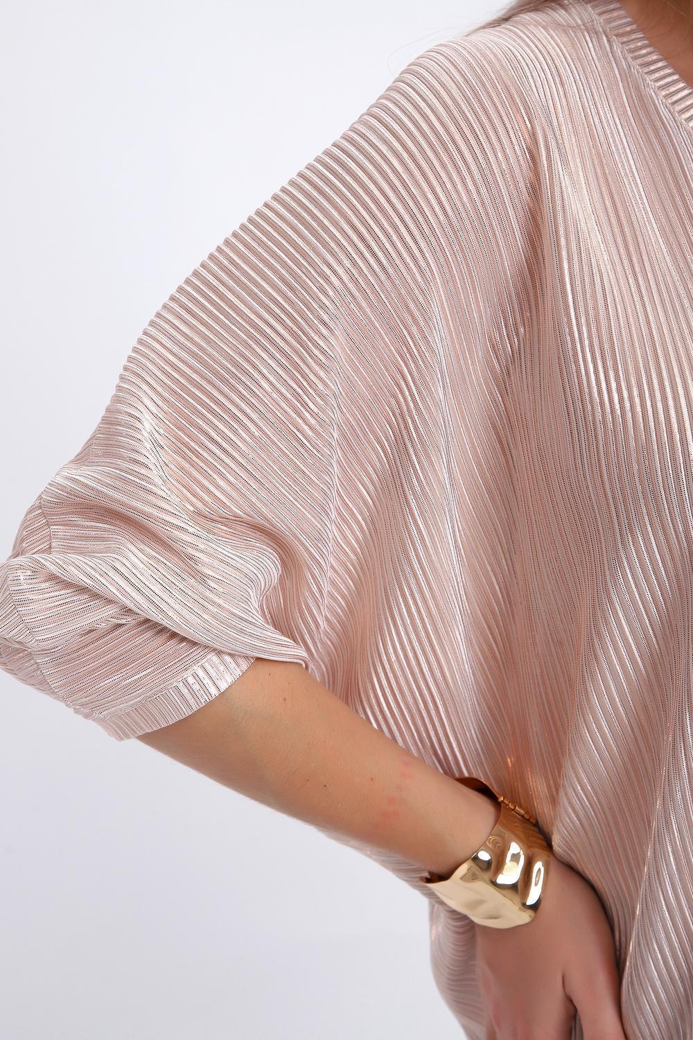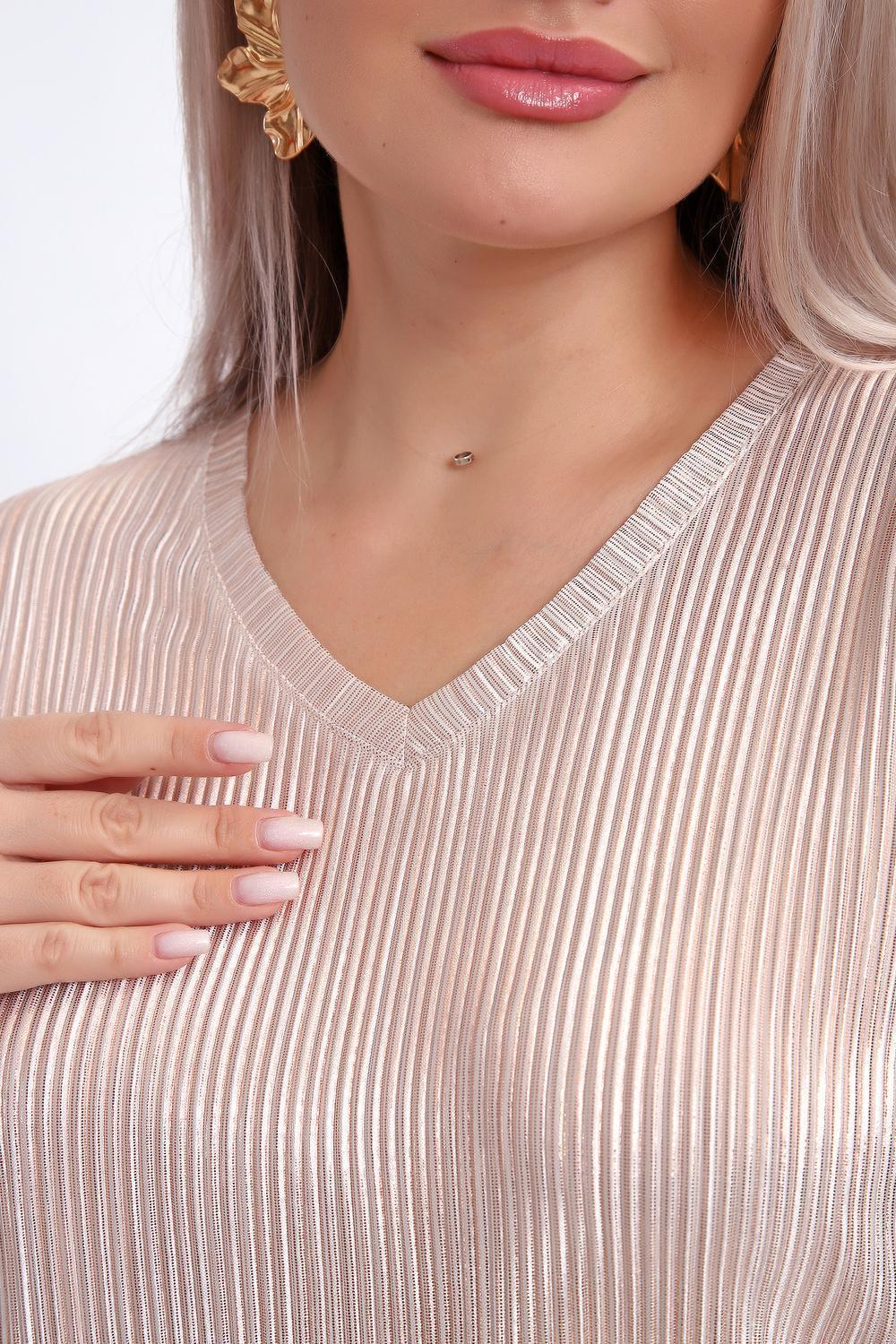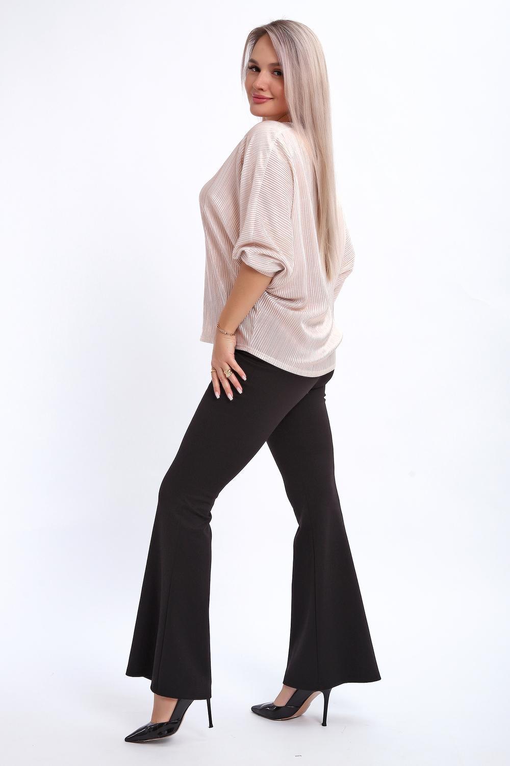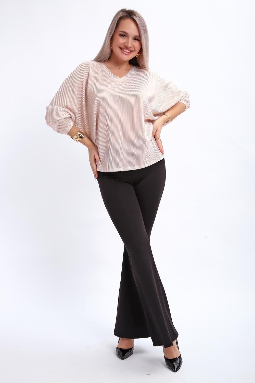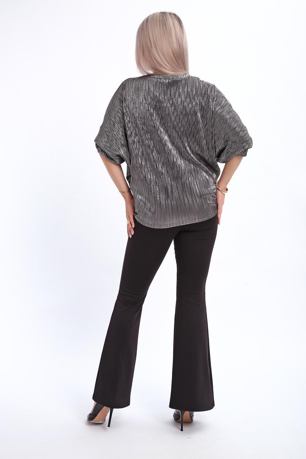 Сделайте акцент на вашем стиле с помощью комфортной и изысканной блузки. Нарядная кофта - это необходимый предмет в любом гардеробе. Благодаря свободному крою, она идеально садится на любую фигуру, скрывая то, что хотелось бы спрятать и подчеркивая достоинства. Блузка выигрышно смотрится за счет ткани атлас гофре со стойким напылением фойл, которое не осыпается в процессе носки и после стирки. Ткань атлас гофре хорошо тянется и драпируется, имеет мягкий благородный блеск и совершенно не мнется. Крой блузки лаконичен, без лишних деталей, рукав "летучая мышь" не сковывает движений, имеет длину 3/4 и оканчивается небольшим манжетом. V-образный воротник зрительно удлиняет шею, обработан обтачкой, длина блузки до линии бедра. Легкая изящная блузка отлично впишется в вечерний наряд, а также будет блестящим дополнением к деловому и повседневному образу.