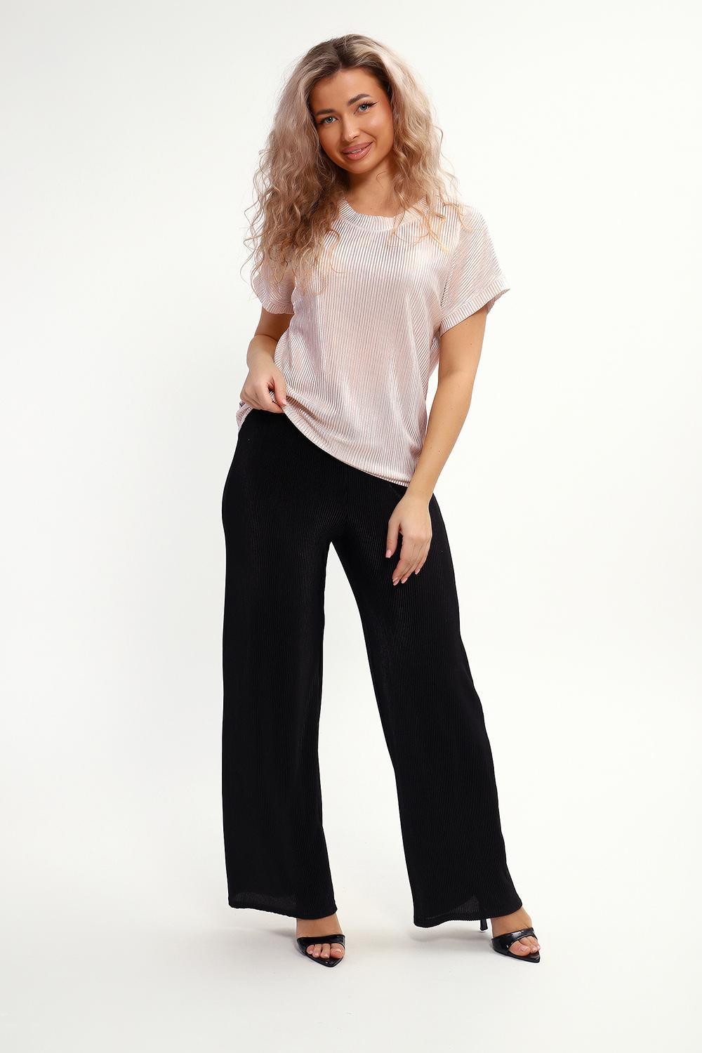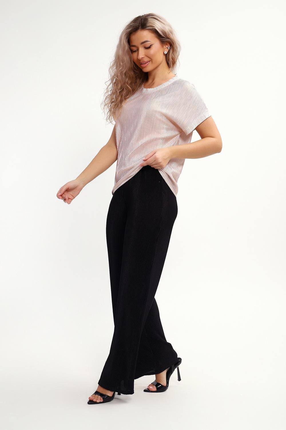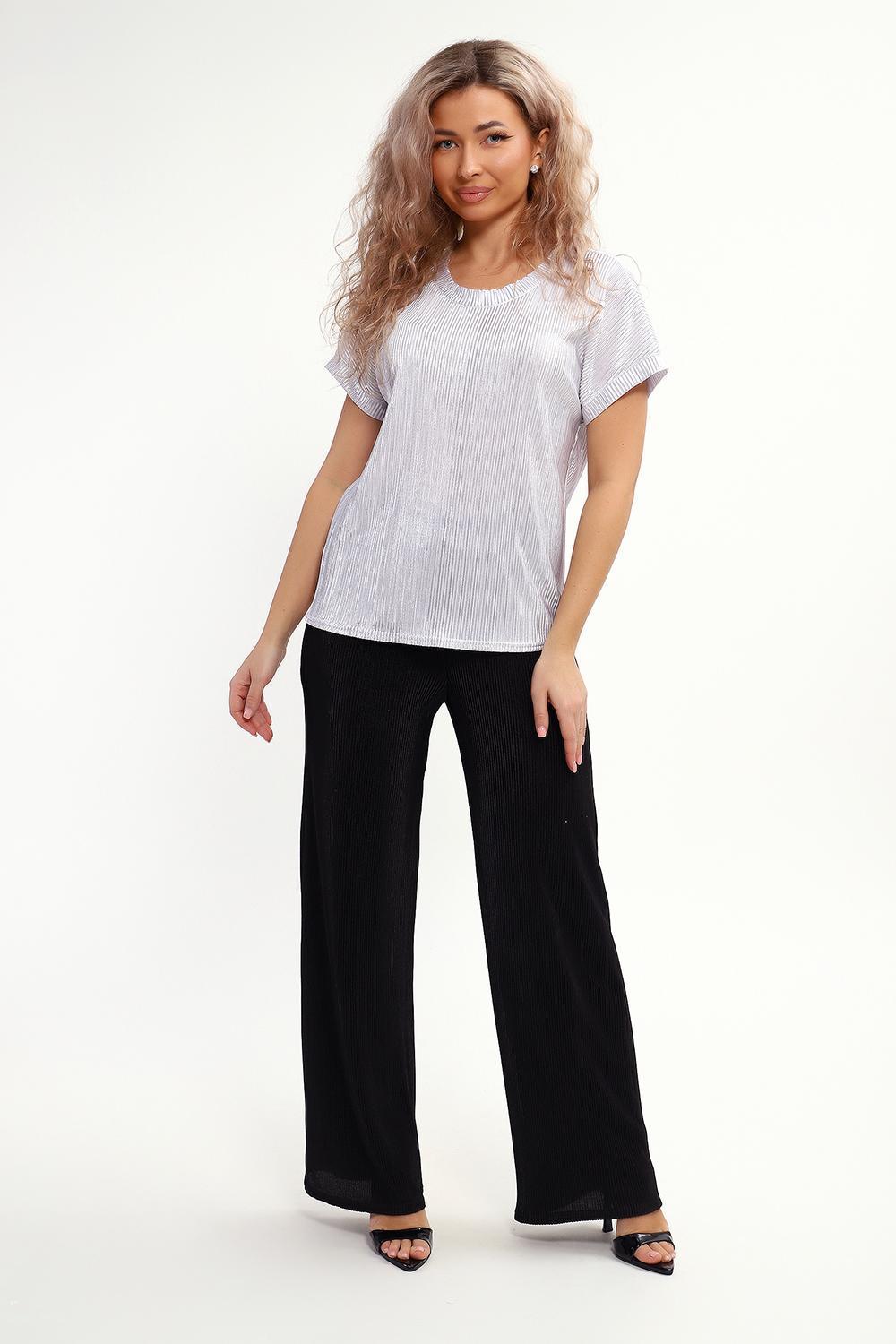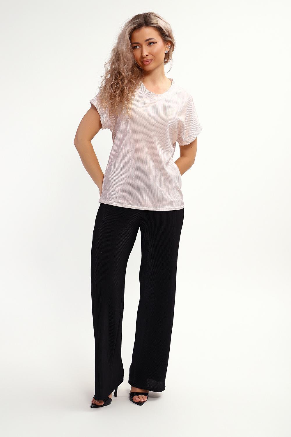 Блузка представлена в трех базовых расцветках, к которым легко подобрать юбку или брюки. На модели брюки 32827, которые изготовлены из такой же ткани, только без блестящего напыления.