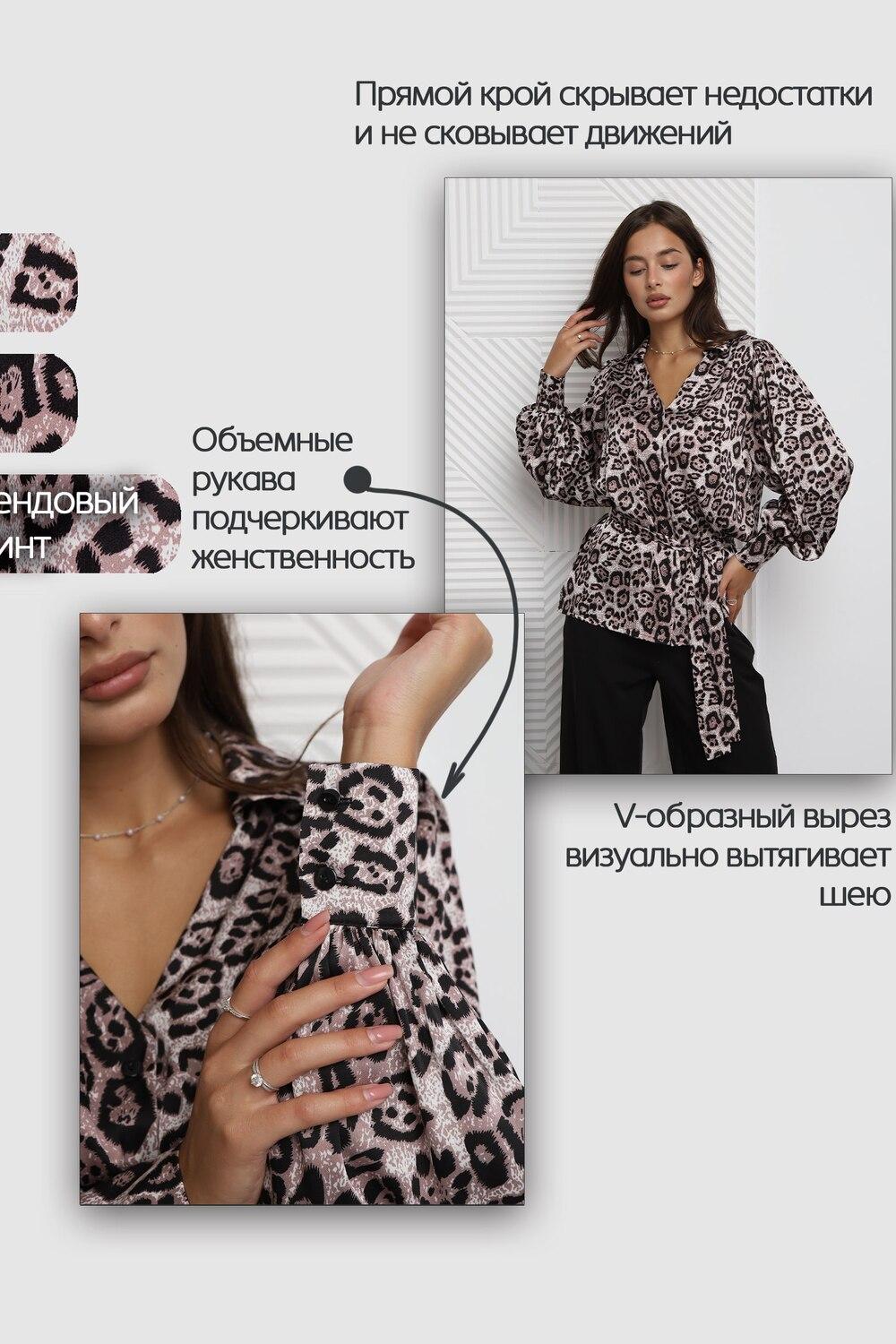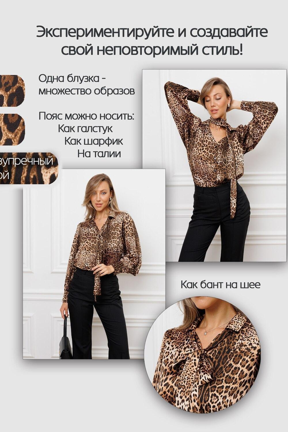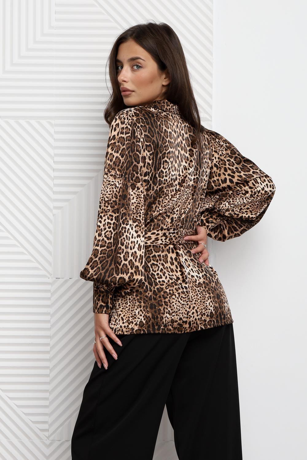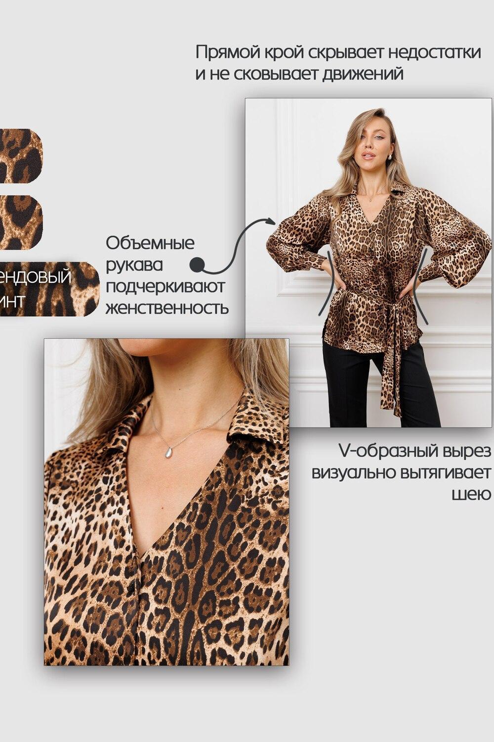 Эта рубашка дополнена рукавами-фонариками, что придает образу романтичности и элегантности. Пояс позволяют регулировать силуэт, создавая акцент на талии. Также присутствует стильный леопардовый принт, который добавляет нотку дерзости в наряд.