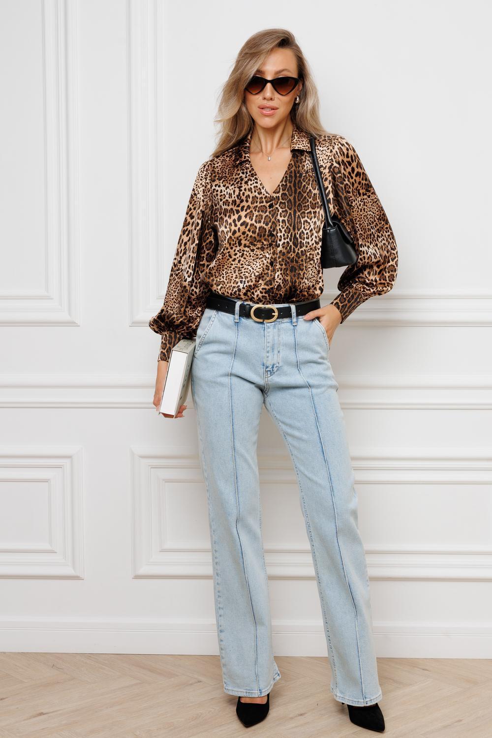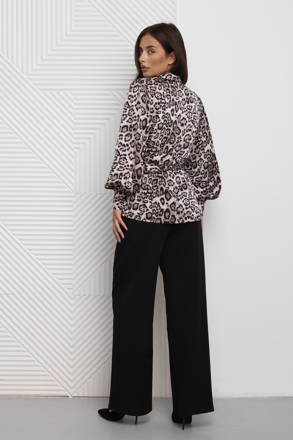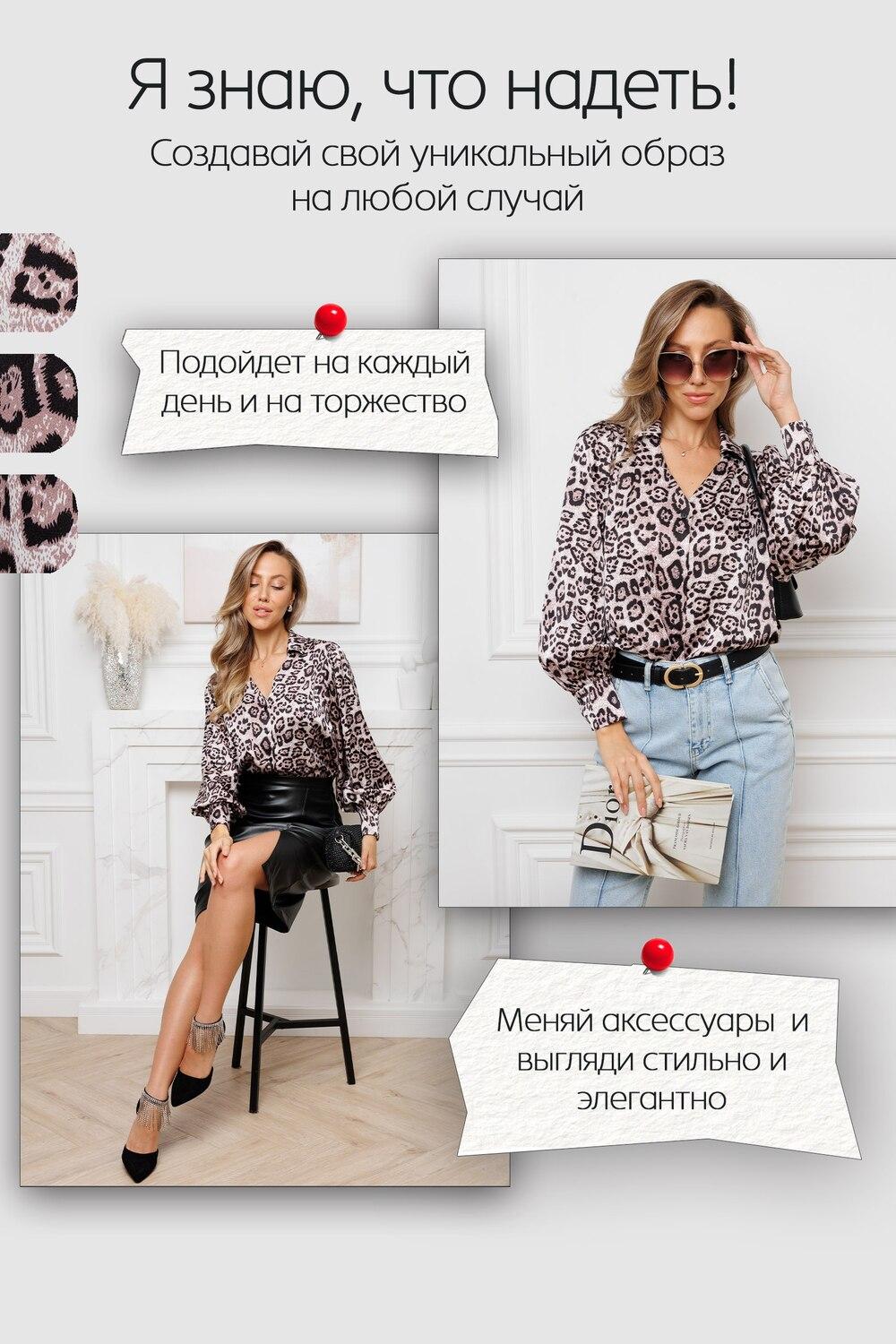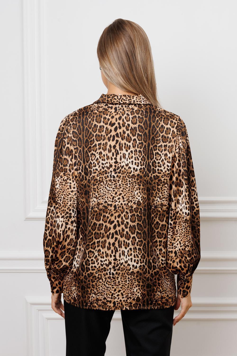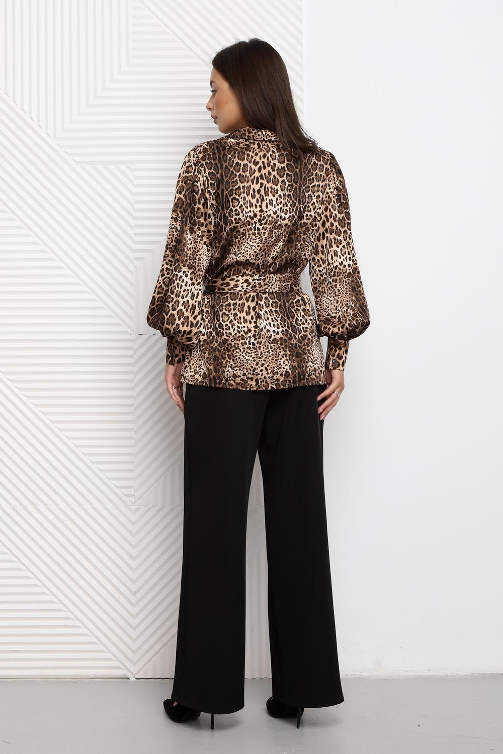 Эта рубашка дополнена рукавами-фонариками, что придает образу романтичности и элегантности. Пояс позволяют регулировать силуэт, создавая акцент на талии. Также присутствует стильный леопардовый принт, который добавляет нотку дерзости в наряд.