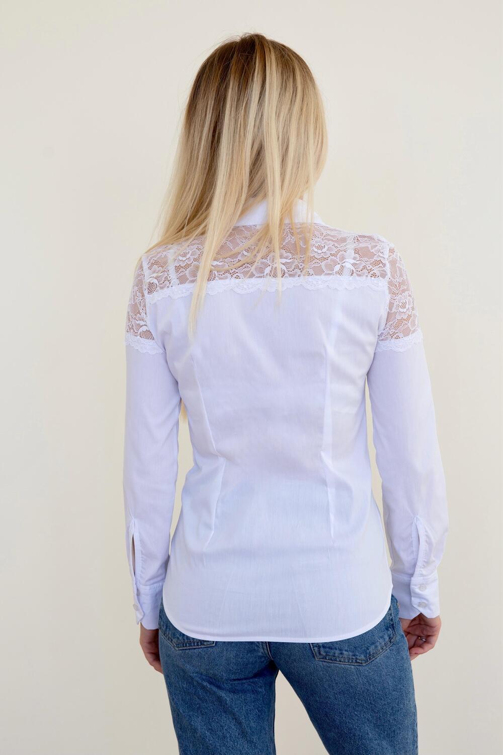 Изящная рубашка приталенного кроя. Модель с кружевными вставками, которые красиво подчёркивают плечи. В такой рубашке можно отправиться на работу в офис или покорять сердца на свиданиях.