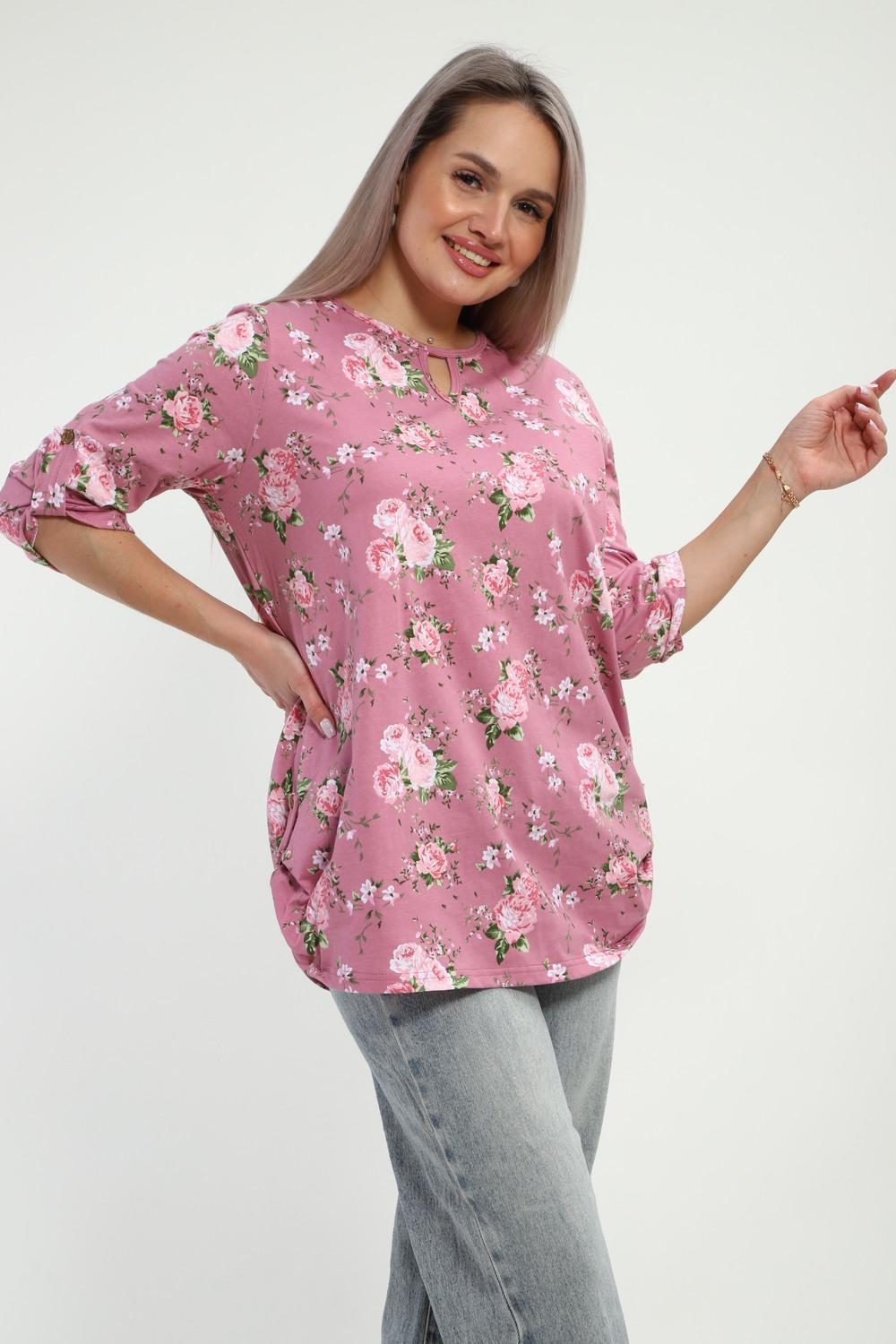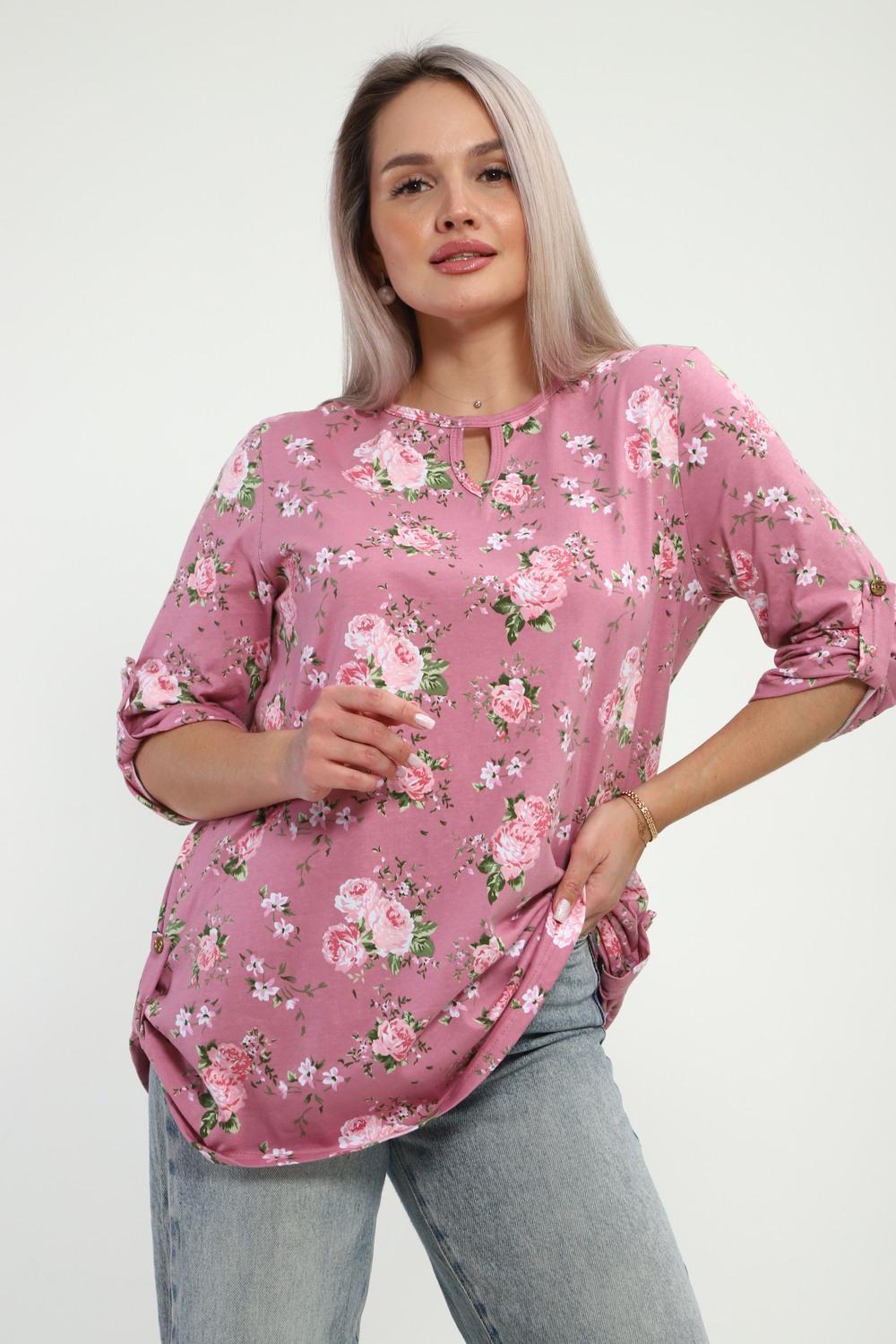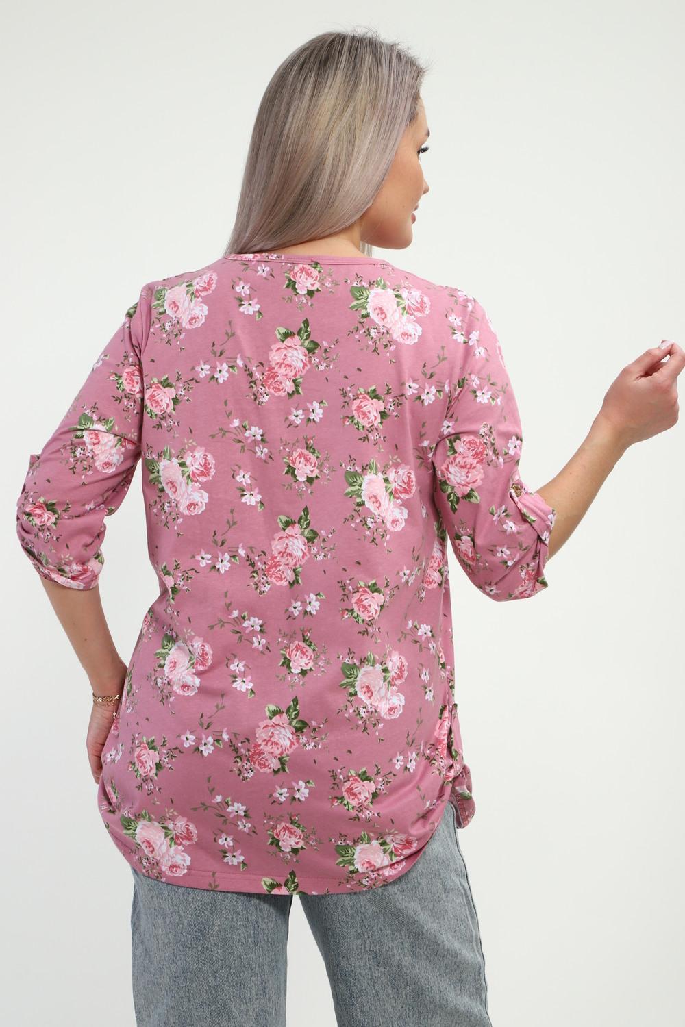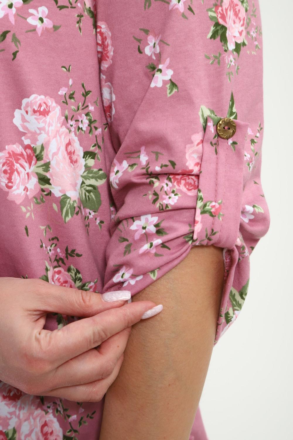 Туника женская Туника-рубашка имеет округлый вырез с фигурной капелькой. Рукава 3/4 и низ подогнуты на плоскошовной машине, а так жен имеют декоративный элемент с пуговицей.Блуза женская подходит для беременных, для полных, для женщин больших размеров. Туника-рубашка подойдет для лета, весны, осени, зимы