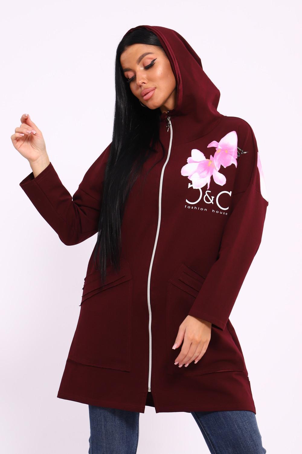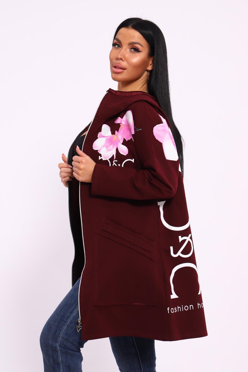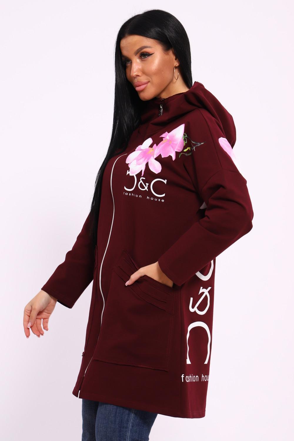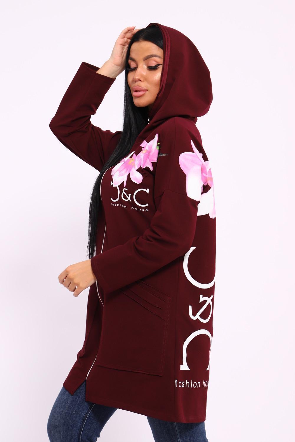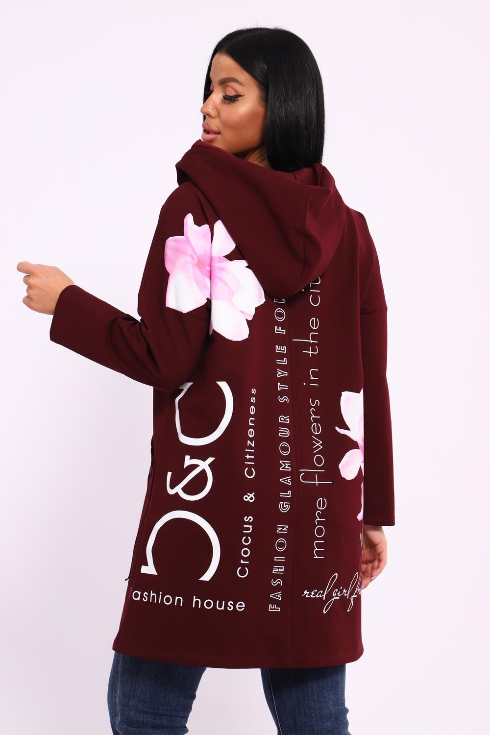 Женская туника из футера. Застегивается на молнию, по бокам карманы, имеется капюшон, принт в виде цветов и надписей, общая длина чуть выше коленей. Размеры от 50 до 64.