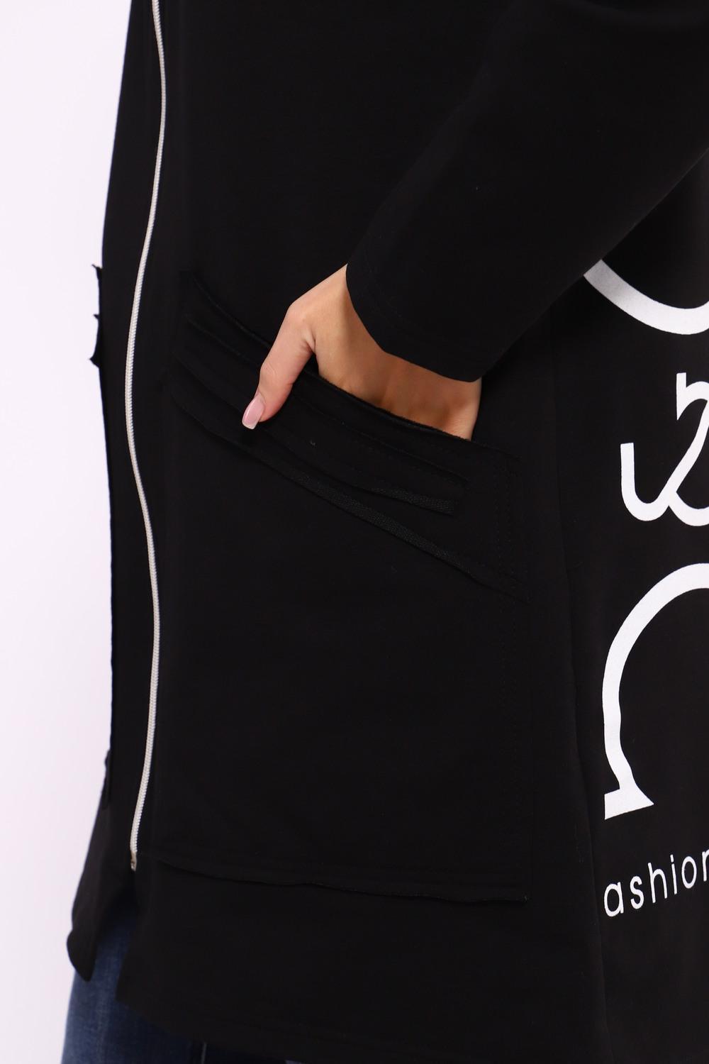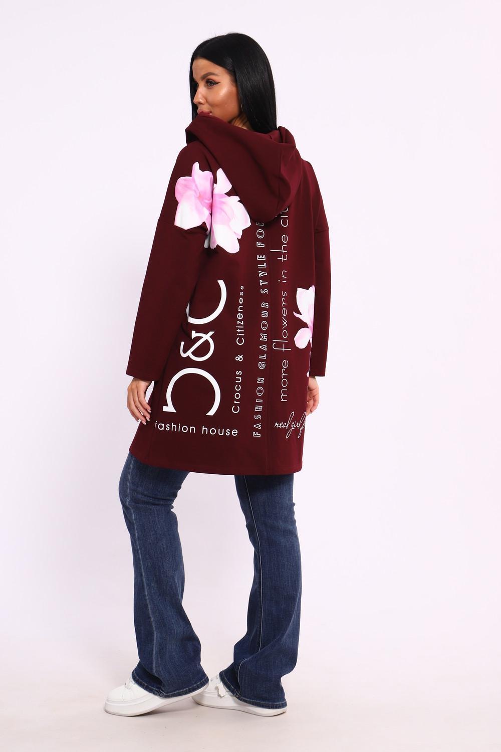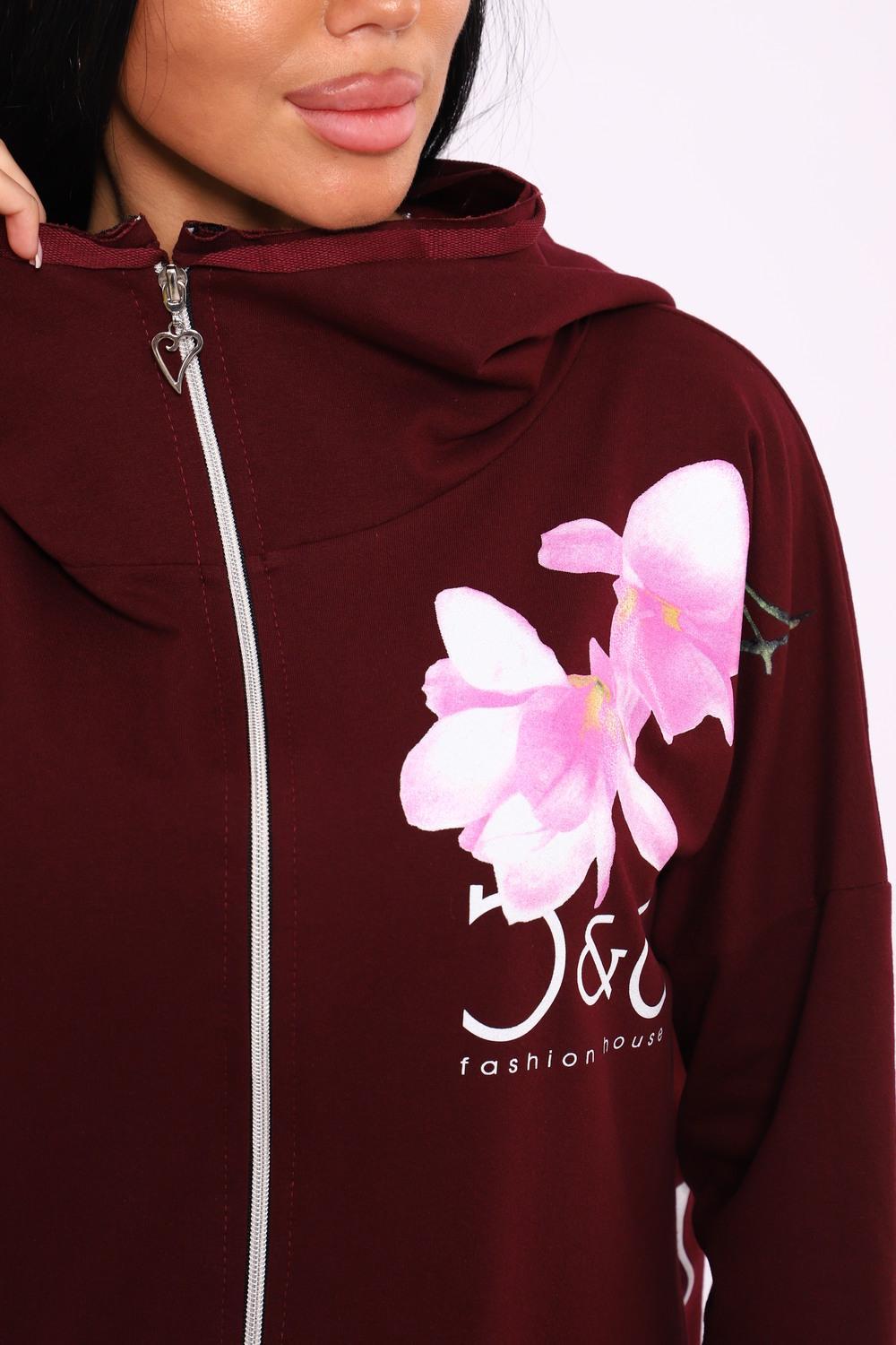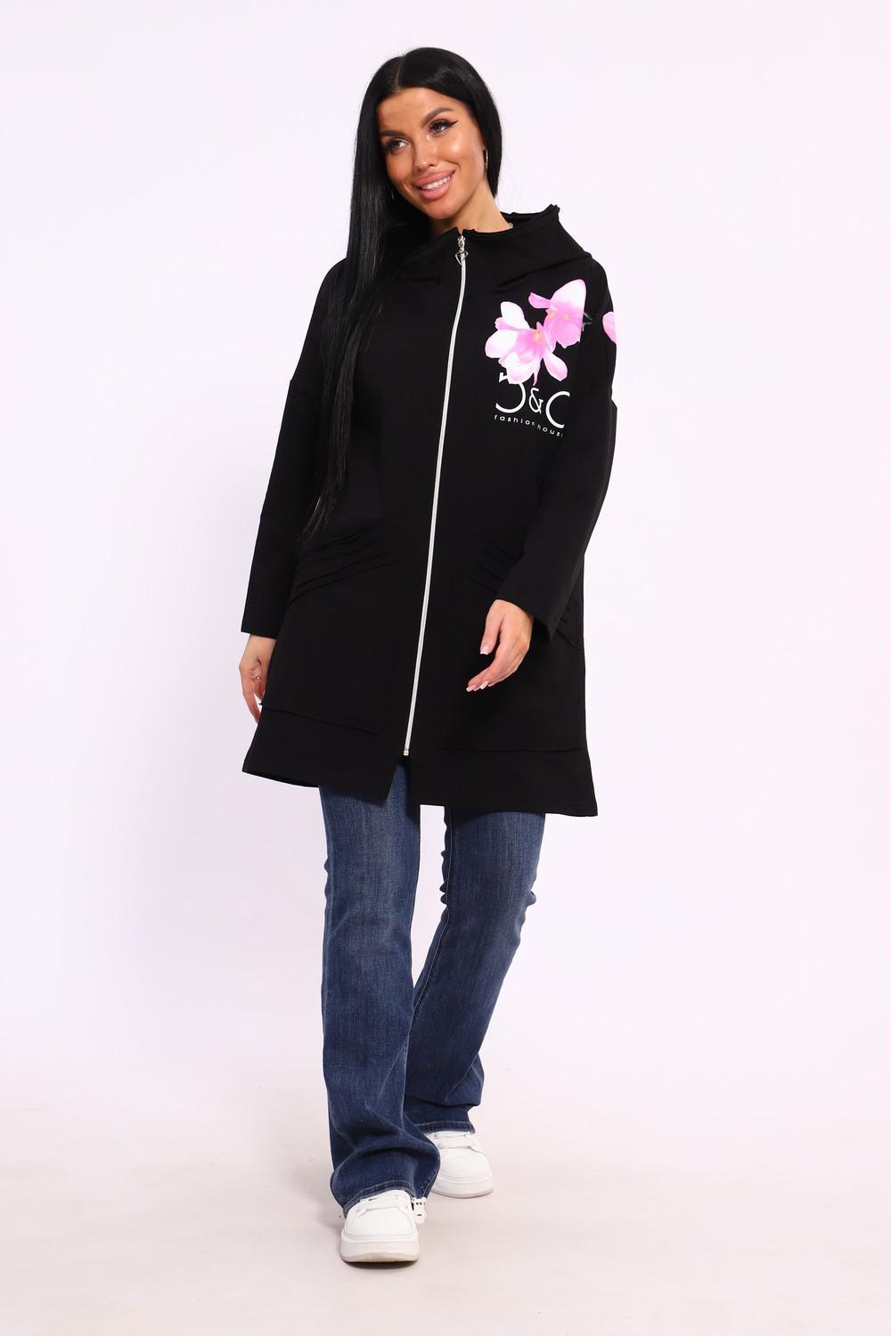 Женская туника из футера. Застегивается на молнию, по бокам карманы, имеется капюшон, принт в виде цветов и надписей, общая длина чуть выше коленей. Размеры от 50 до 64.