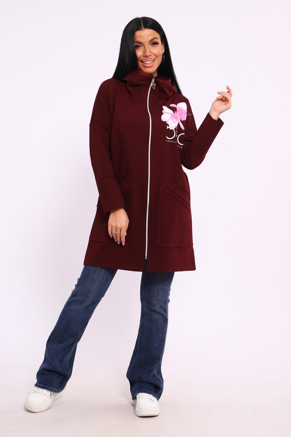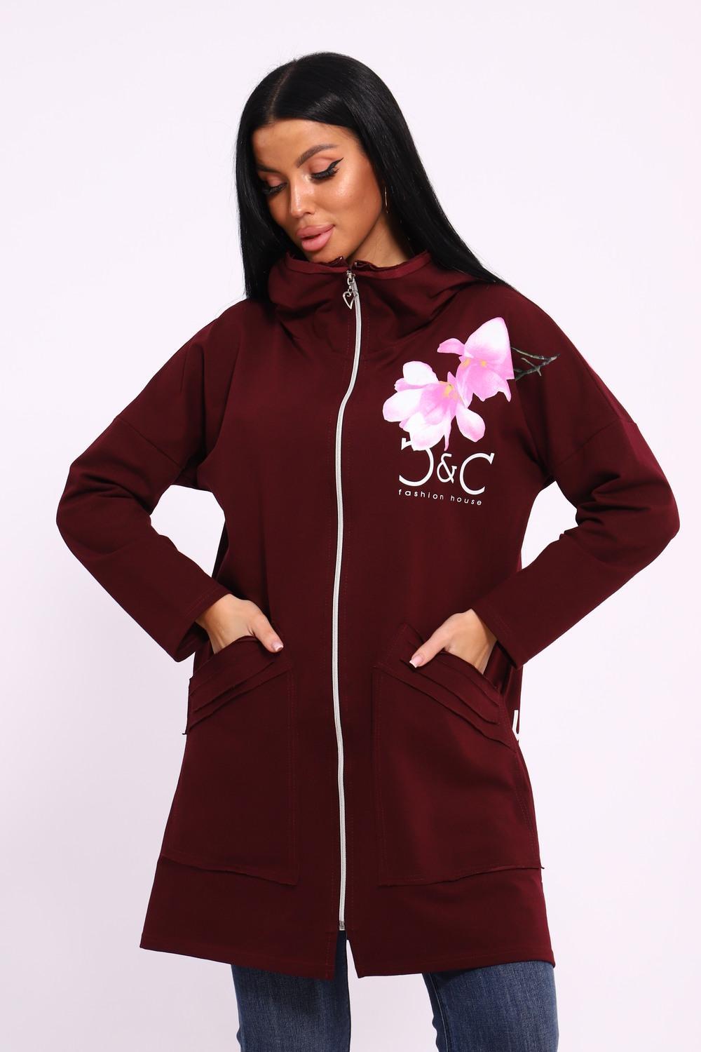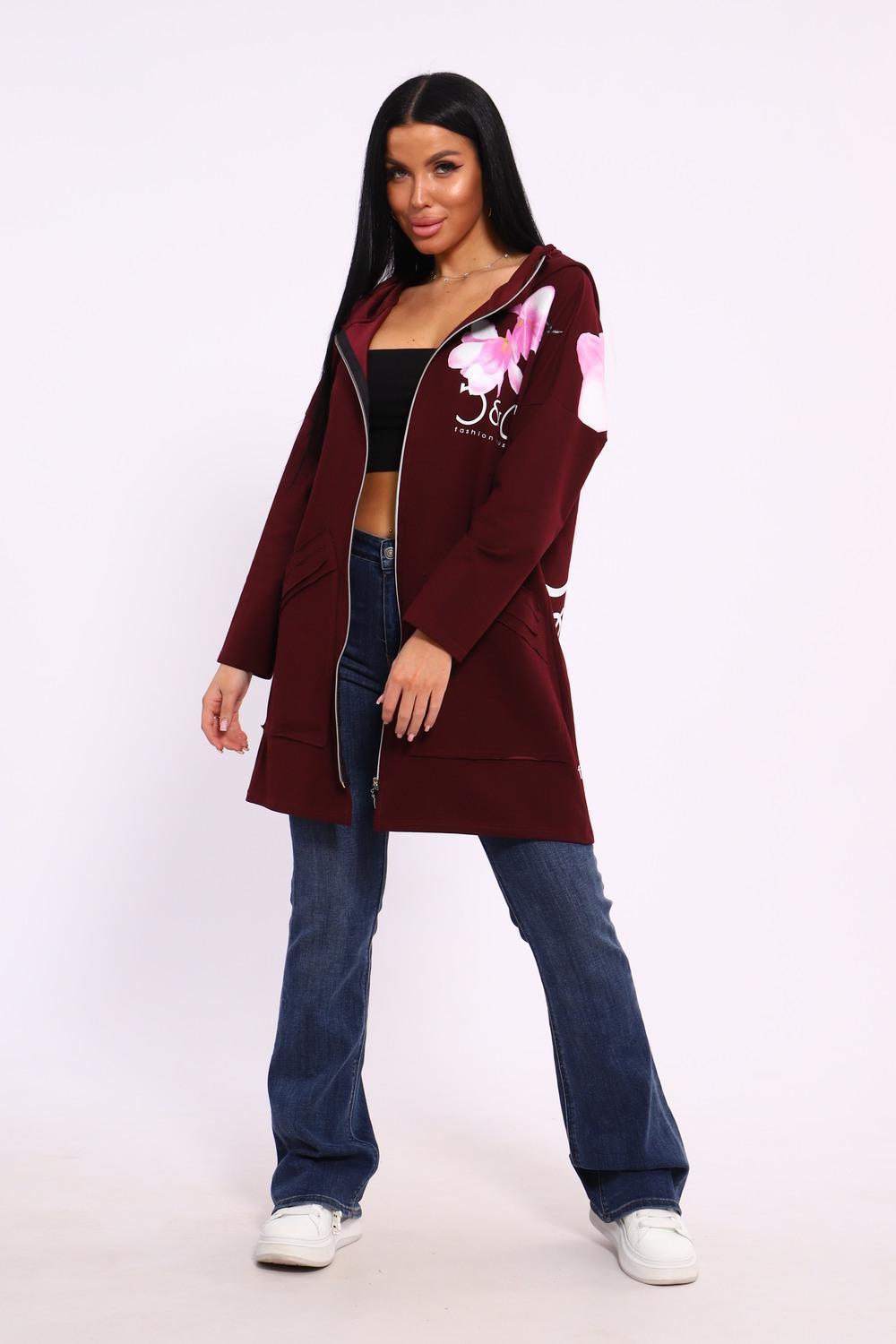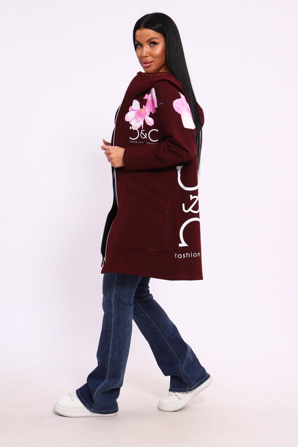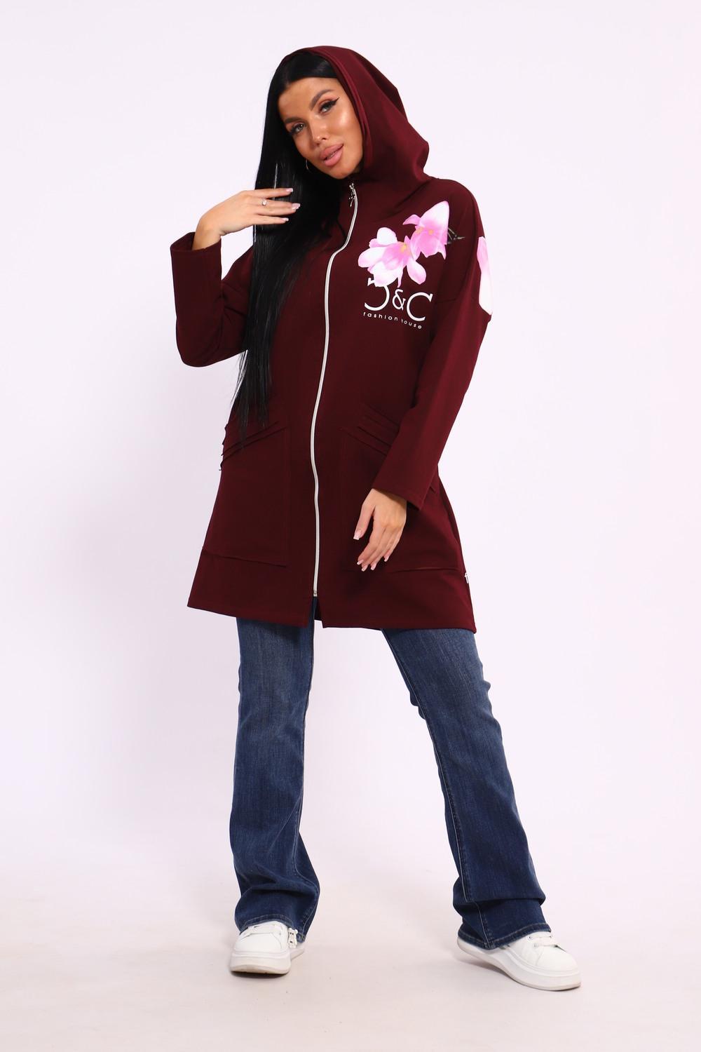 Женская туника из футера. Застегивается на молнию, по бокам карманы, имеется капюшон, принт в виде цветов и надписей, общая длина чуть выше коленей. Размеры от 50 до 64.