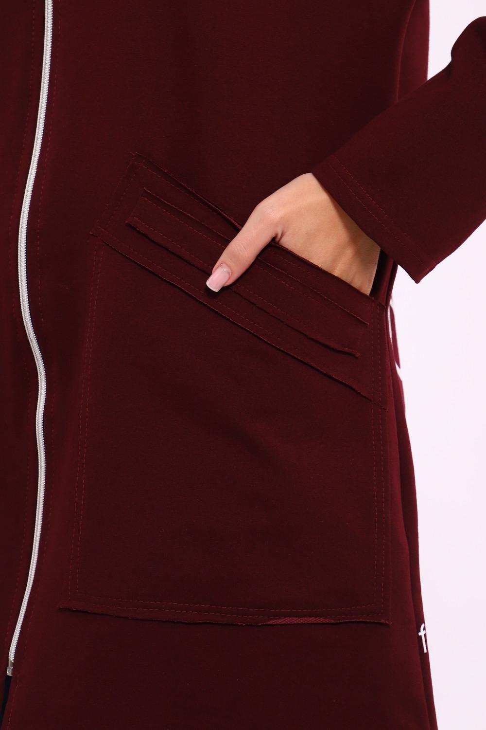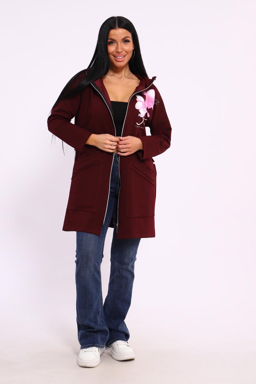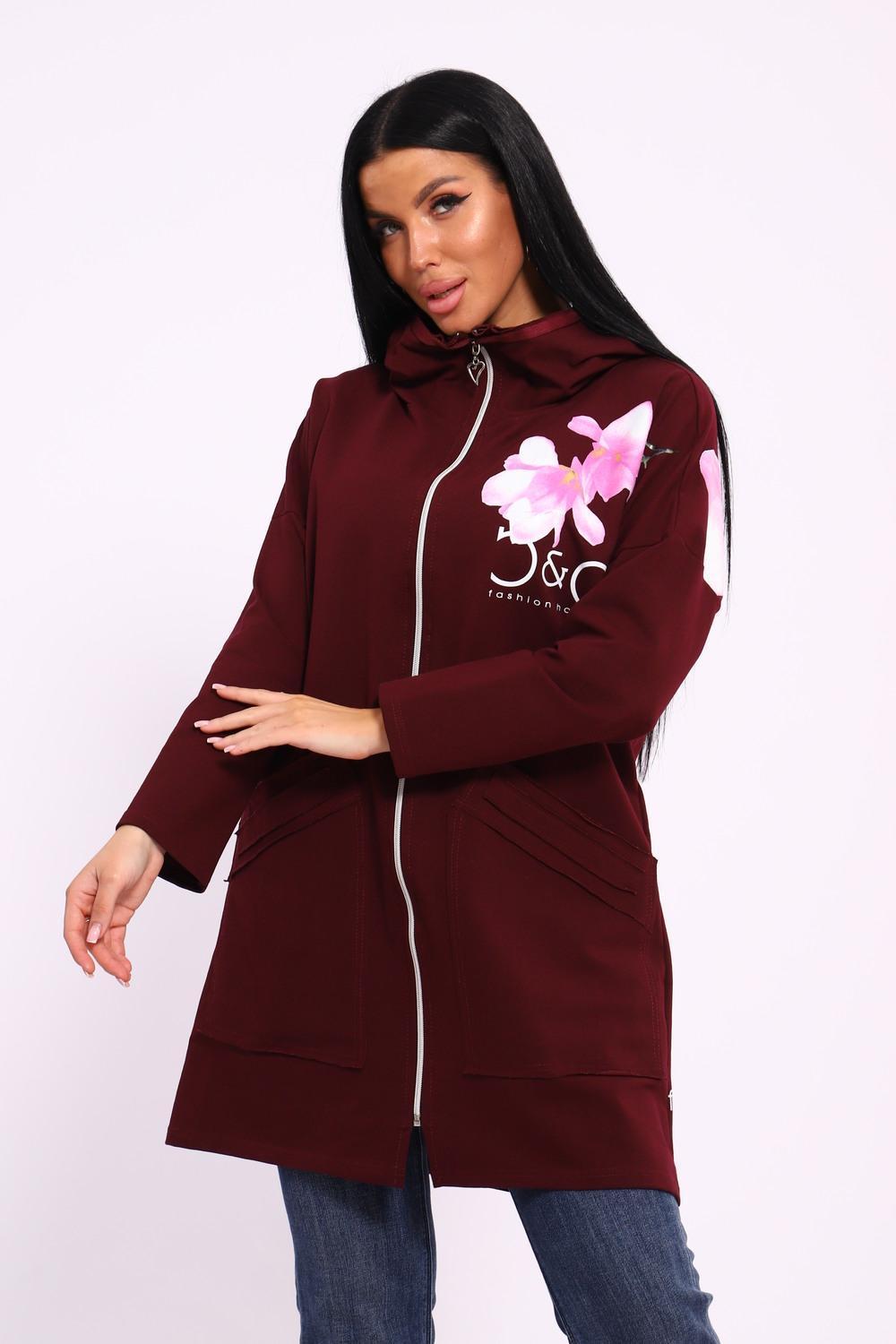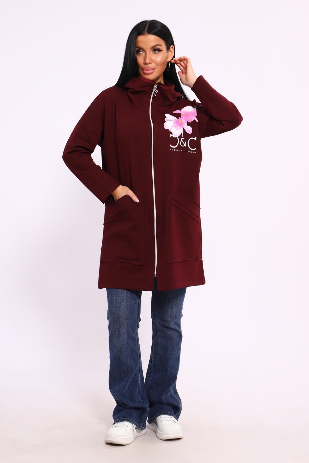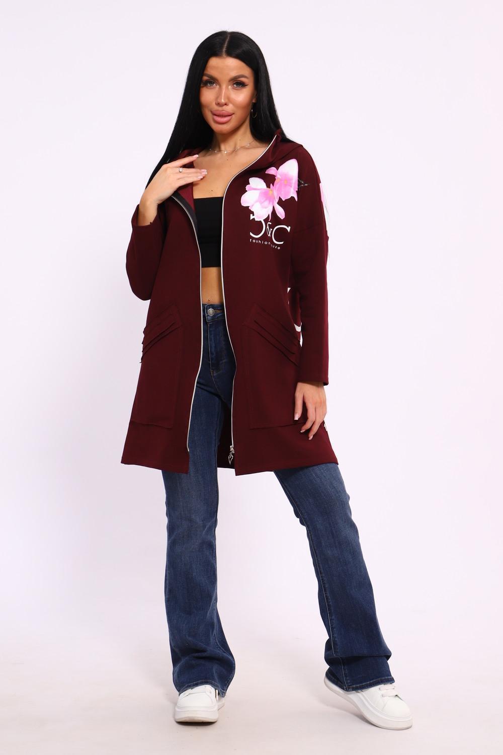 Женская туника из футера. Застегивается на молнию, по бокам карманы, имеется капюшон, принт в виде цветов и надписей, общая длина чуть выше коленей. Размеры от 50 до 64.