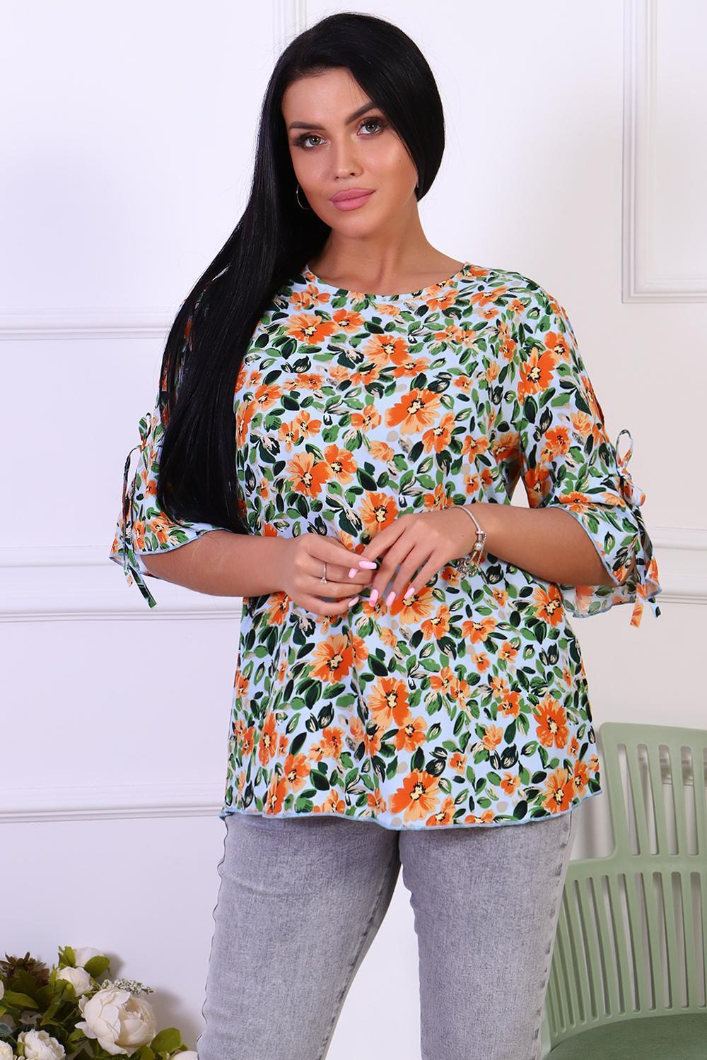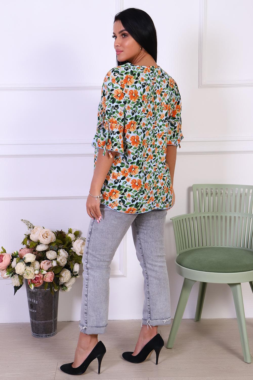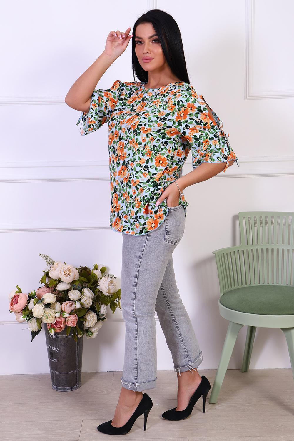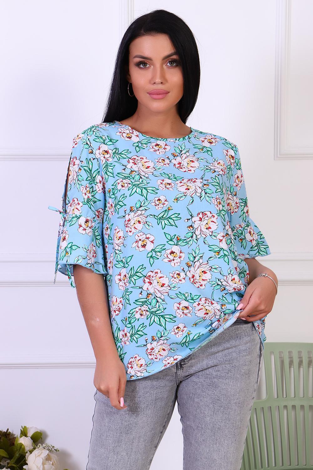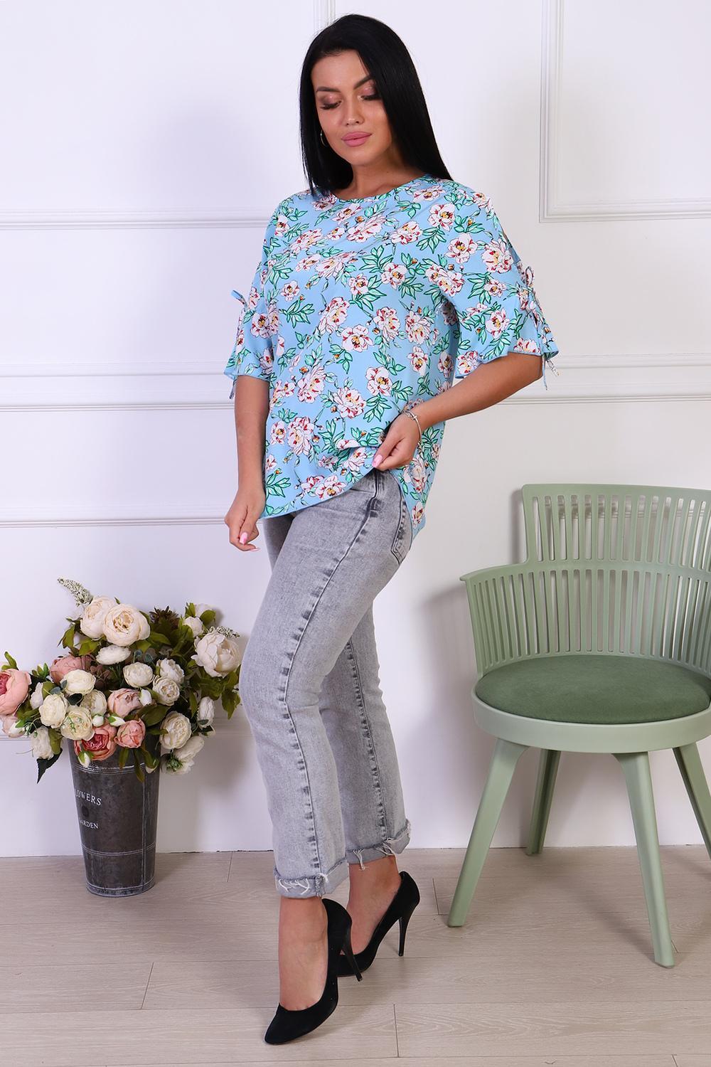 Романтичная туника с цветочным принтом из штапеля. Оригинальные рукава с завязками и воланами. Горловина туники окантована, низ рукавов и изделия обработан декоративной строчкой.