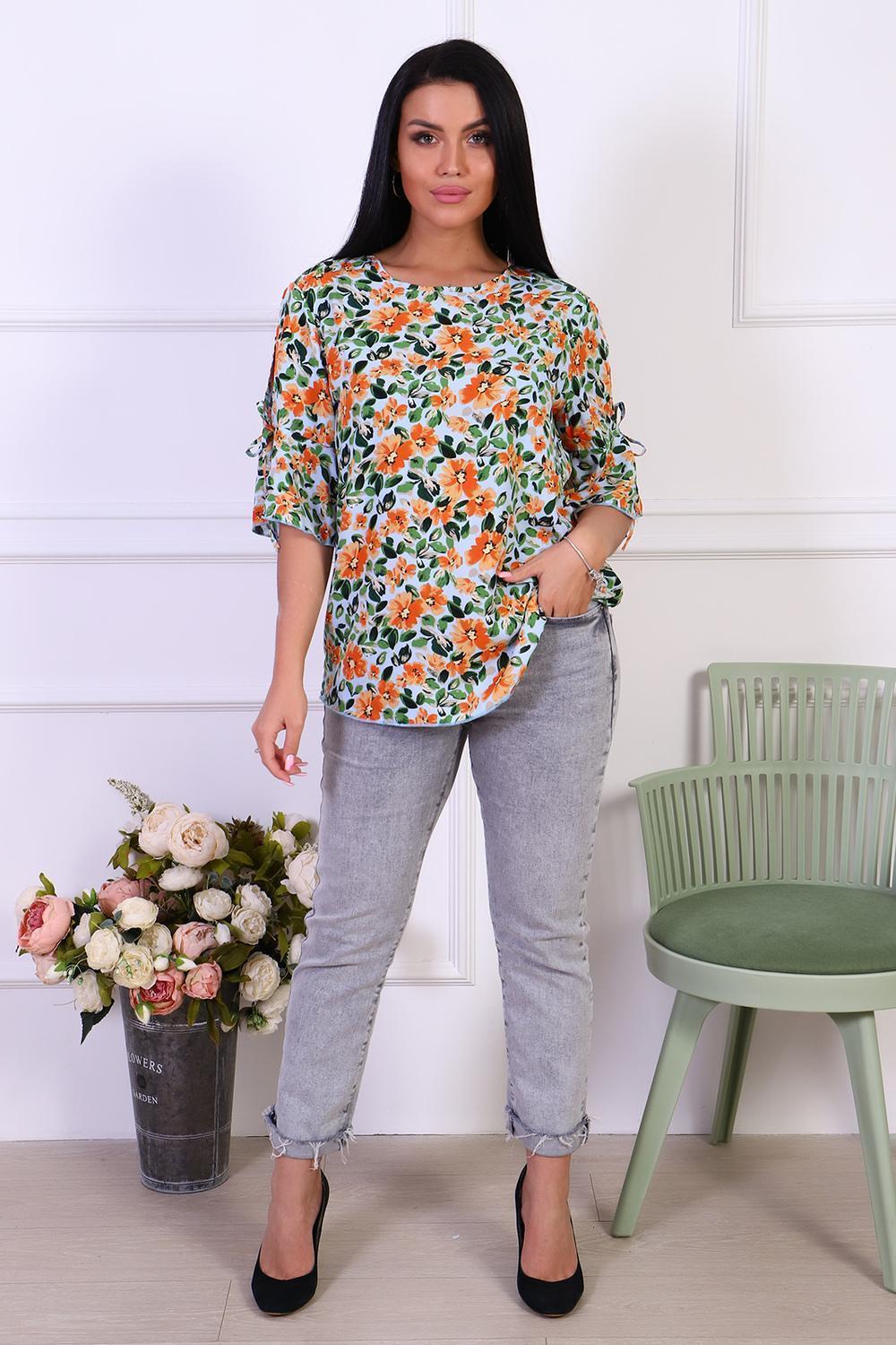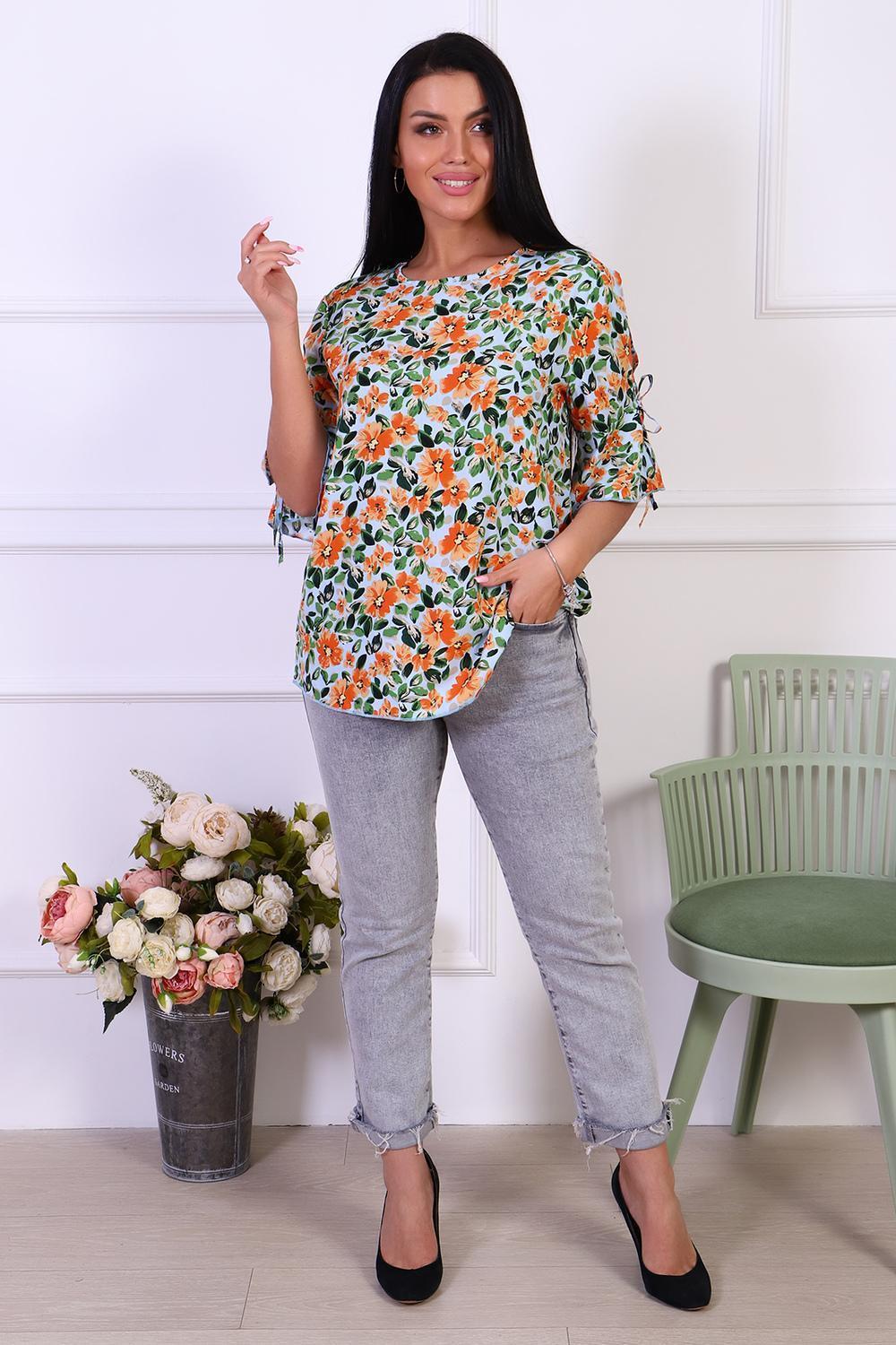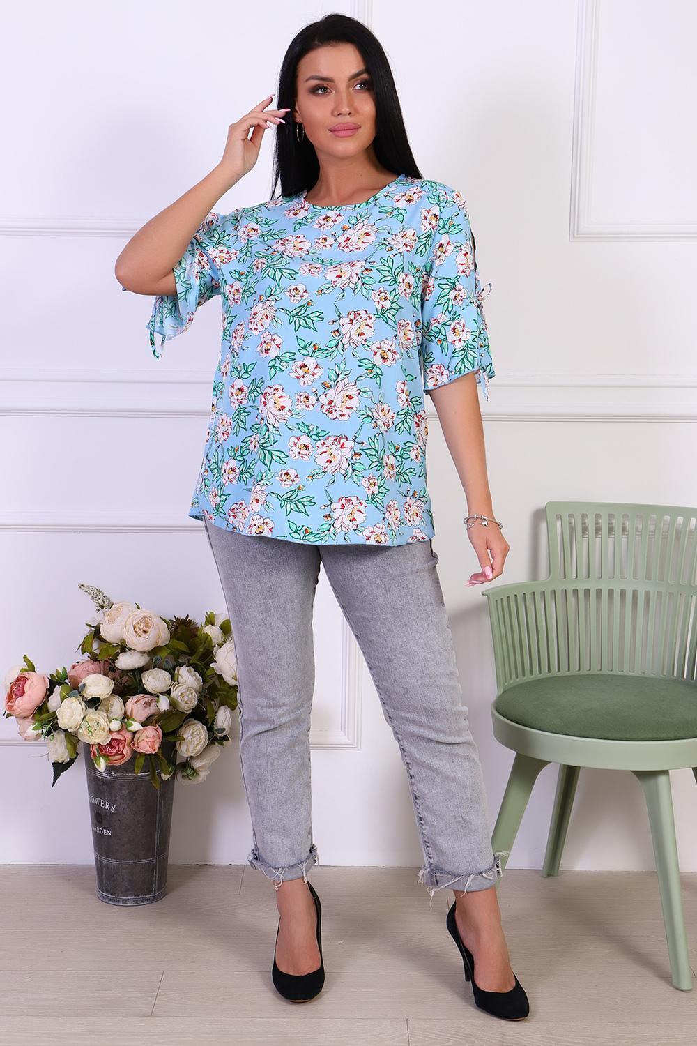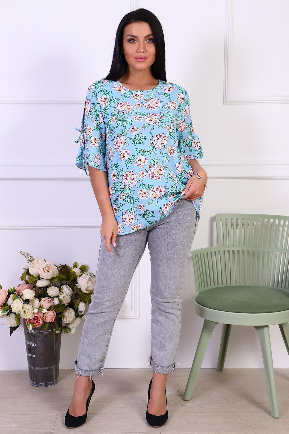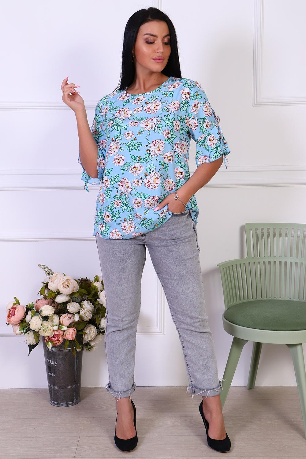 Романтичная туника с цветочным принтом из штапеля. Оригинальные рукава с завязками и воланами. Горловина туники окантована, низ рукавов и изделия обработан декоративной строчкой.