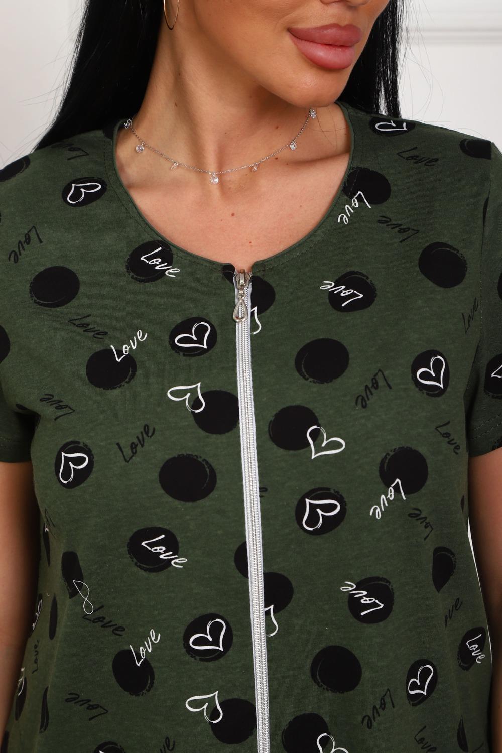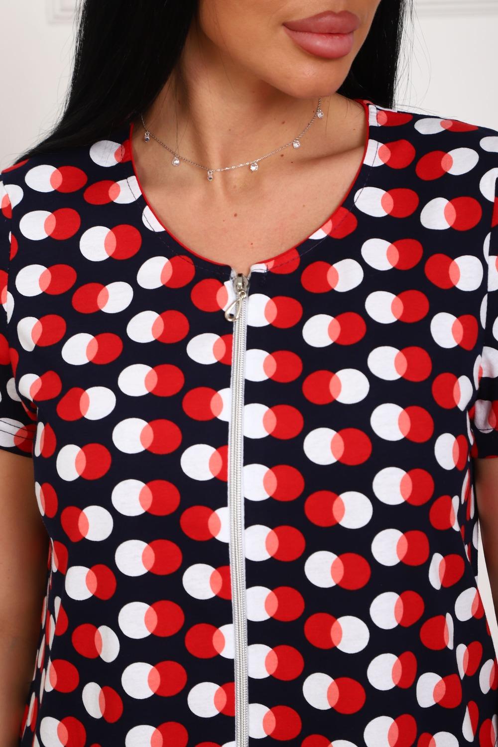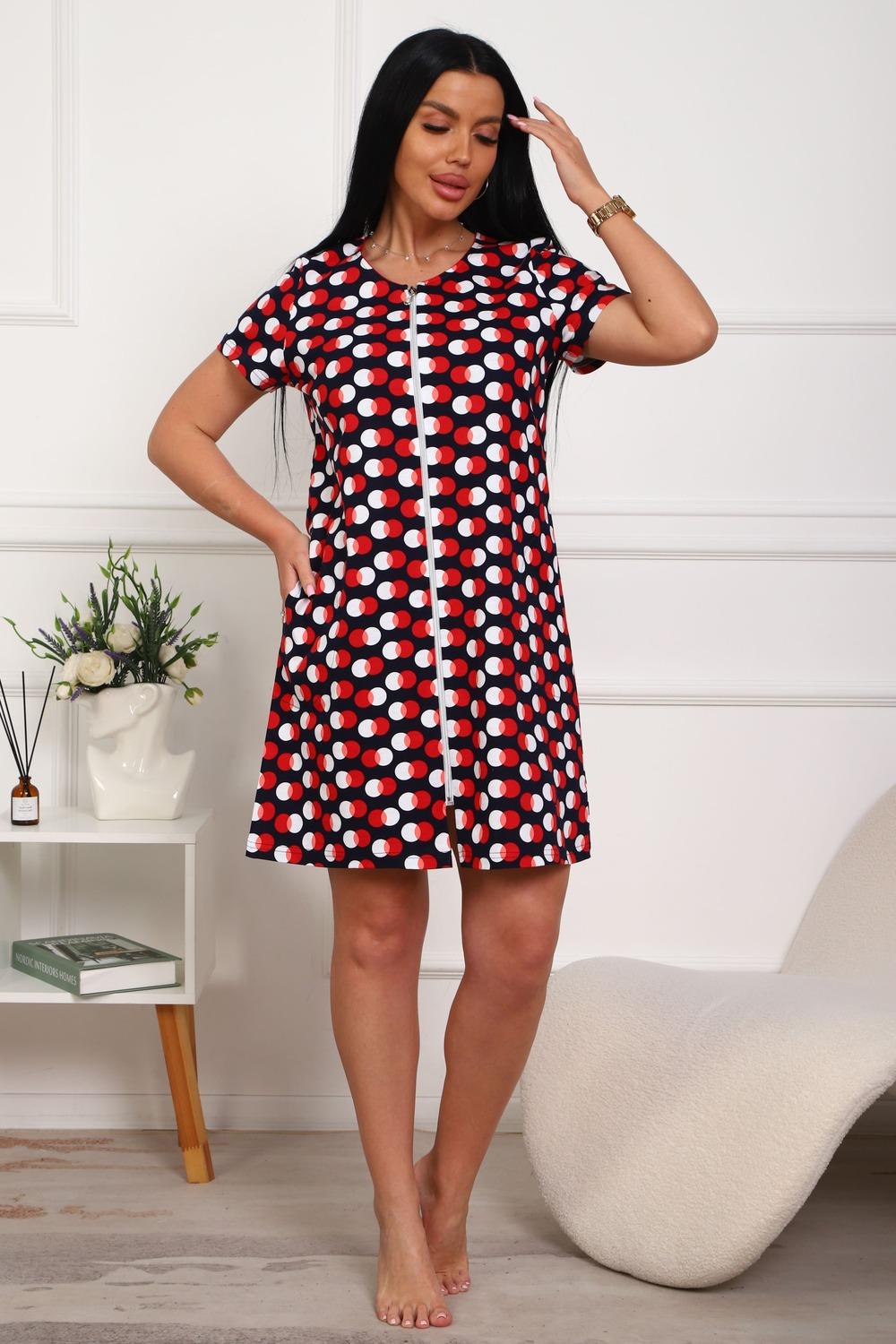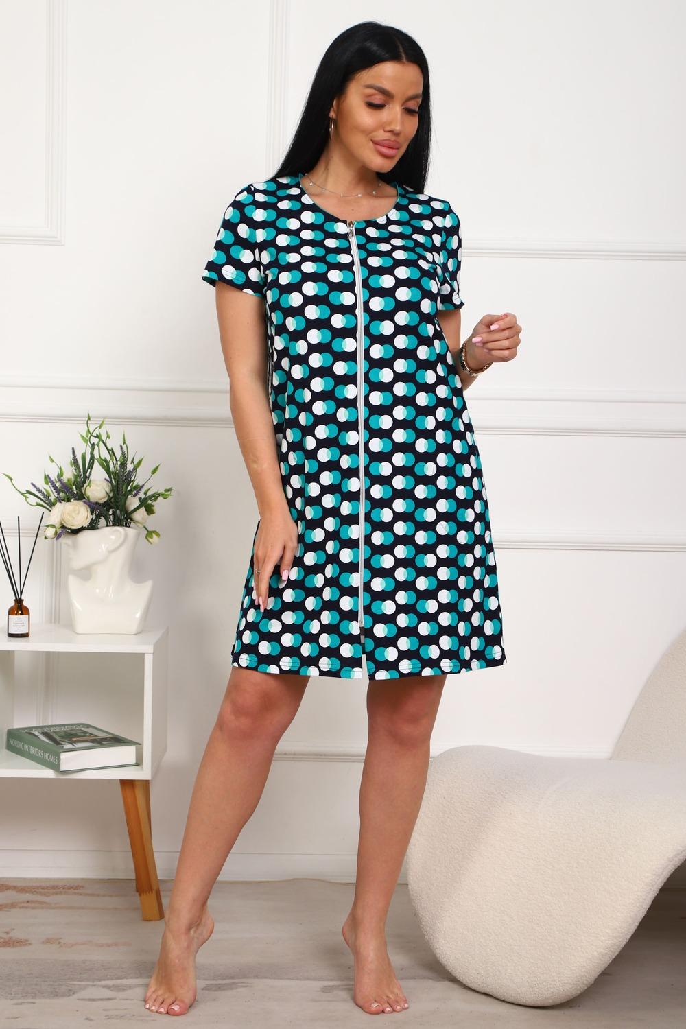 Халат молодежный из натурального, набивного, трикотажного полотна. Горловина круглая. Силуэт -расклешенный к низу. В боковых швах карманы. низ изделия прямой. рукав короткий. Застежка на тесьму молнию.