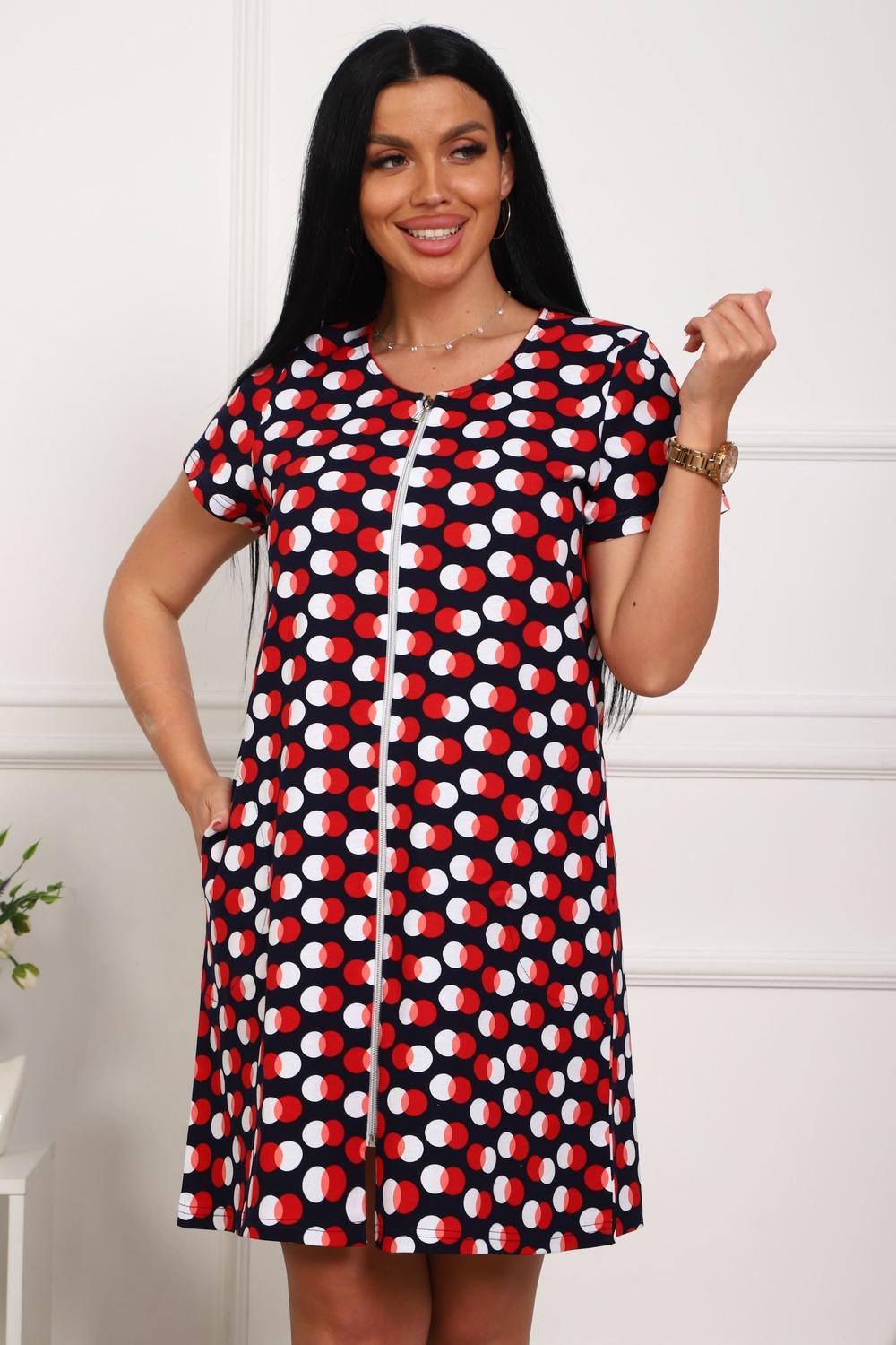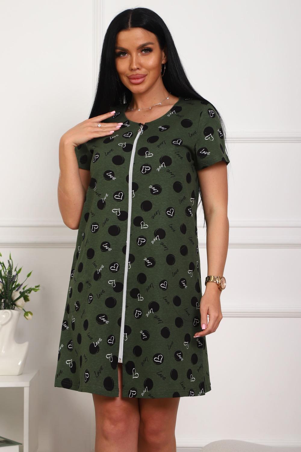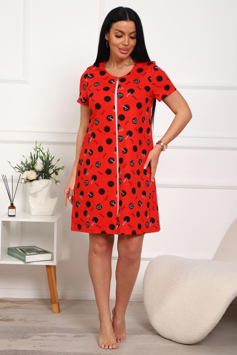 Халат молодежный из натурального, набивного, трикотажного полотна. Горловина круглая. Силуэт -расклешенный к низу. В боковых швах карманы. низ изделия прямой. рукав короткий. Застежка на тесьму молнию.