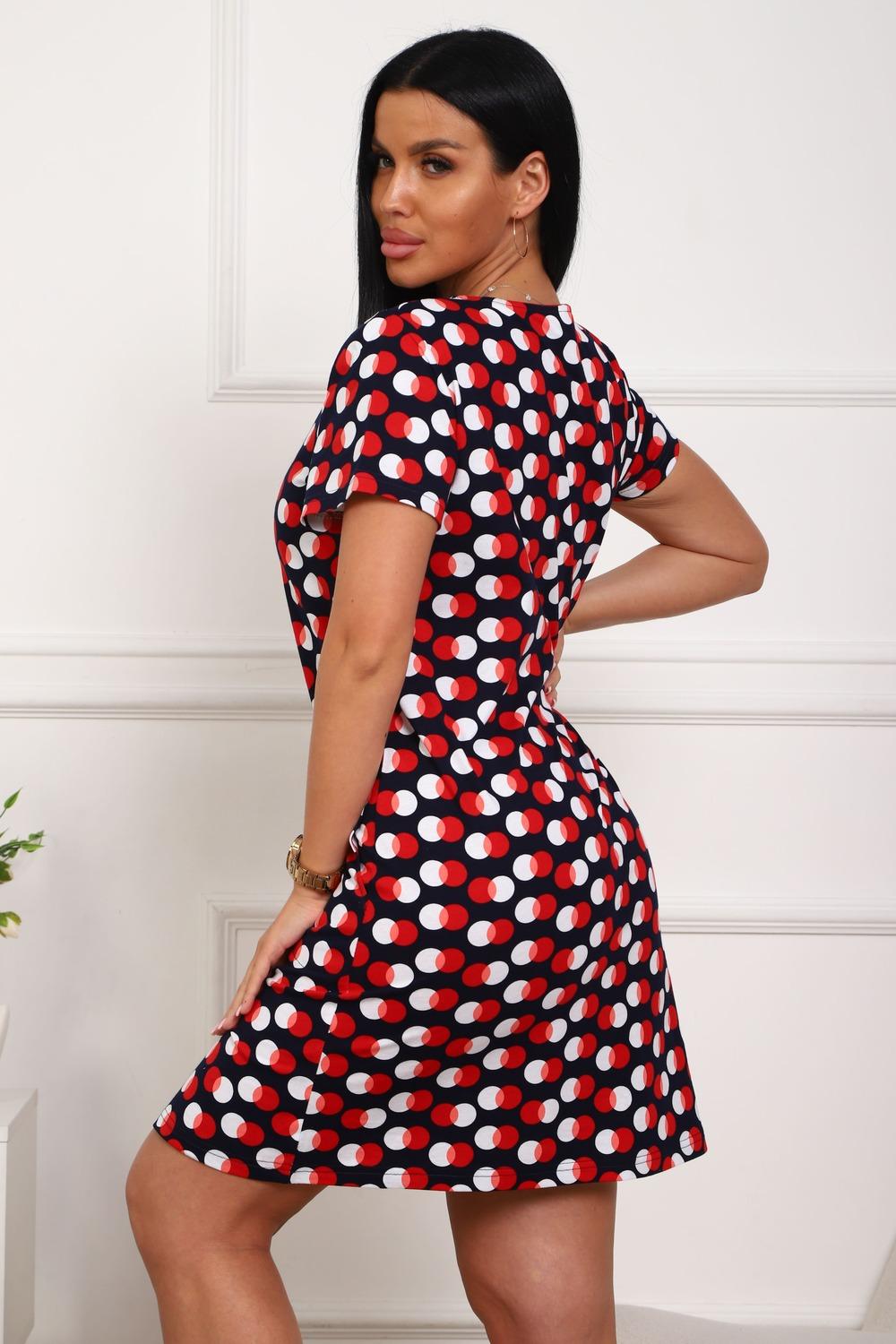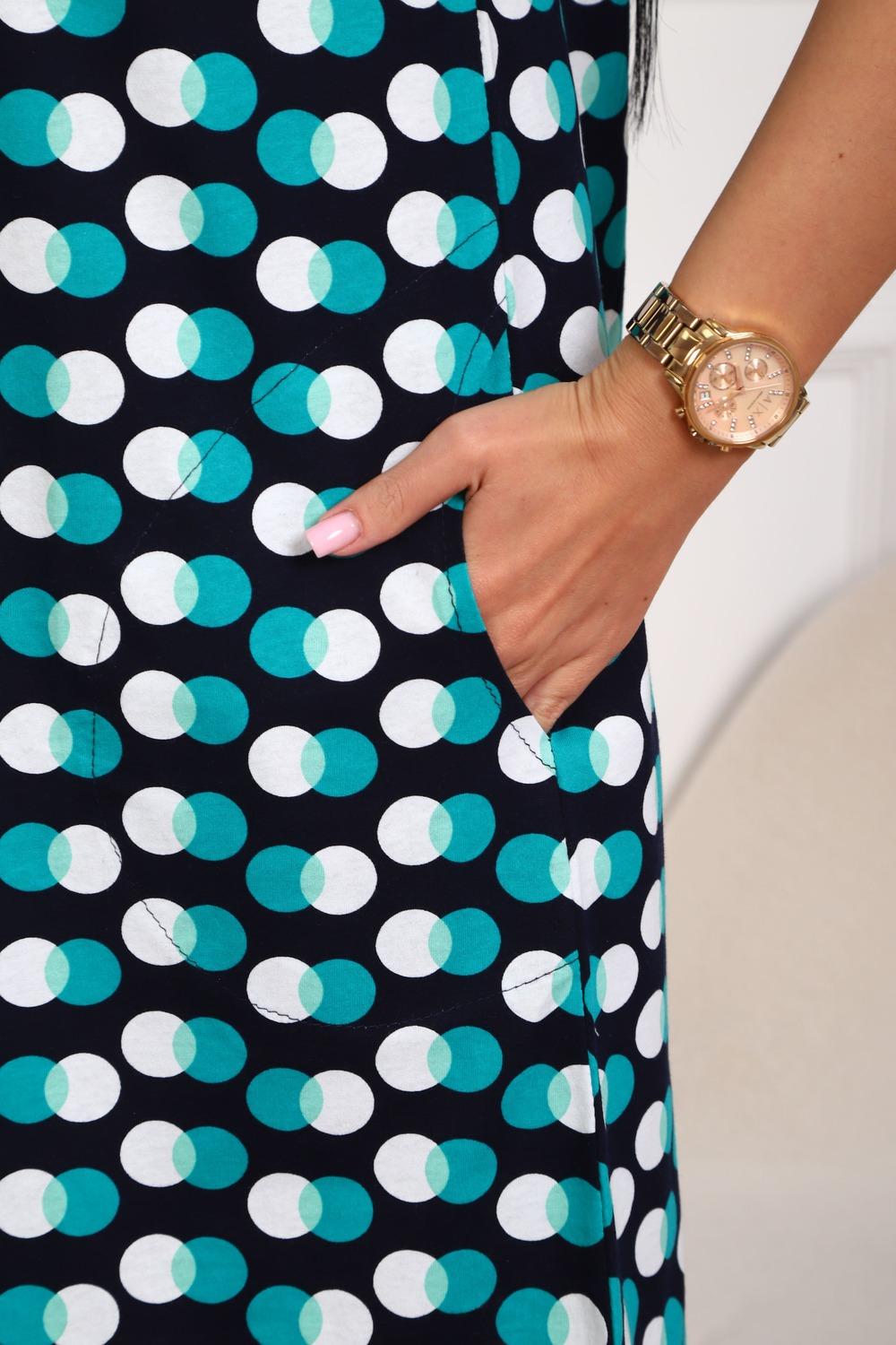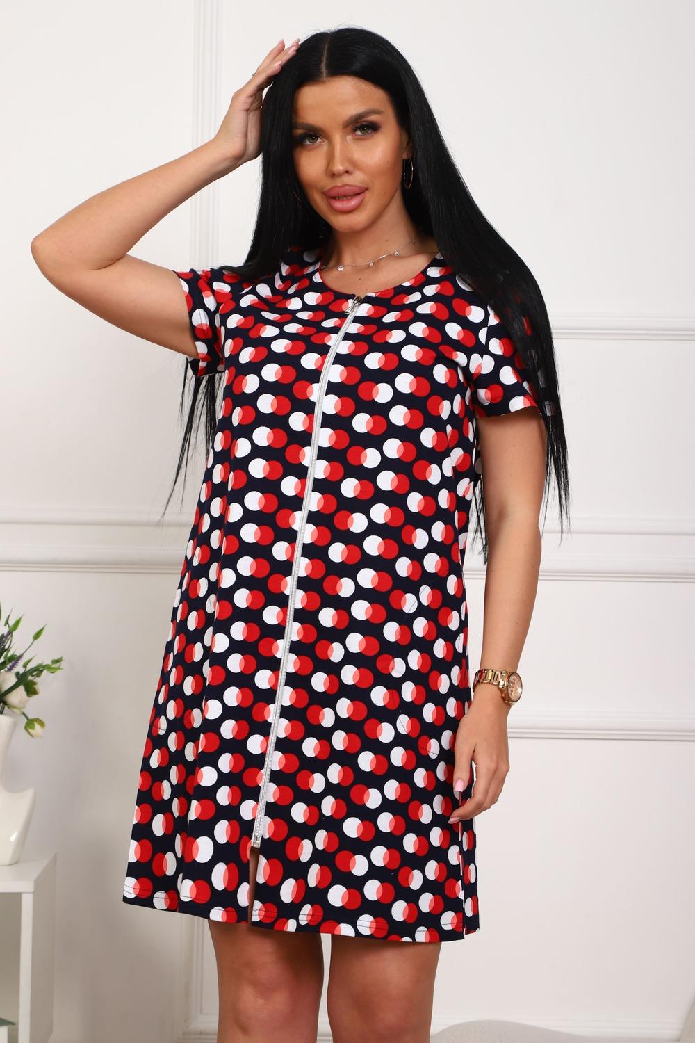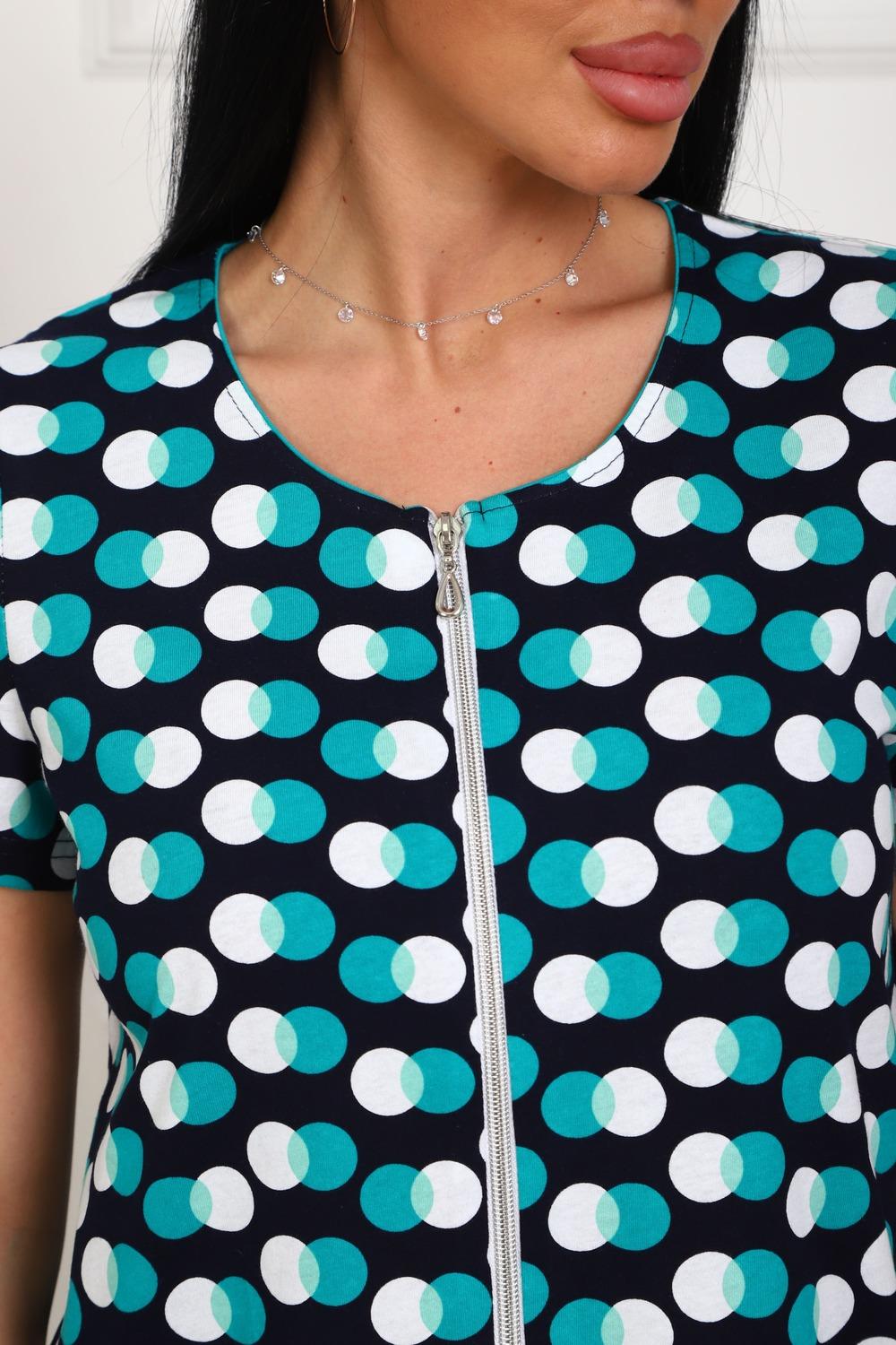 Халат молодежный из натурального, набивного, трикотажного полотна. Горловина круглая. Силуэт -расклешенный к низу. В боковых швах карманы. низ изделия прямой. рукав короткий. Застежка на тесьму молнию.