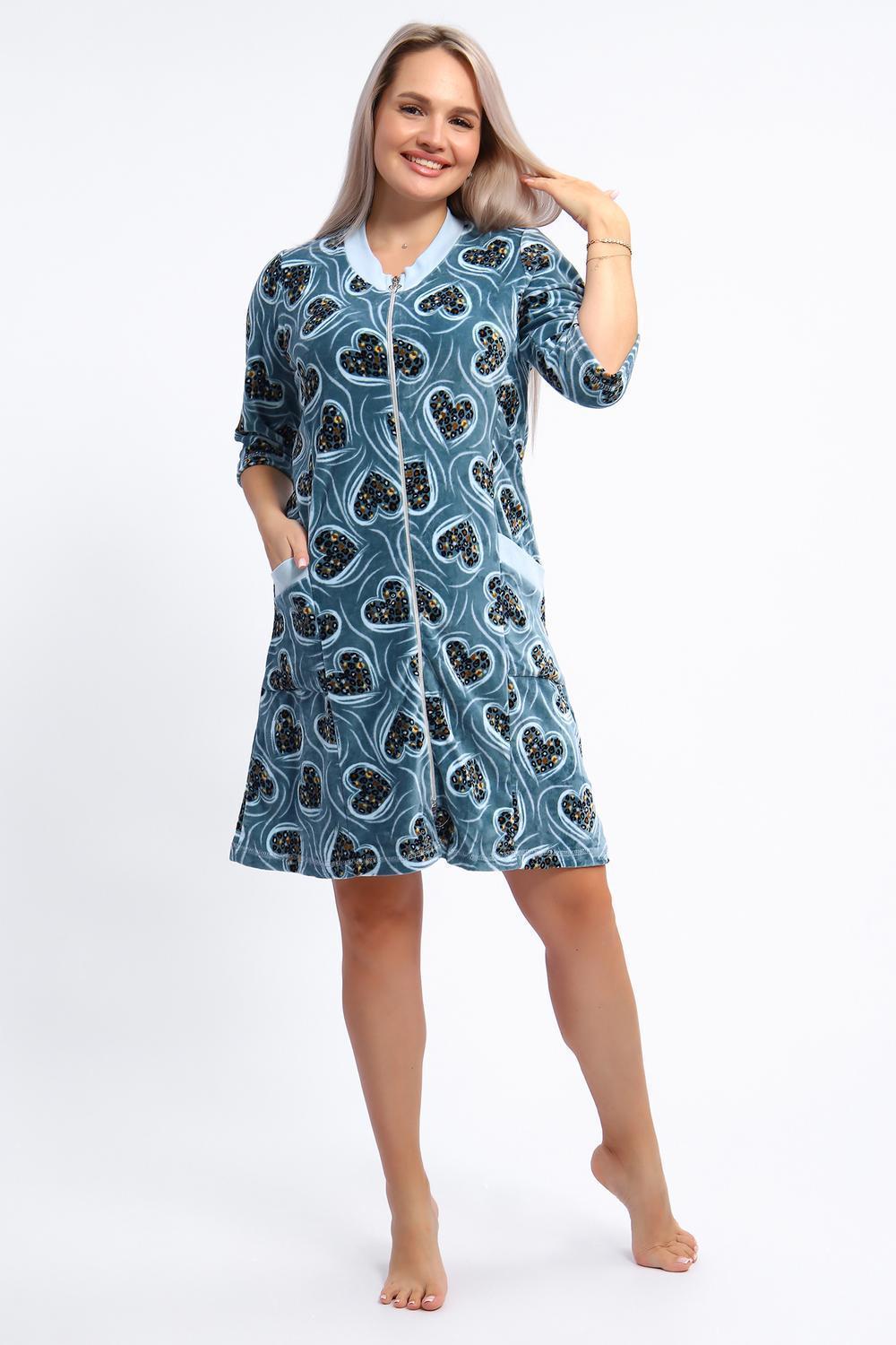 Халат женский на серебристой молнии выполнен из набивного велюра. Халат с рукавом 3/4, головина и карманы отделаны тканью контрастного цвета. Халат идеально подойдет для дома и отдыха.
