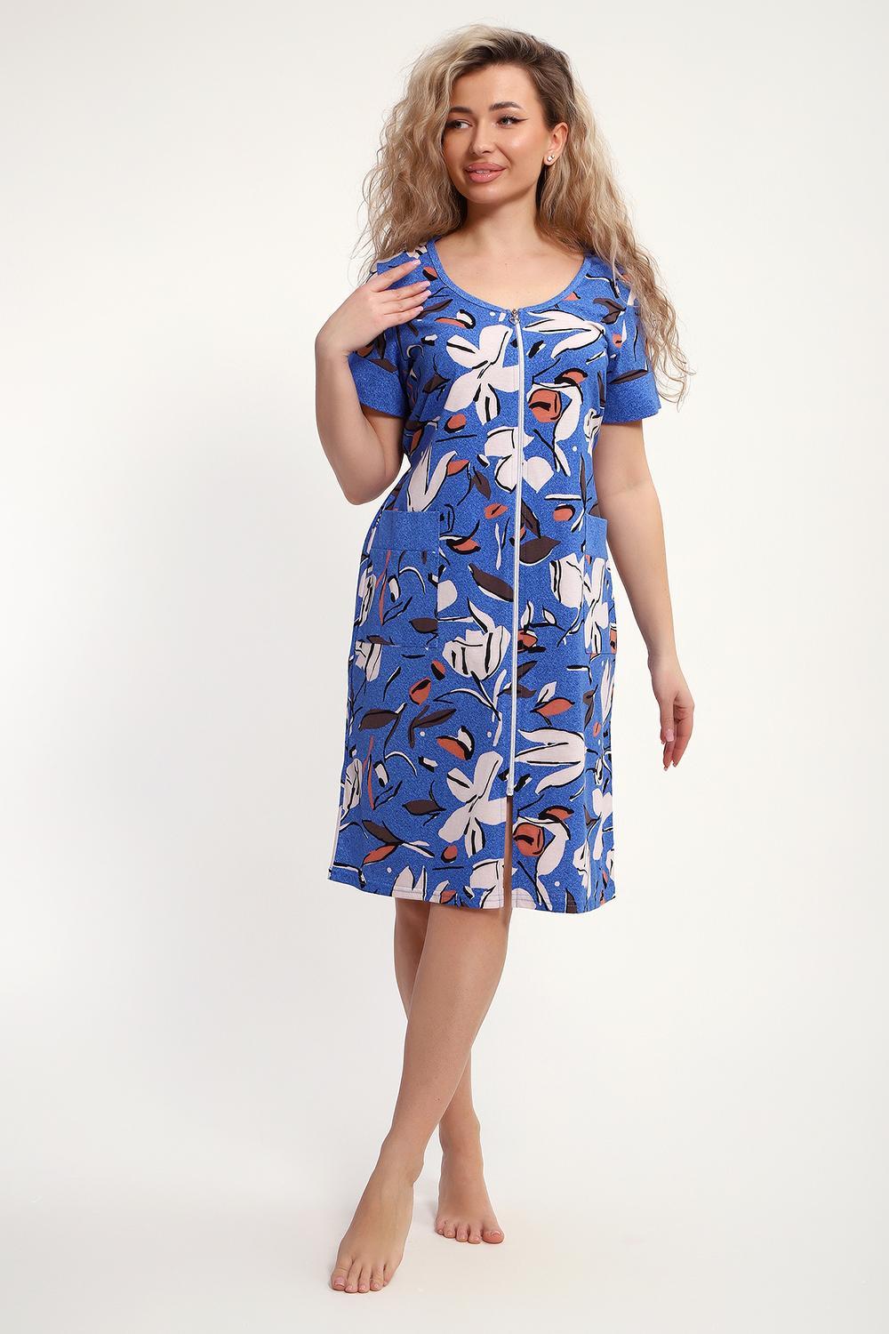 Женский халатик на молнии – самая распространенная и универсальная одежда для домашнего отдыха и хозяйственных хлопот. После трудного рабочего дня, приходя домой, первым делом хочется переодеться. И данная модель это идеальный вариант среди представительниц прекрасной половины человечества. Модель выполнена из 100% хлопчатобумажной ткани. Халат так же дополняет яркая отделка по рукавам и карманам. А пояс на линии талии поможет легко смоделировать женственный силуэт и при этом Вы будете чувствовать себя легко и непринуждённо. Данная модель прекрасно подойдёт для дома, дачи и отдыха, создавая по-настоящему яркий образ и хорошее настроение! Рост модели на фото 165см.