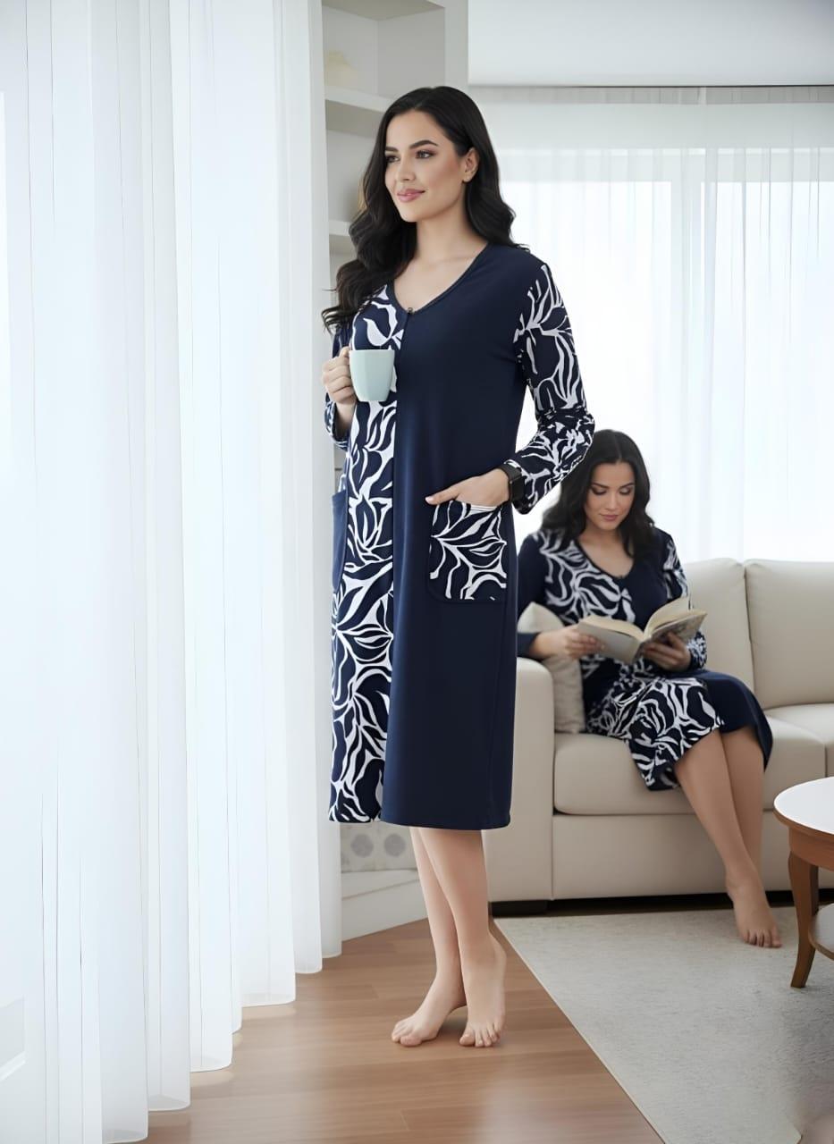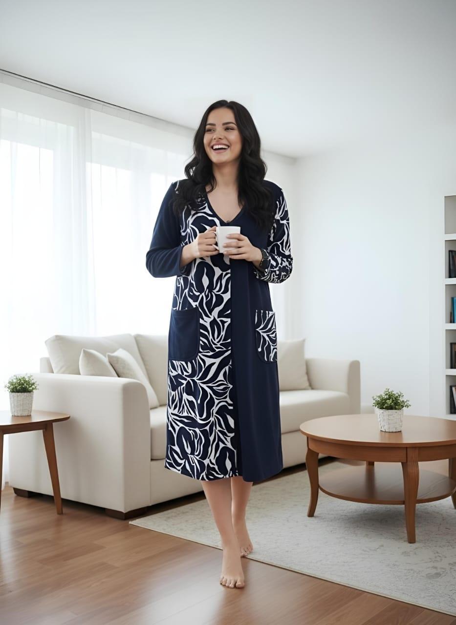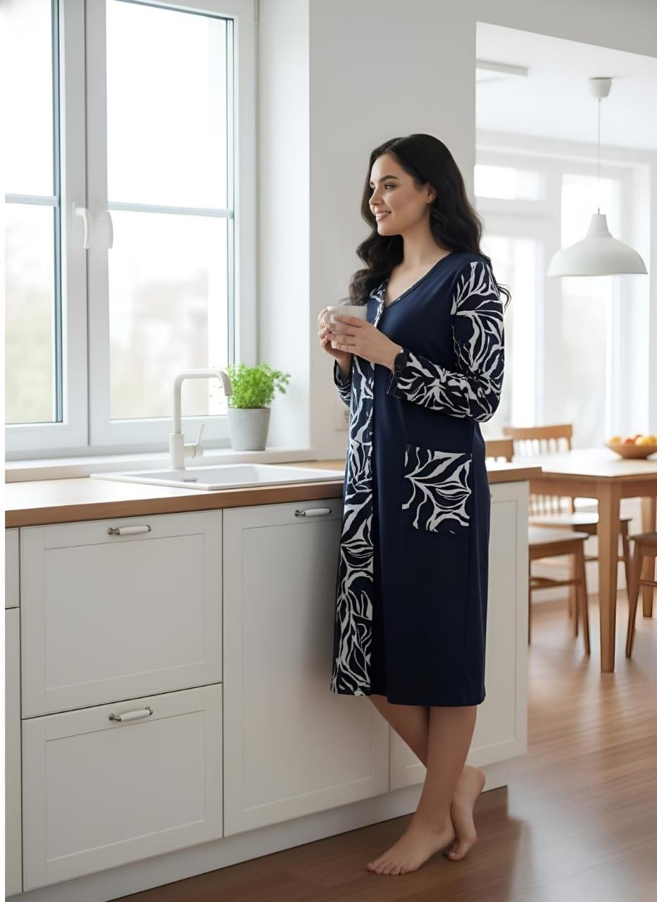Элегантный женский халат на молнии, выполненный в стиле домашнего платья. Глубокий темно-синий цвет гармонично сочетается с контрастным бело-черным растительным или абстрактным принтом, расположенным вертикальной вставкой спереди и на рукавах. Удобная длина миди, V-образный вырез и практичные карманы делают его идеальным для стильного и комфортного отдыха дома.