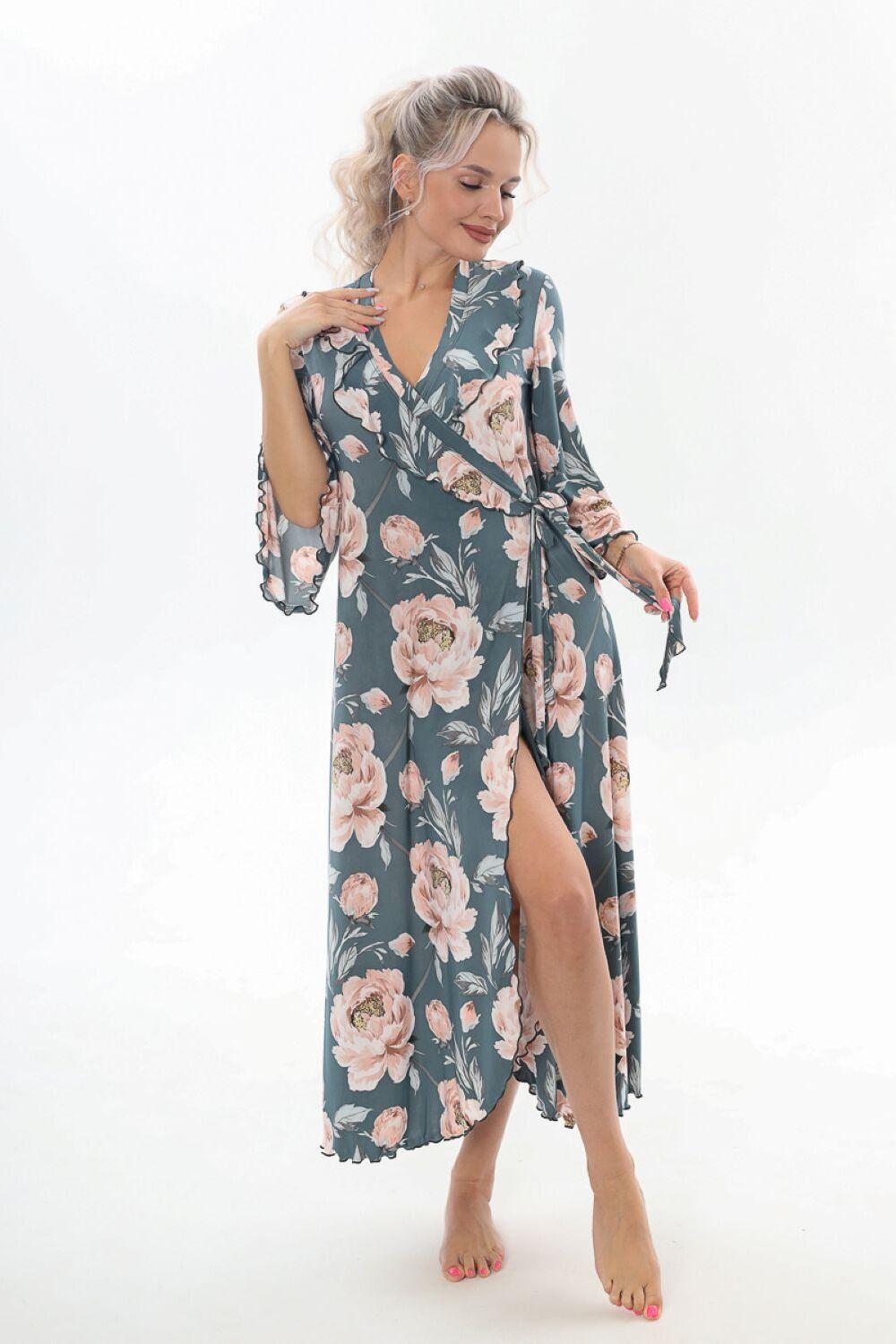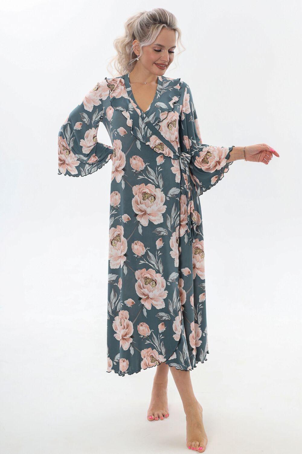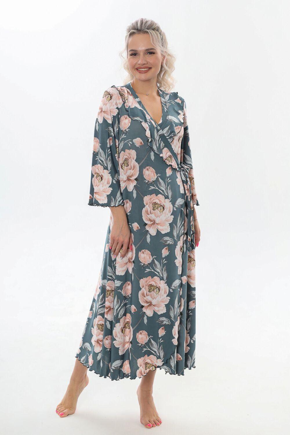 Халат домашний трикотажный женский - это отличное дополнение к вашей коллекции одежды для дома, созданной для тех, кто любит быть яркой и стильной, даже находясь в уютном уголке своего дома. Длинный халат с запахом имеет полуприлегающий силуэт, расклешенный к низу, длиной до середины икры. Линия талии завышена, что создает элегантный и изящный силуэт. На полочках, в области груди, расположены изящные воланы, которые добавляют изюминку к образу, подчеркивая женственность. Рукав в тачной, длиной 3/4, смотрится легко и элегантно, это делает его удобным в использовании. Подойдет как стройным женщинам, так и дамам с пышными формами. Возьмите халатик в роддом и будете самой элегантной мамочкой. Наш халат – это идеальный выбор для приятного времяпрепровождения в уютной обстановке. Сочетая в себе красоту и удобство, он идеально подходит для женщин, которые ценят качество во всем.