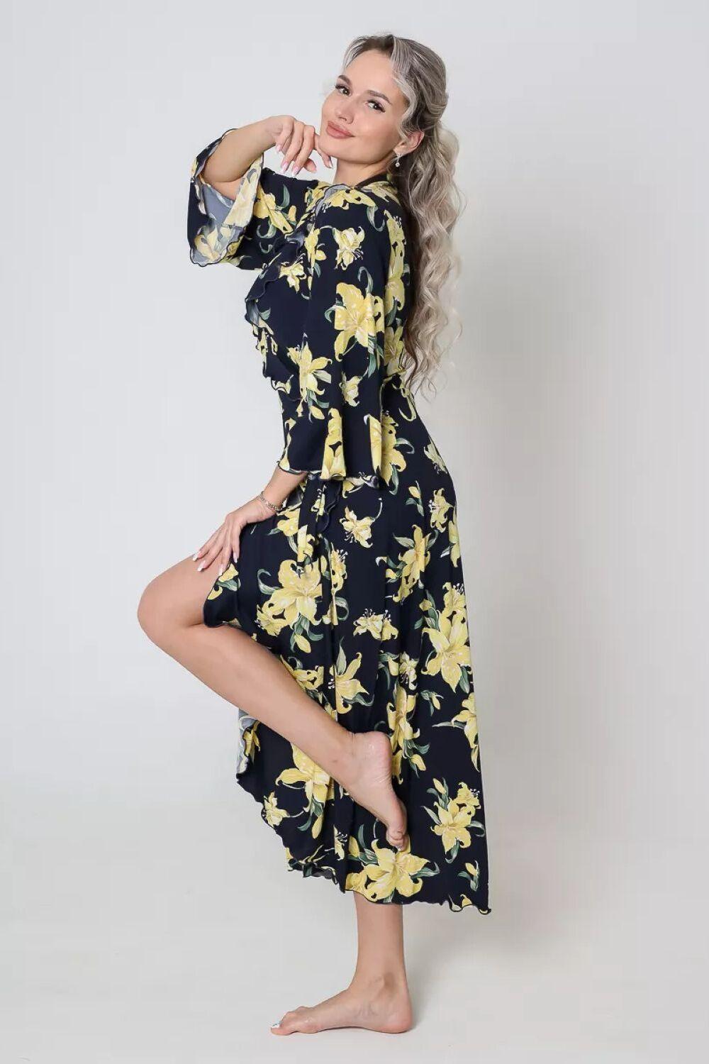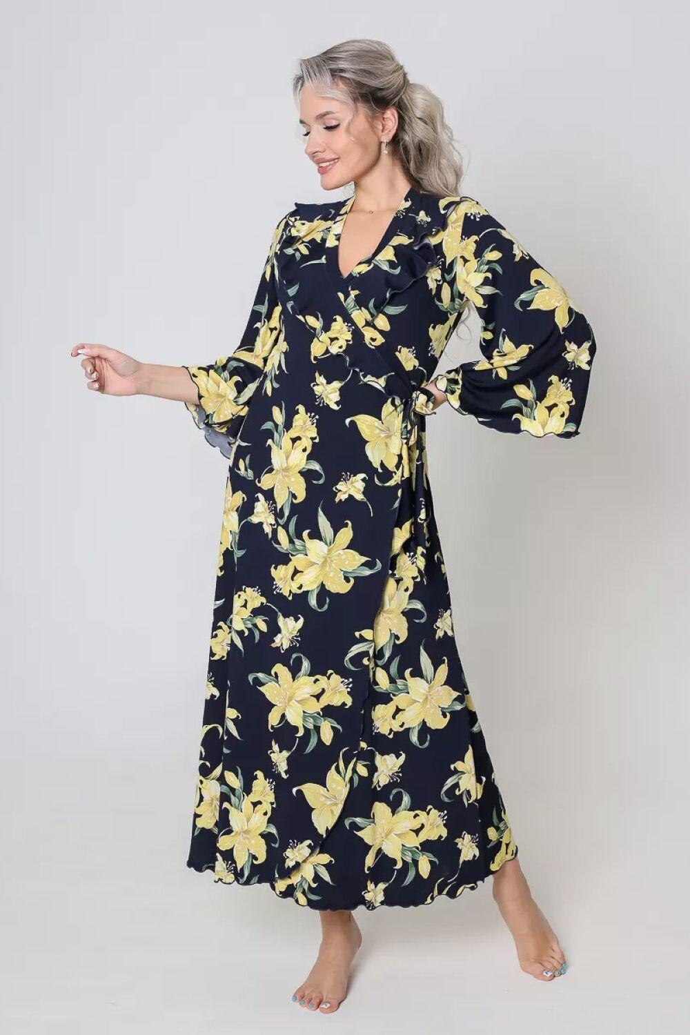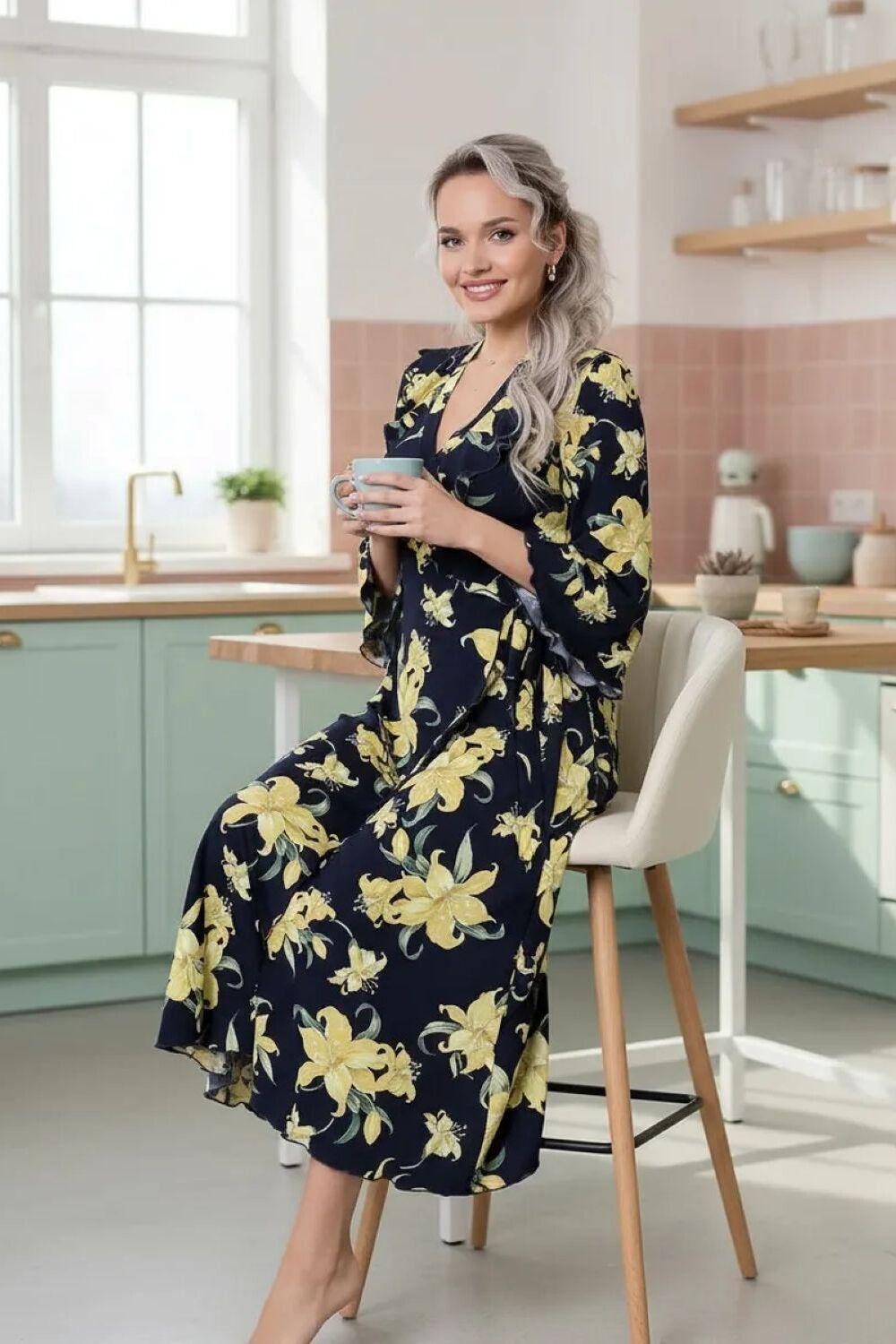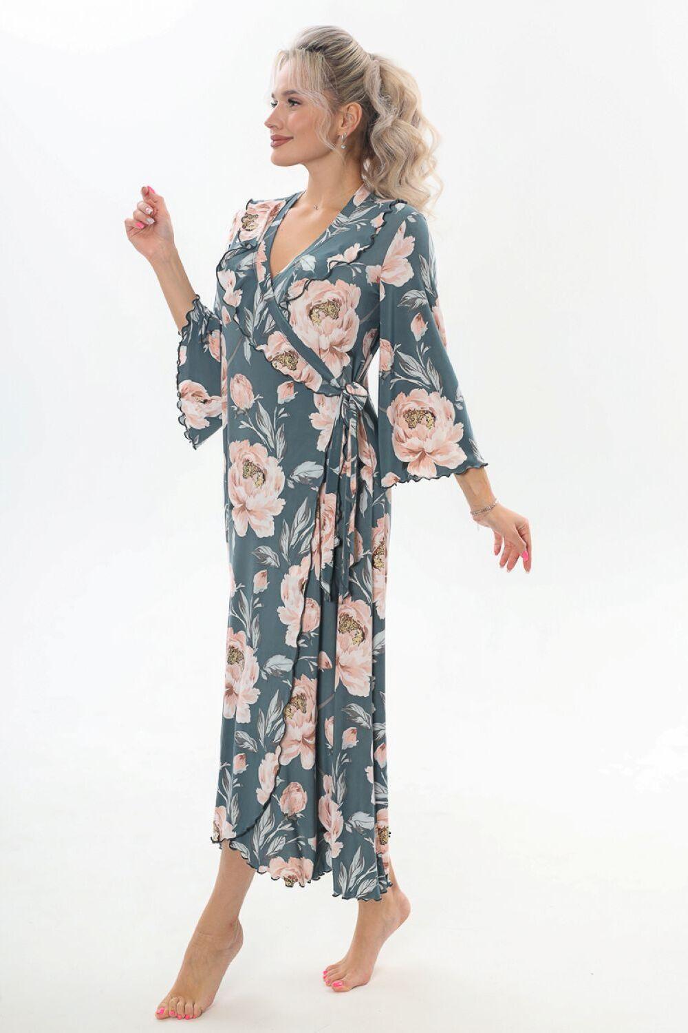 Халат домашний трикотажный женский - это отличное дополнение к вашей коллекции одежды для дома, созданной для тех, кто любит быть яркой и стильной, даже находясь в уютном уголке своего дома. Длинный халат с запахом имеет полуприлегающий силуэт, расклешенный к низу, длиной до середины икры. Линия талии завышена, что создает элегантный и изящный силуэт. На полочках, в области груди, расположены изящные воланы, которые добавляют изюминку к образу, подчеркивая женственность. Рукав в тачной, длиной 3/4, смотрится легко и элегантно, это делает его удобным в использовании. Подойдет как стройным женщинам, так и дамам с пышными формами. Возьмите халатик в роддом и будете самой элегантной мамочкой. Наш халат – это идеальный выбор для приятного времяпрепровождения в уютной обстановке. Сочетая в себе красоту и удобство, он идеально подходит для женщин, которые ценят качество во всем.