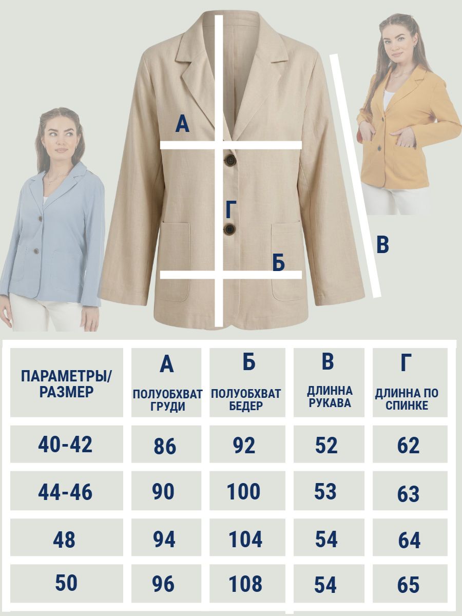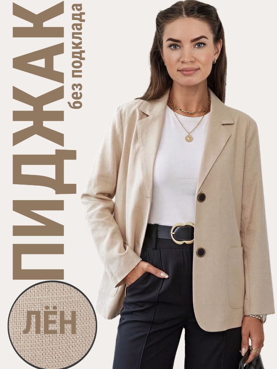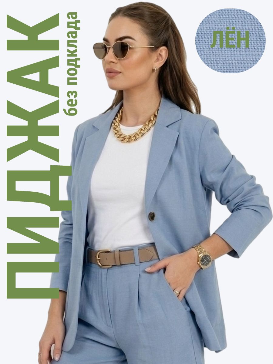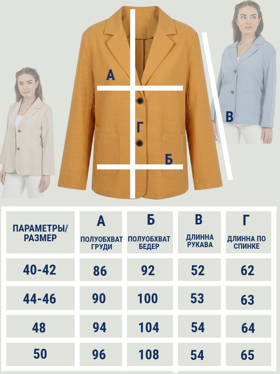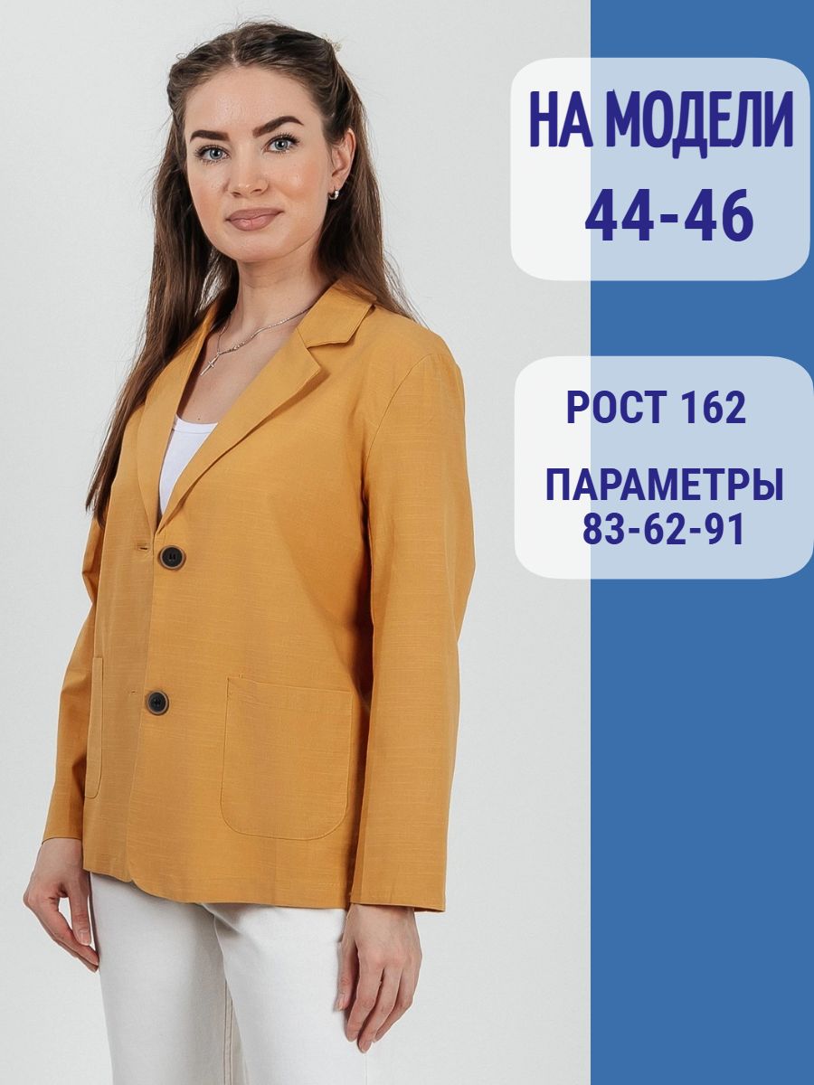 Лёгкий женский пиджак без подклада станет незаменимой вещью в весенне‑летнем гардеробе. Благодаря отсутствию подклада модель особенно комфортна: она не стесняет движений и не создаёт лишнего тепла даже в жаркую погоду. Классический дизайн с чёткими линиями и лаконичными деталями легко вписать в любой стиль: наденьте его с офисной юбкой для строгого образа или с джинсовыми шортами для прогулки. Застёжка на пуговицы, удобные карманы и продуманный крой делают эту модель практичной и функциональной. Пиджак гармонично сочетается с разными элементами гардероба — от платьев до брюк. Уход прост: деликатная стирка при 30∘C и аккуратная глажка.