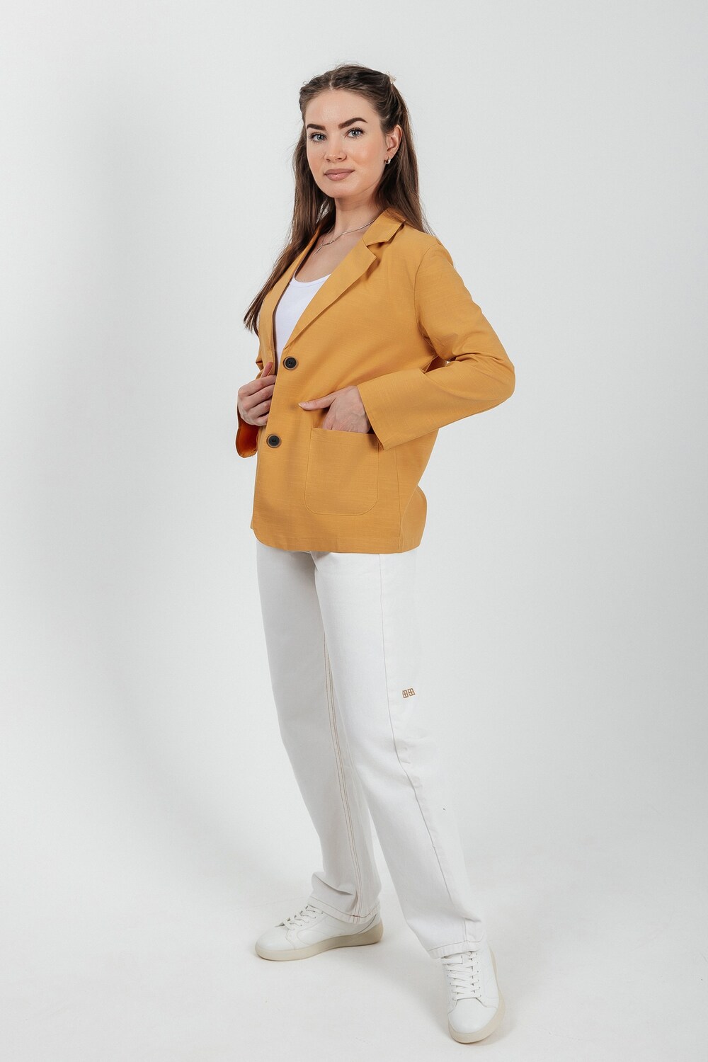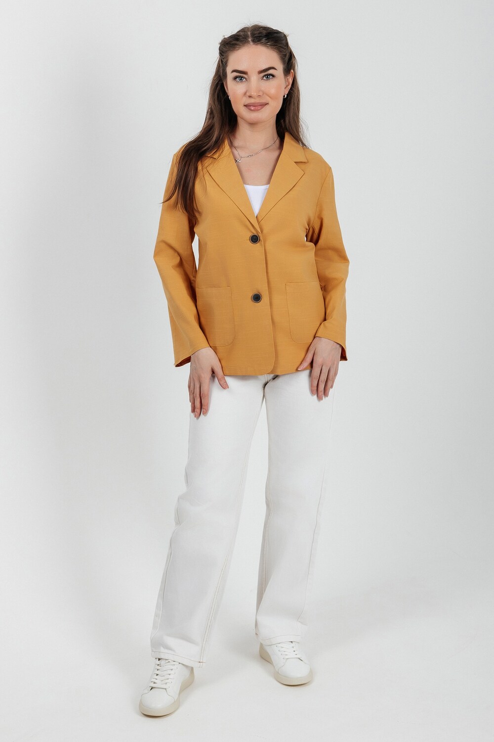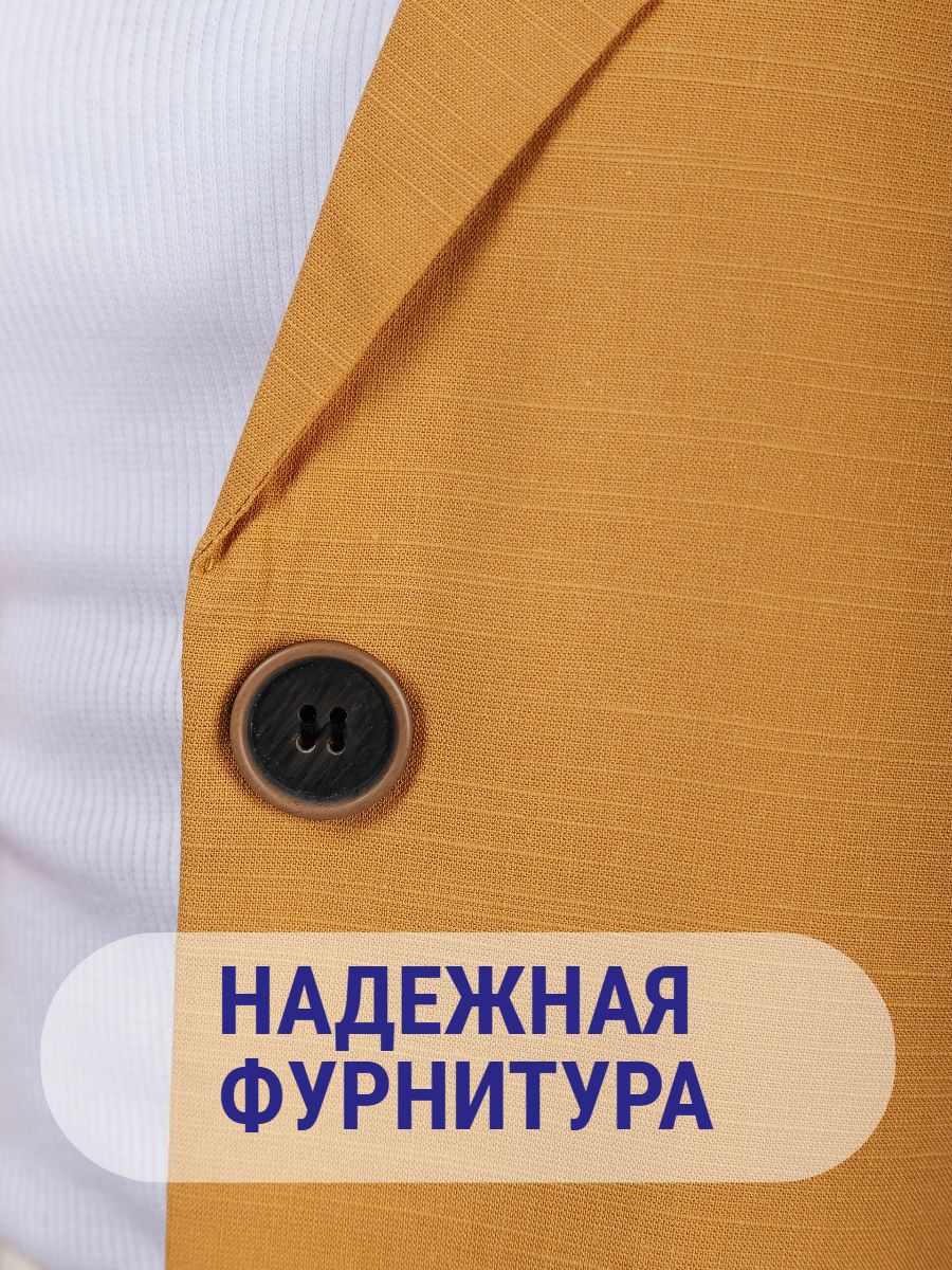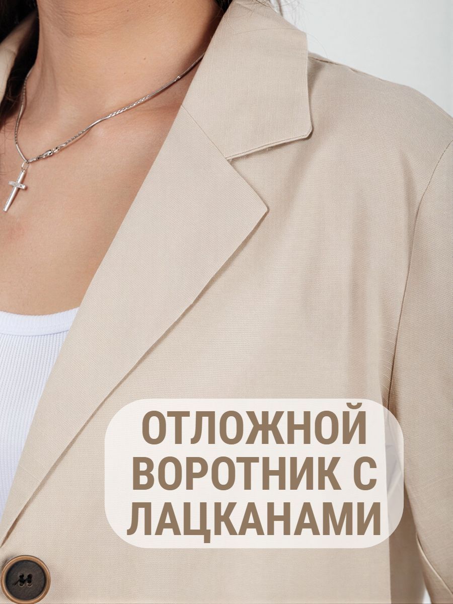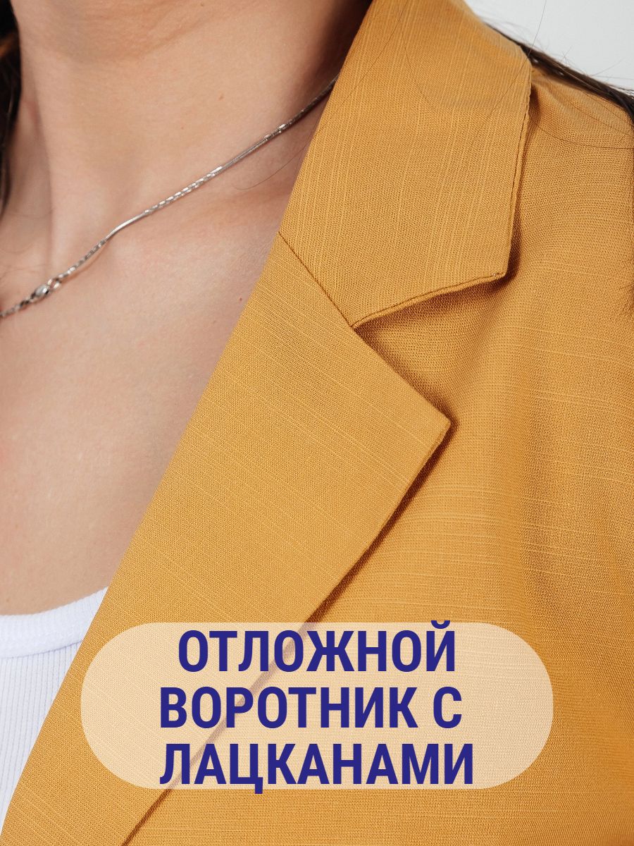 Лёгкий женский пиджак без подклада станет незаменимой вещью в весенне‑летнем гардеробе. Благодаря отсутствию подклада модель особенно комфортна: она не стесняет движений и не создаёт лишнего тепла даже в жаркую погоду. Классический дизайн с чёткими линиями и лаконичными деталями легко вписать в любой стиль: наденьте его с офисной юбкой для строгого образа или с джинсовыми шортами для прогулки. Застёжка на пуговицы, удобные карманы и продуманный крой делают эту модель практичной и функциональной. Пиджак гармонично сочетается с разными элементами гардероба — от платьев до брюк. Уход прост: деликатная стирка при 30∘C и аккуратная глажка.