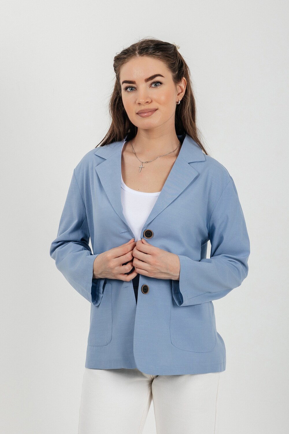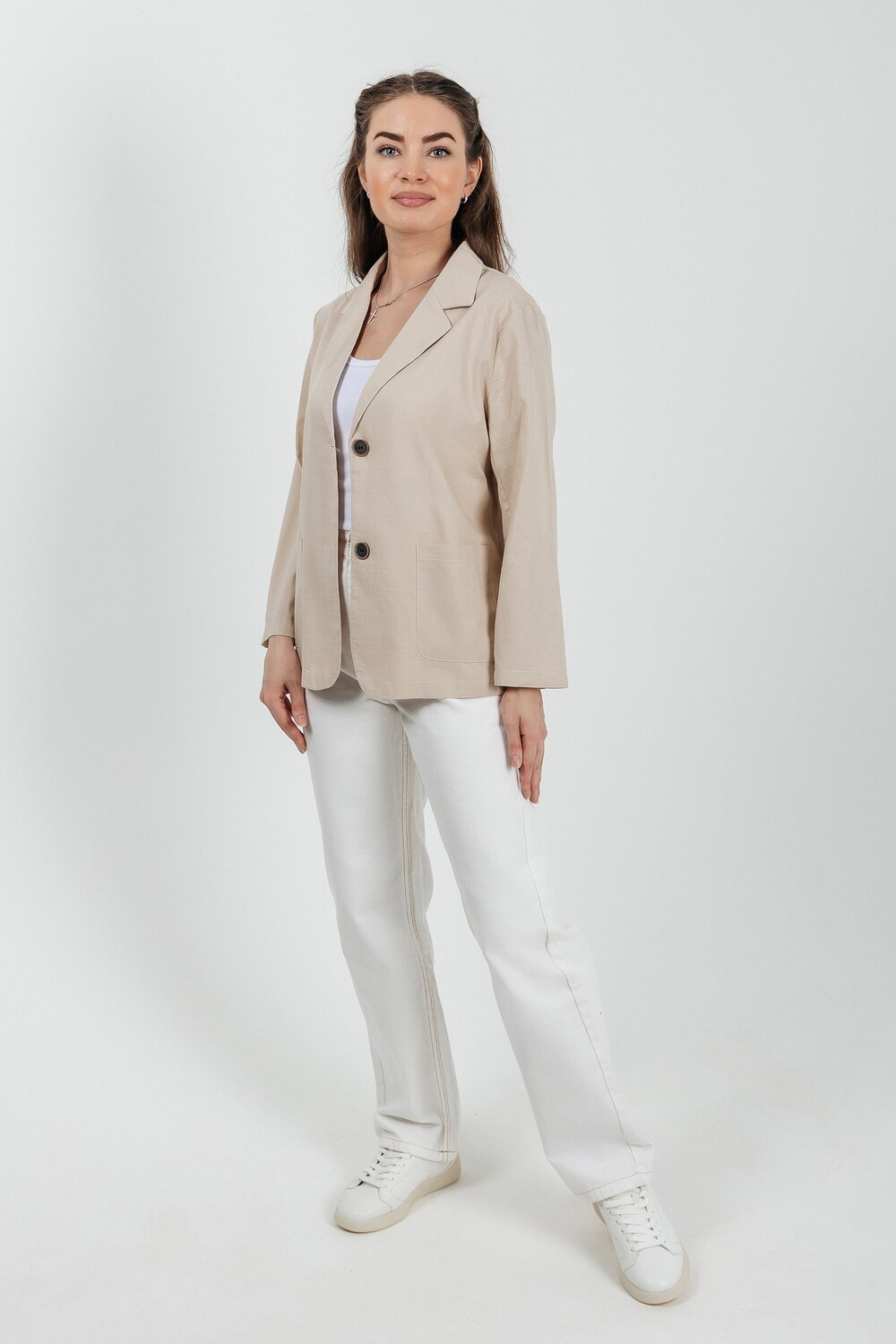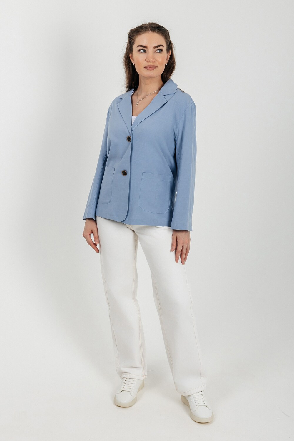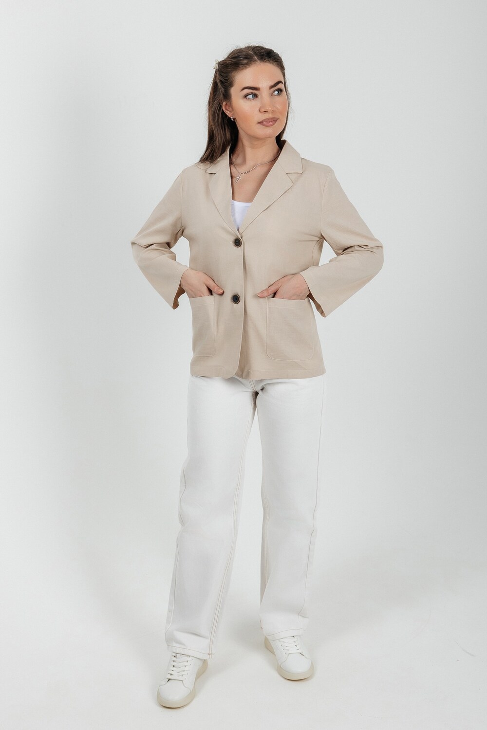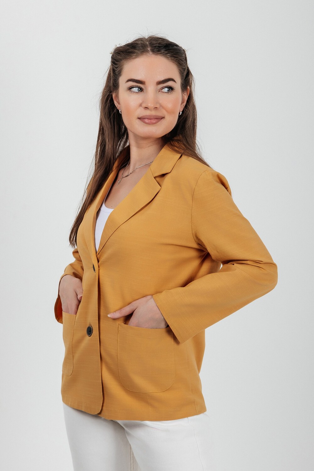 Лёгкий женский пиджак без подклада станет незаменимой вещью в весенне‑летнем гардеробе. Благодаря отсутствию подклада модель особенно комфортна: она не стесняет движений и не создаёт лишнего тепла даже в жаркую погоду. Классический дизайн с чёткими линиями и лаконичными деталями легко вписать в любой стиль: наденьте его с офисной юбкой для строгого образа или с джинсовыми шортами для прогулки. Застёжка на пуговицы, удобные карманы и продуманный крой делают эту модель практичной и функциональной. Пиджак гармонично сочетается с разными элементами гардероба — от платьев до брюк. Уход прост: деликатная стирка при 30∘C и аккуратная глажка.