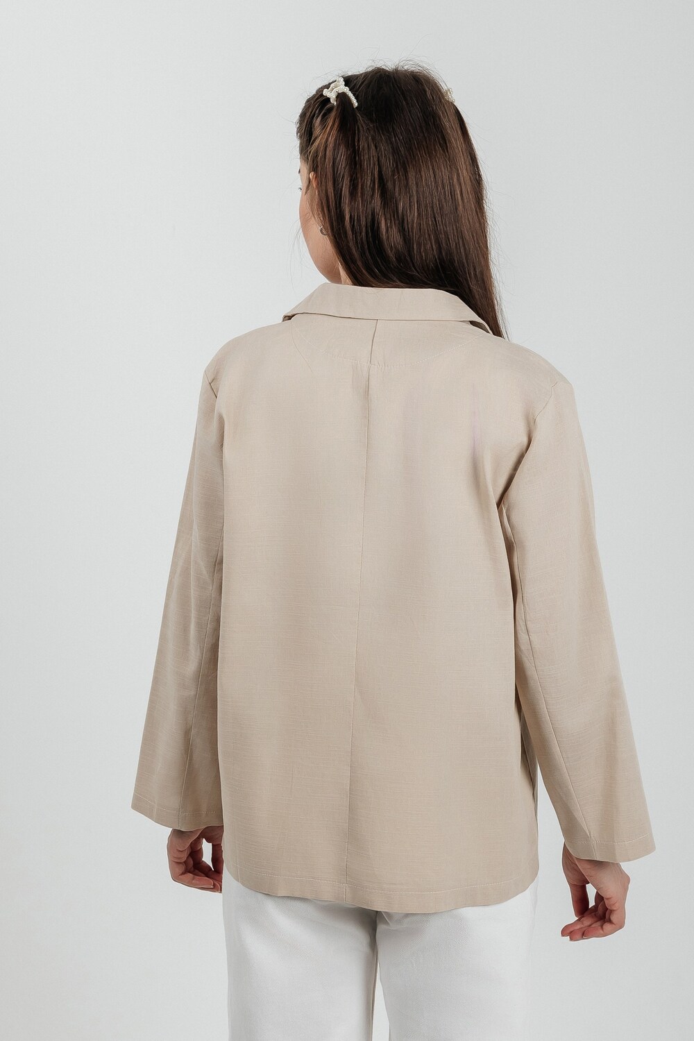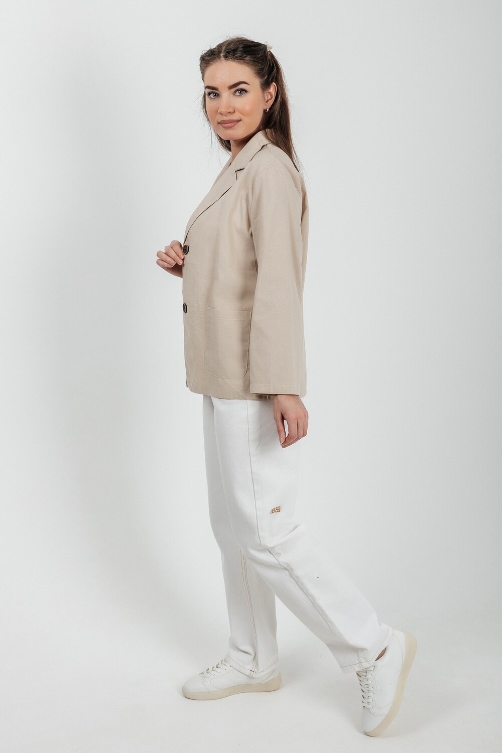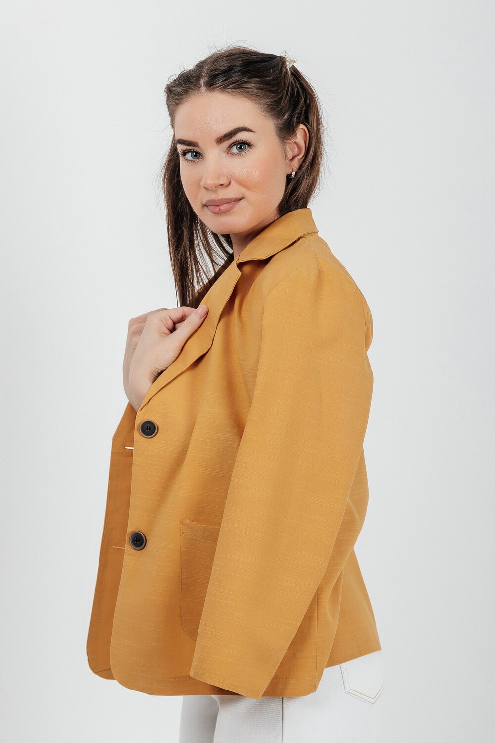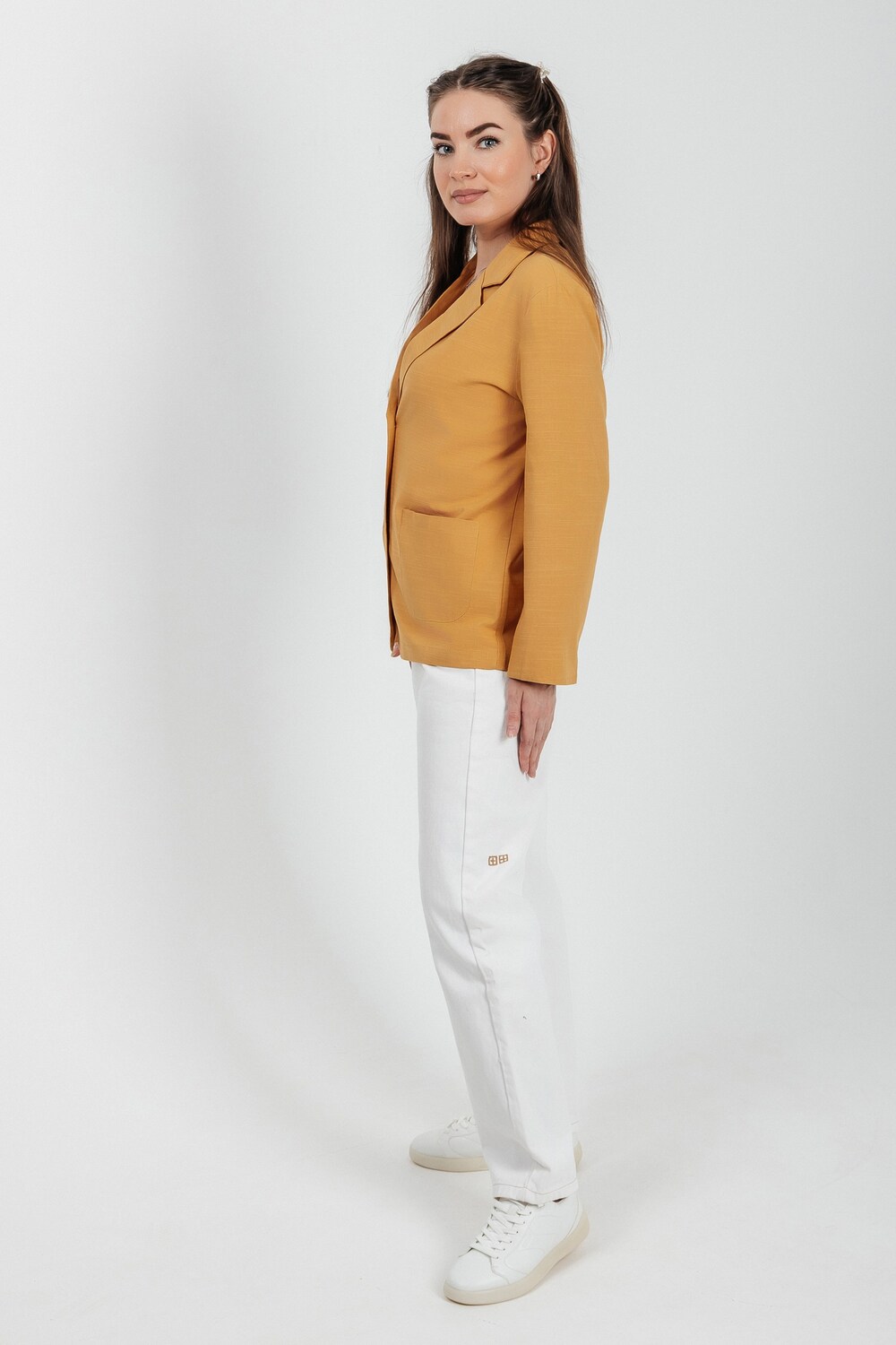 Лёгкий женский пиджак без подклада станет незаменимой вещью в весенне‑летнем гардеробе. Благодаря отсутствию подклада модель особенно комфортна: она не стесняет движений и не создаёт лишнего тепла даже в жаркую погоду. Классический дизайн с чёткими линиями и лаконичными деталями легко вписать в любой стиль: наденьте его с офисной юбкой для строгого образа или с джинсовыми шортами для прогулки. Застёжка на пуговицы, удобные карманы и продуманный крой делают эту модель практичной и функциональной. Пиджак гармонично сочетается с разными элементами гардероба — от платьев до брюк. Уход прост: деликатная стирка при 30∘C и аккуратная глажка.