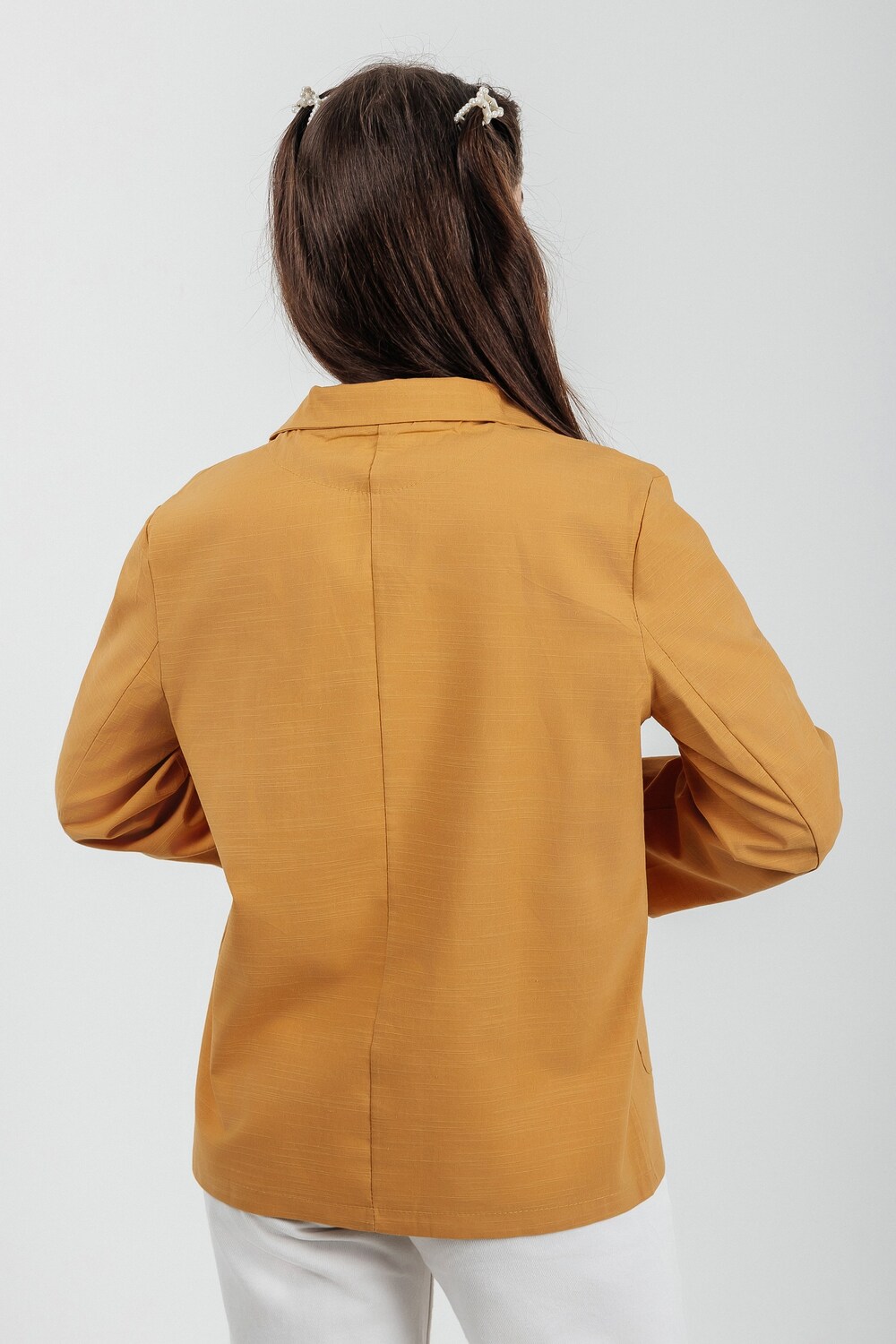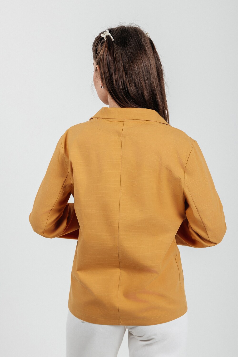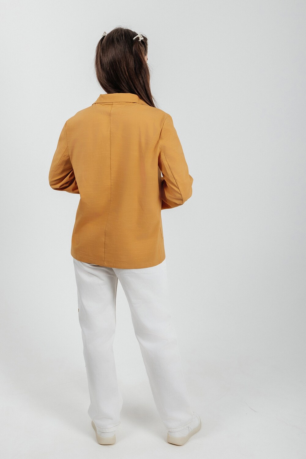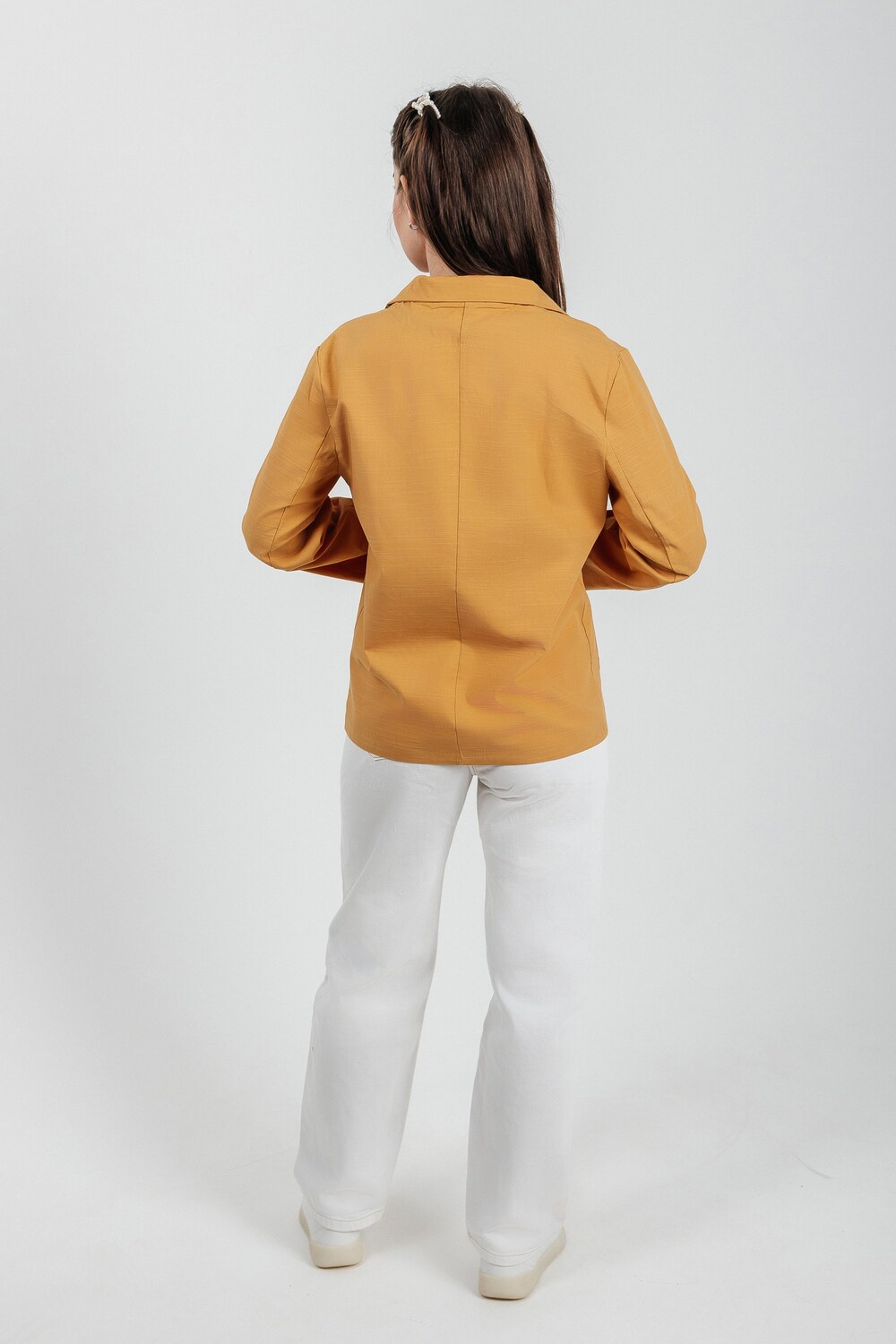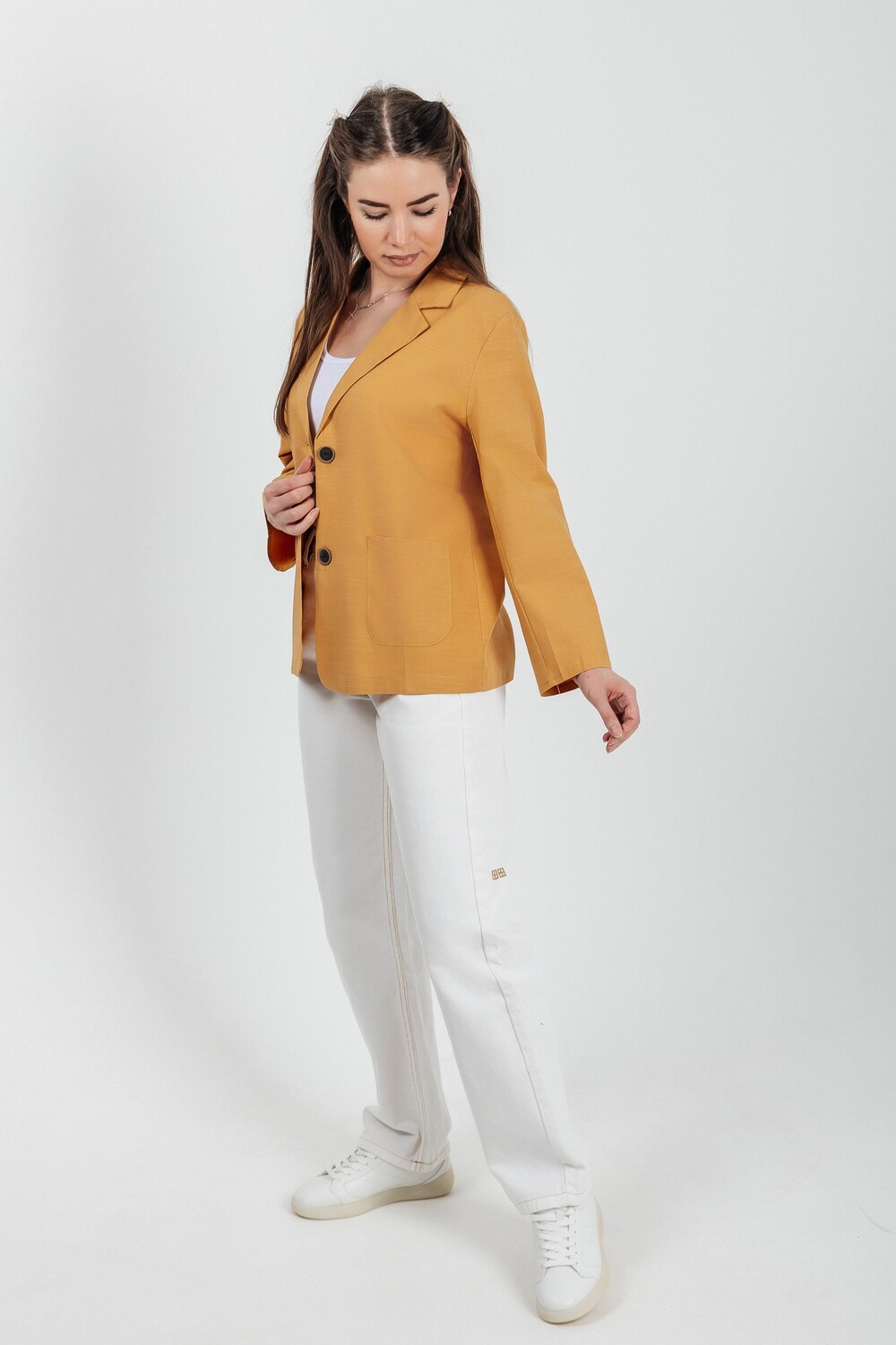 Лёгкий женский пиджак без подклада станет незаменимой вещью в весенне‑летнем гардеробе. Благодаря отсутствию подклада модель особенно комфортна: она не стесняет движений и не создаёт лишнего тепла даже в жаркую погоду. Классический дизайн с чёткими линиями и лаконичными деталями легко вписать в любой стиль: наденьте его с офисной юбкой для строгого образа или с джинсовыми шортами для прогулки. Застёжка на пуговицы, удобные карманы и продуманный крой делают эту модель практичной и функциональной. Пиджак гармонично сочетается с разными элементами гардероба — от платьев до брюк. Уход прост: деликатная стирка при 30∘C и аккуратная глажка.