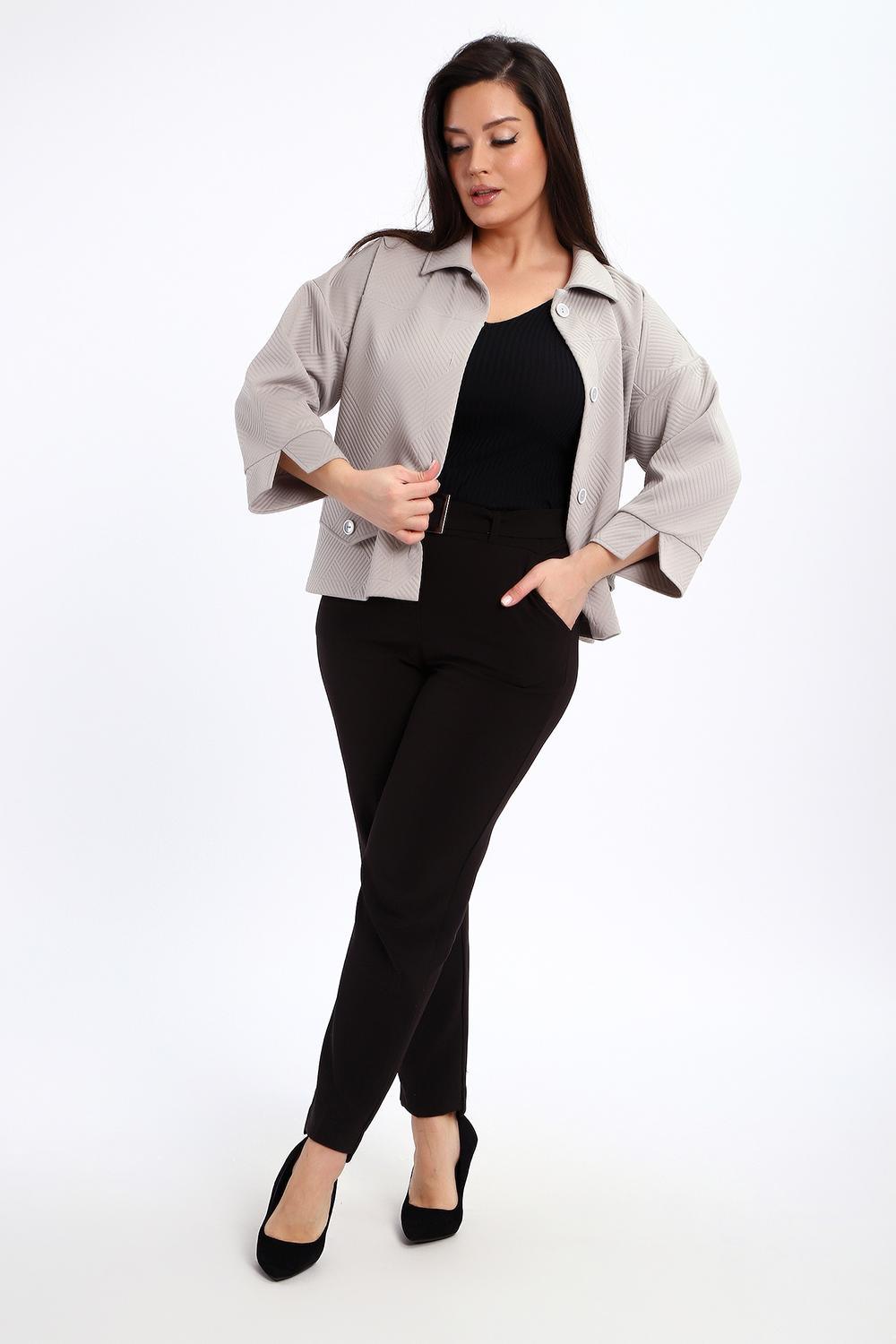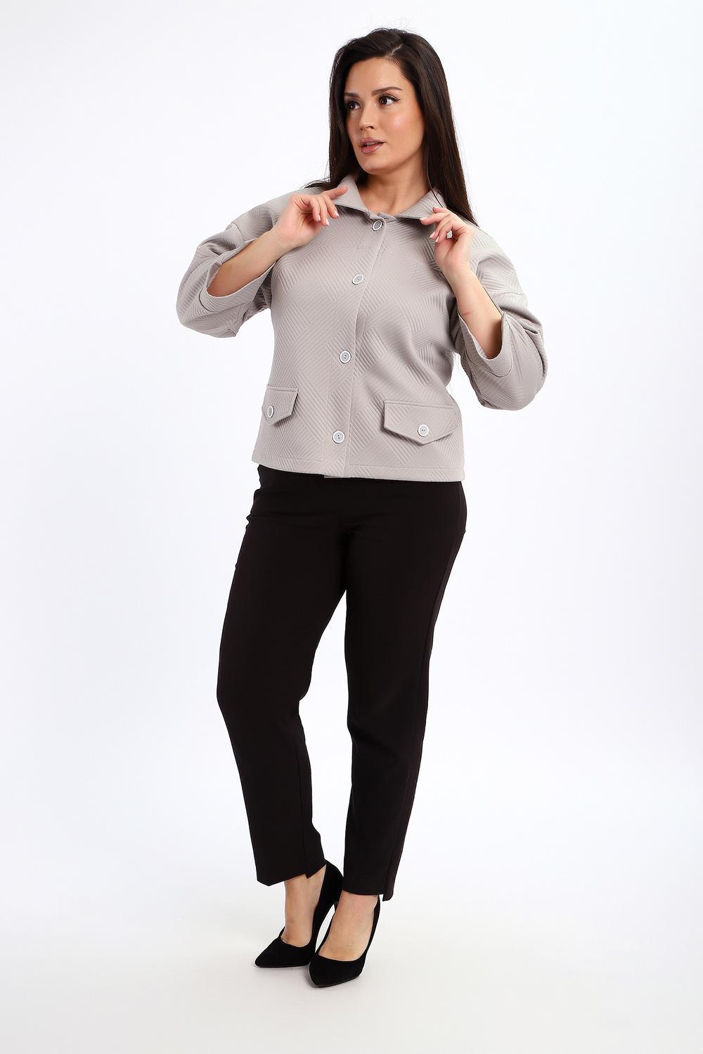 Жакет свободного прямого кроя длиной до линии бедра. Отложной воротник, рукав 3/4 удобен для дам разного роста, на рукавах манжеты с разрезом добавляют шарма изделию. Жакет декорирован фальш-клапанами с пуговицами.